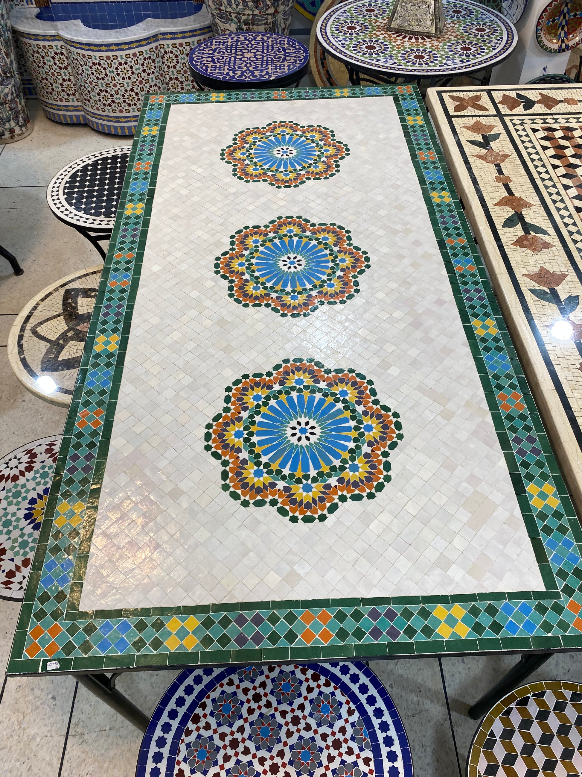 This Moroccan Zellige mosaic table features a refined ivory-toned base with three vibrant, hand-cut mosaic medallions, framed by an intricate green and multicolored border. Designed for both functionality and beauty, this table embodies Moroccan artistic heritage while offering a timeless appeal.