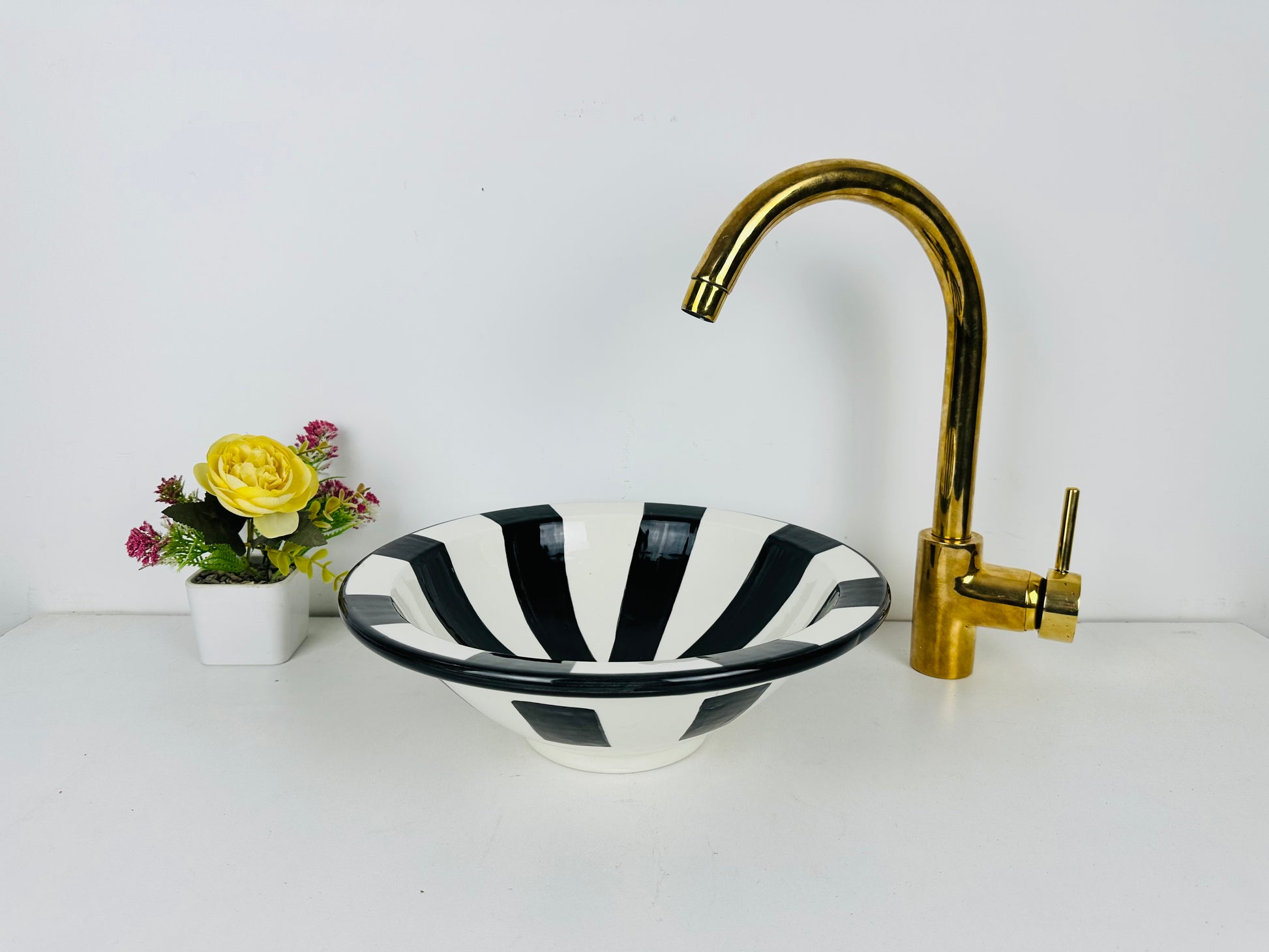 Add a bold, modern statement to your bathroom with the Monochrome Striped Vessel Sink. Featuring alternating black and white hand-painted stripes, this striking design blends timeless elegance with a contemporary edge. Perfect for minimalist, modern, or art-deco-inspired spaces, this sink elevates any décor with its sleek contrast.