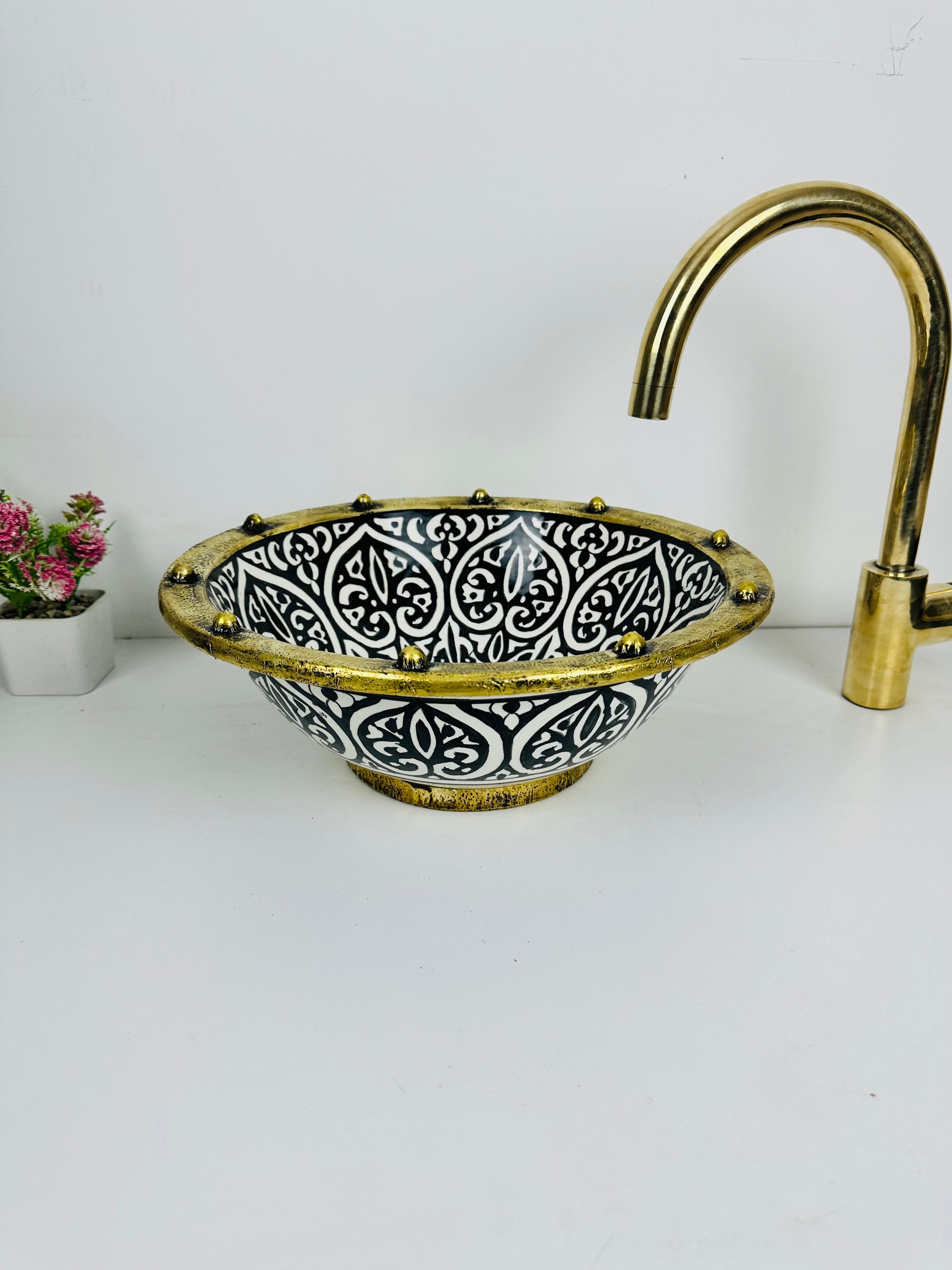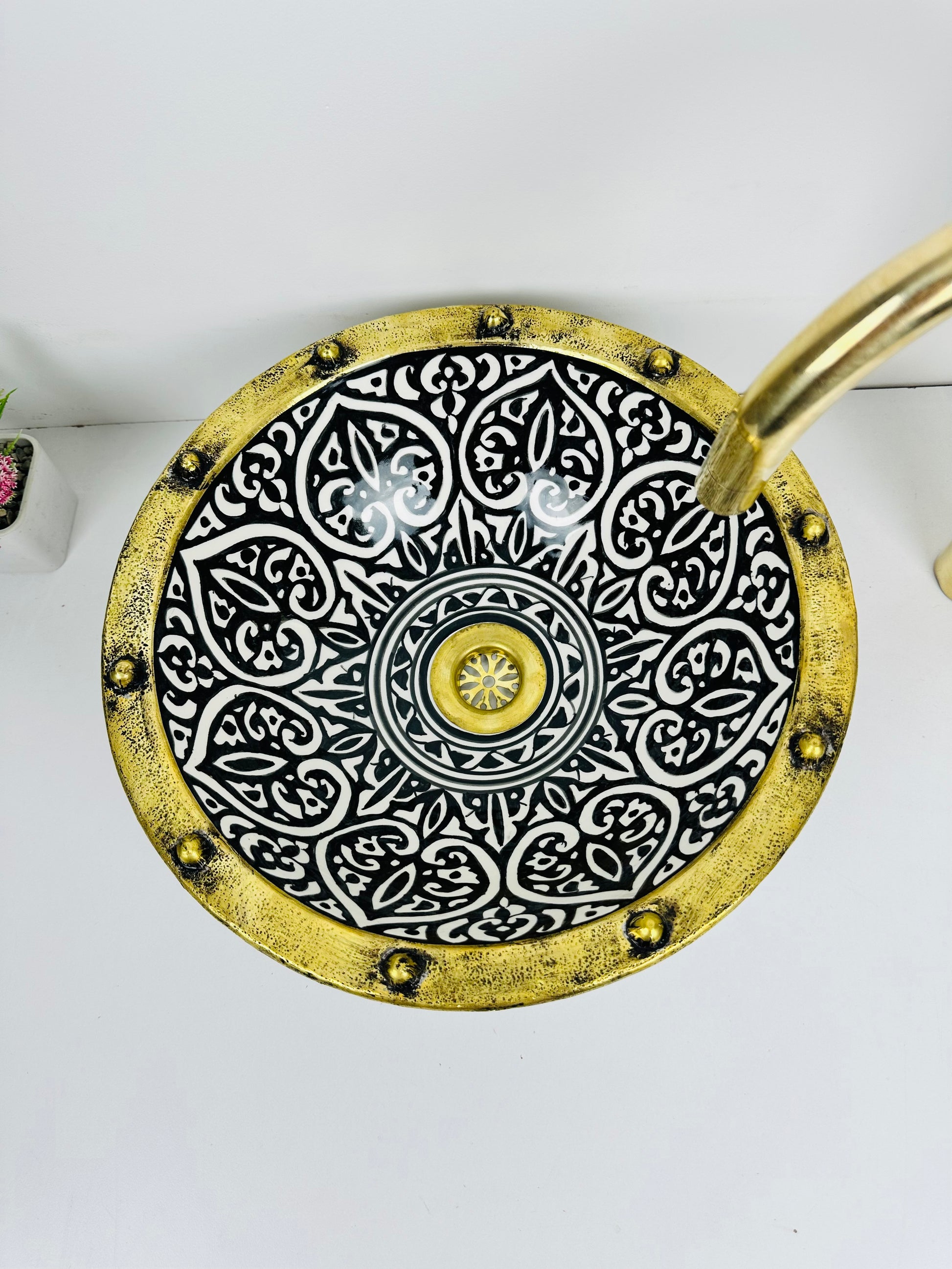 Bring a royal statement to luxury bathrooms, hotels, or spas with this intricately designed sink. The black and white hand-painted patterns draw inspiration from traditional motifs, while the bold brass rim elevates its elegance. This eye-catching centerpiece offers both style and durability, perfect for refined interiors.