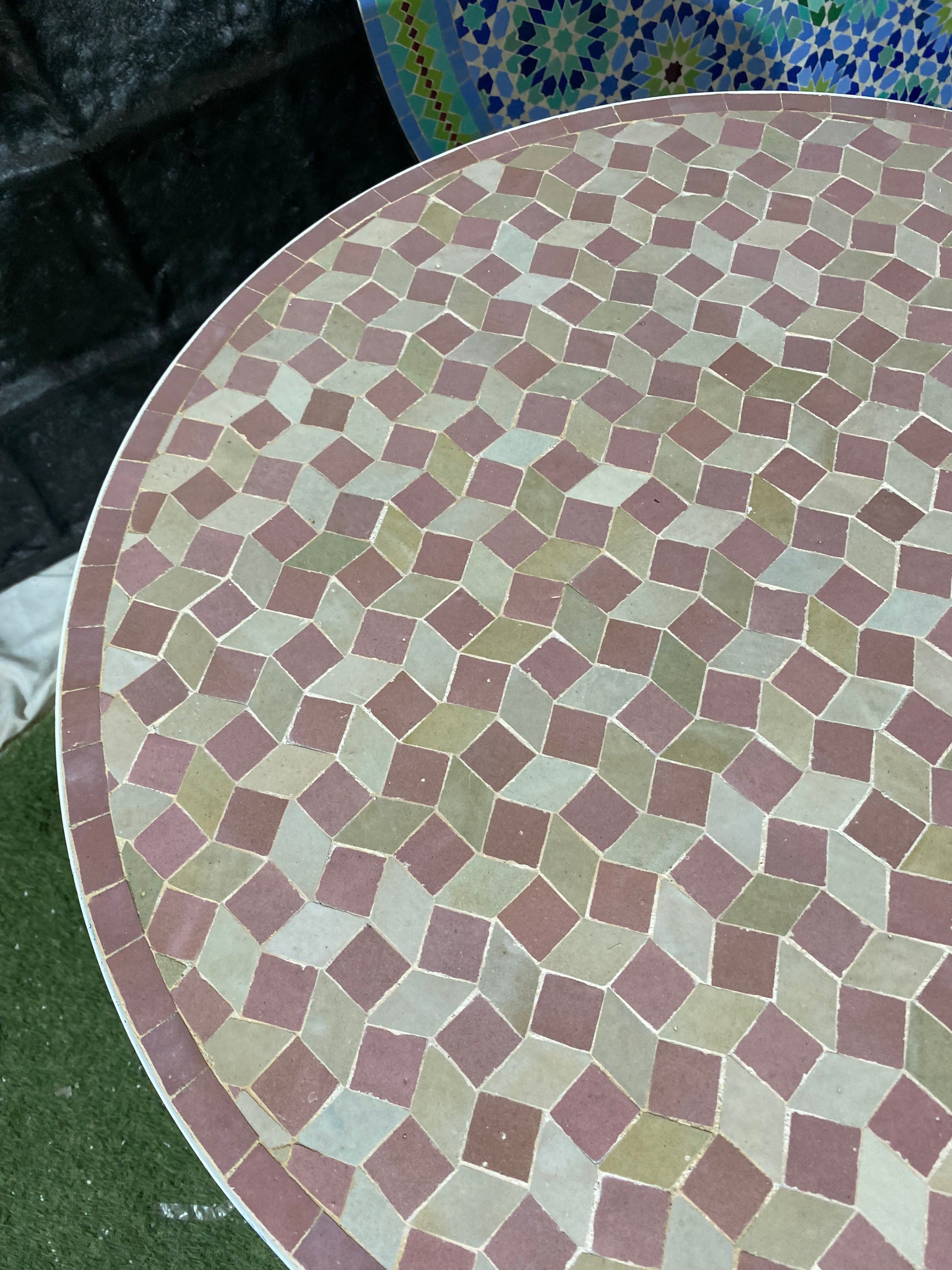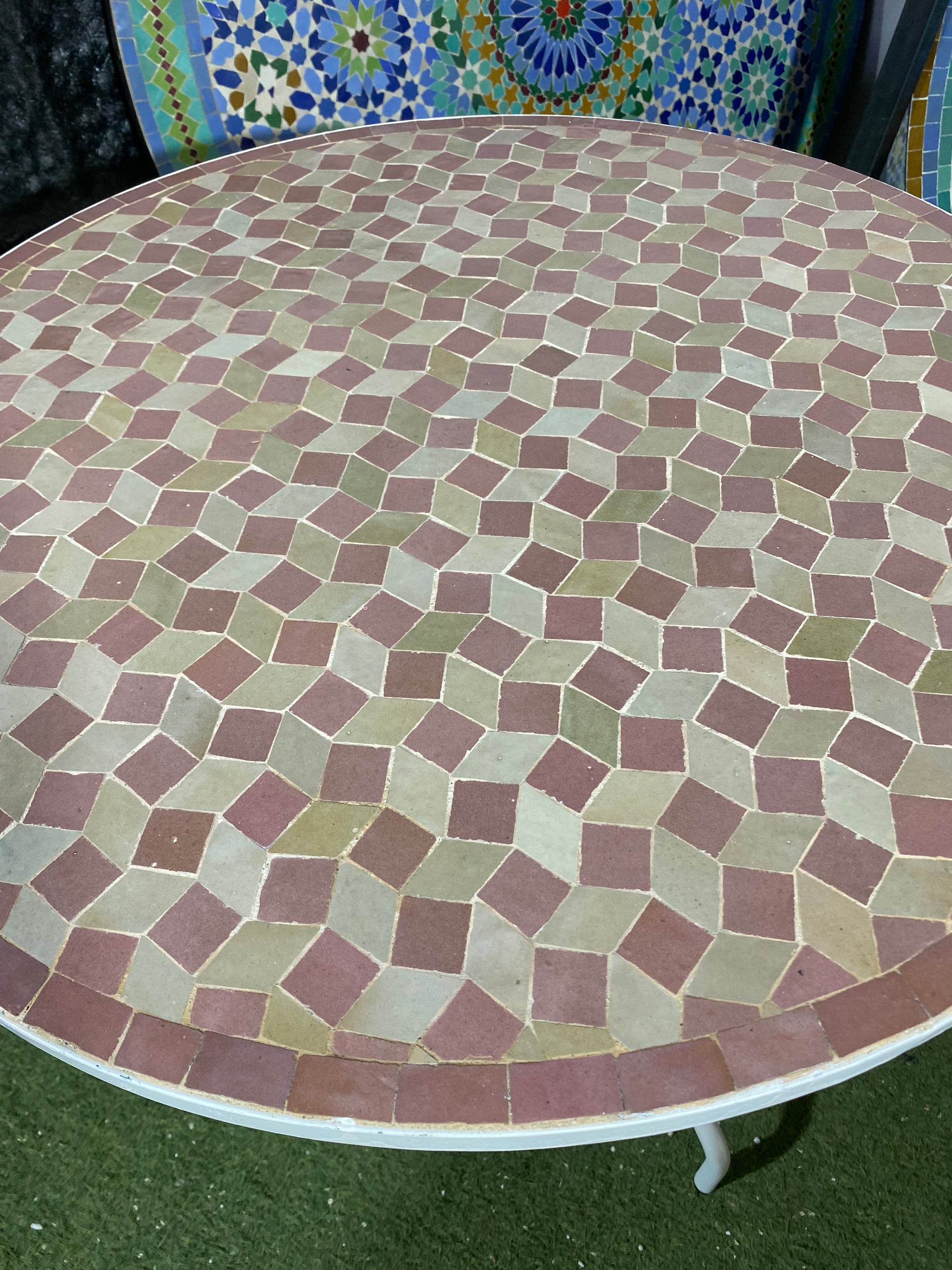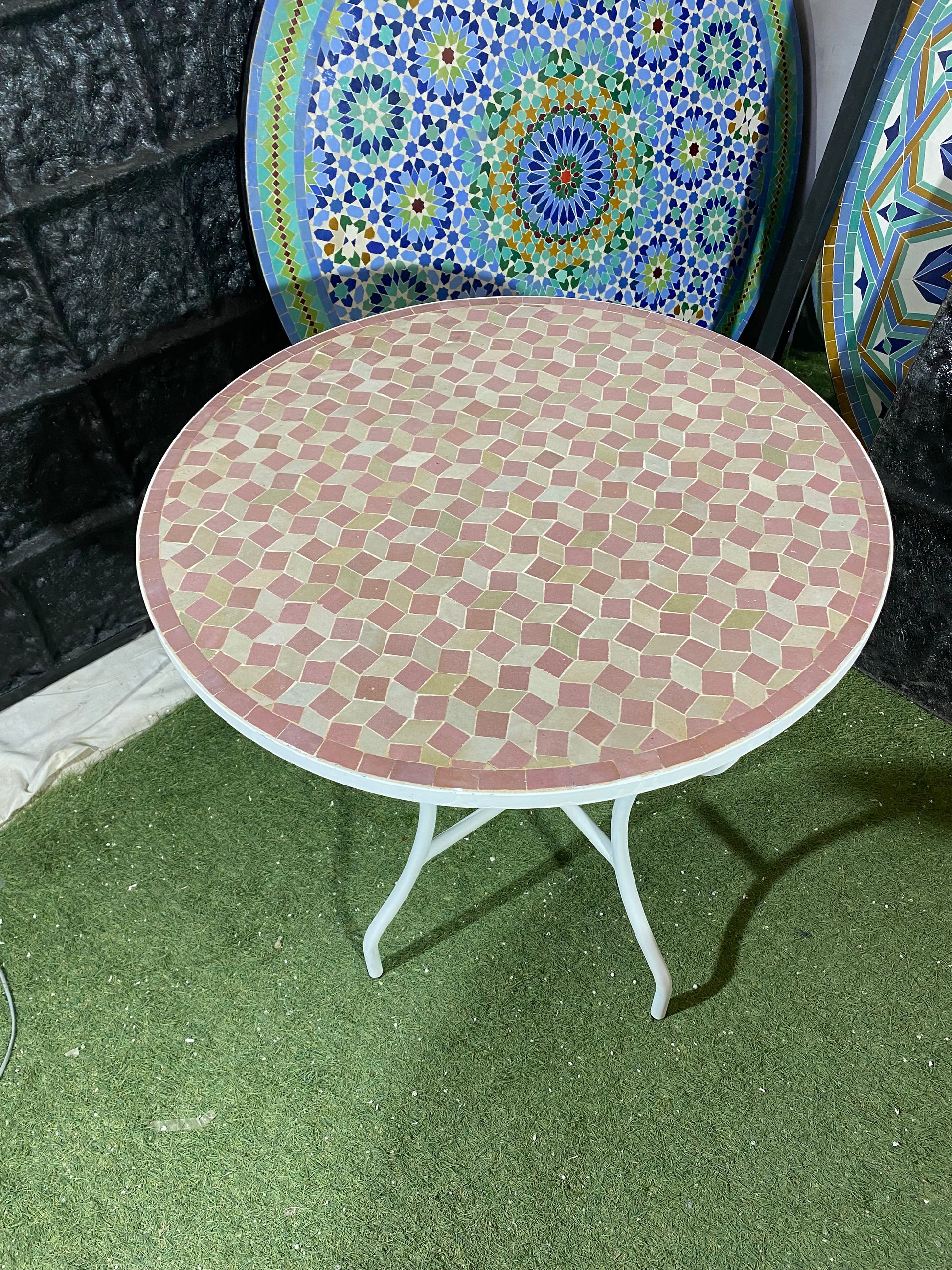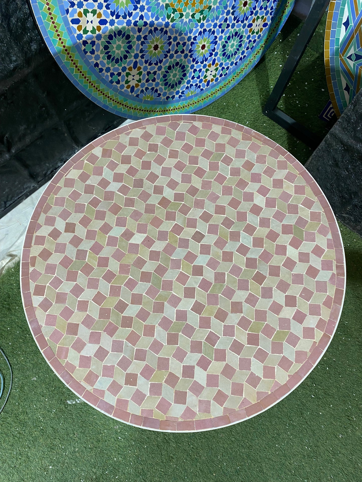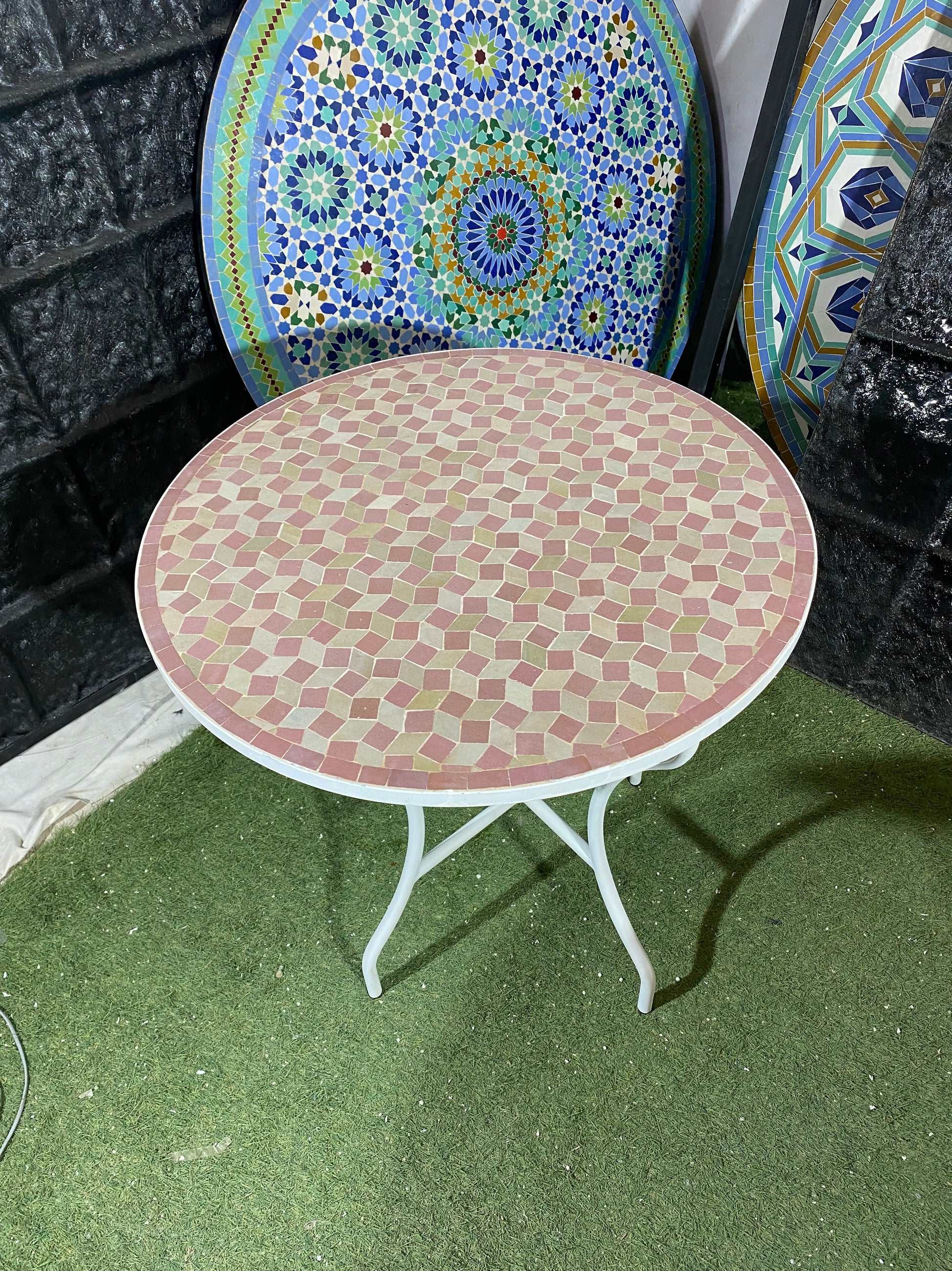 Elevate your space with the mesmerizing beauty of this handcrafted mosaic table, featuring an intricate 3D geometric pattern in soft blush, beige, and ivory tones. The delicate interplay of colors creates a captivating illusion of depth, making it a striking yet subtle centerpiece for any setting. The elegant white iron base enhances its refined aesthetic while ensuring durability, perfect for both indoor and outdoor use.