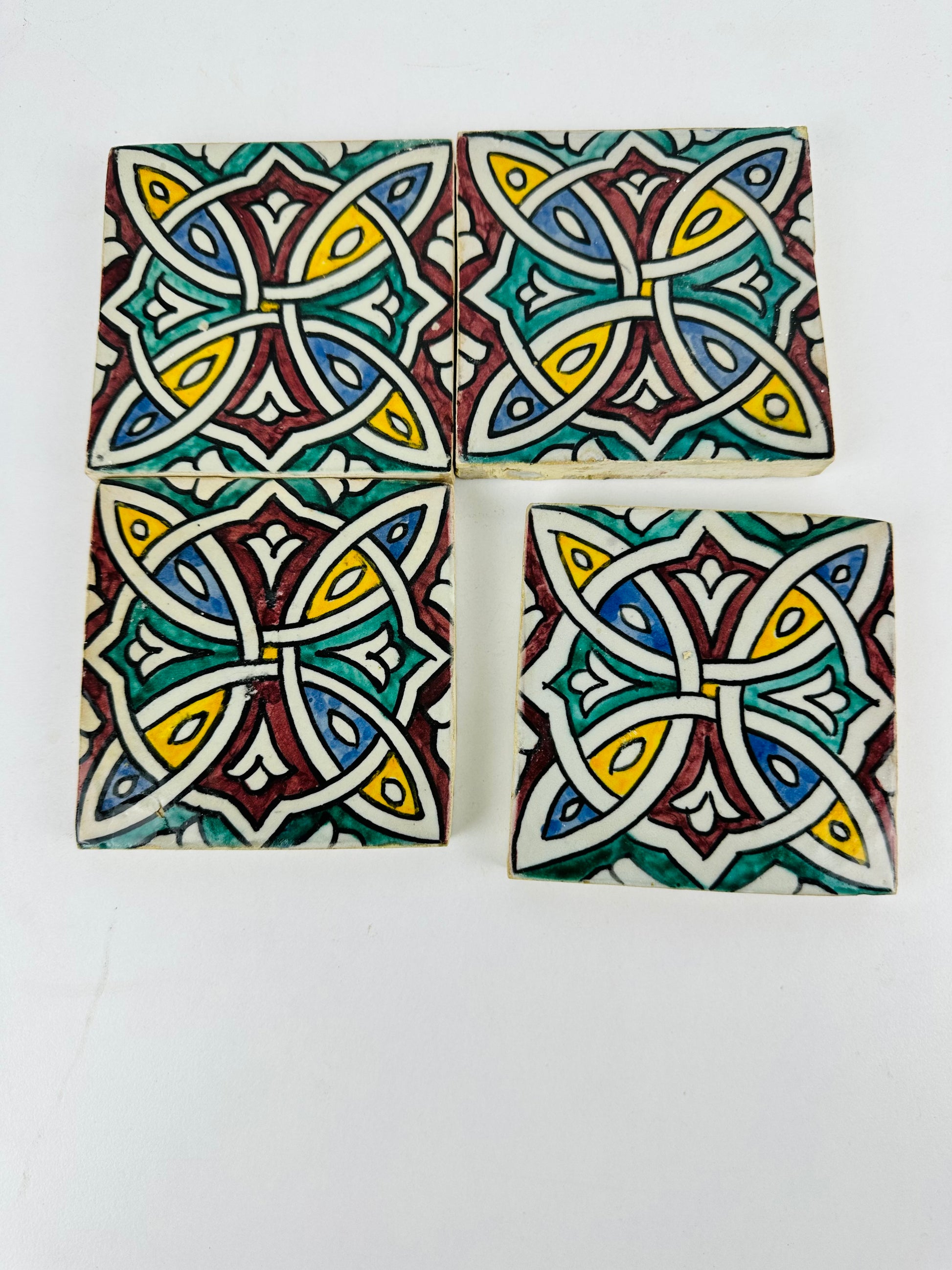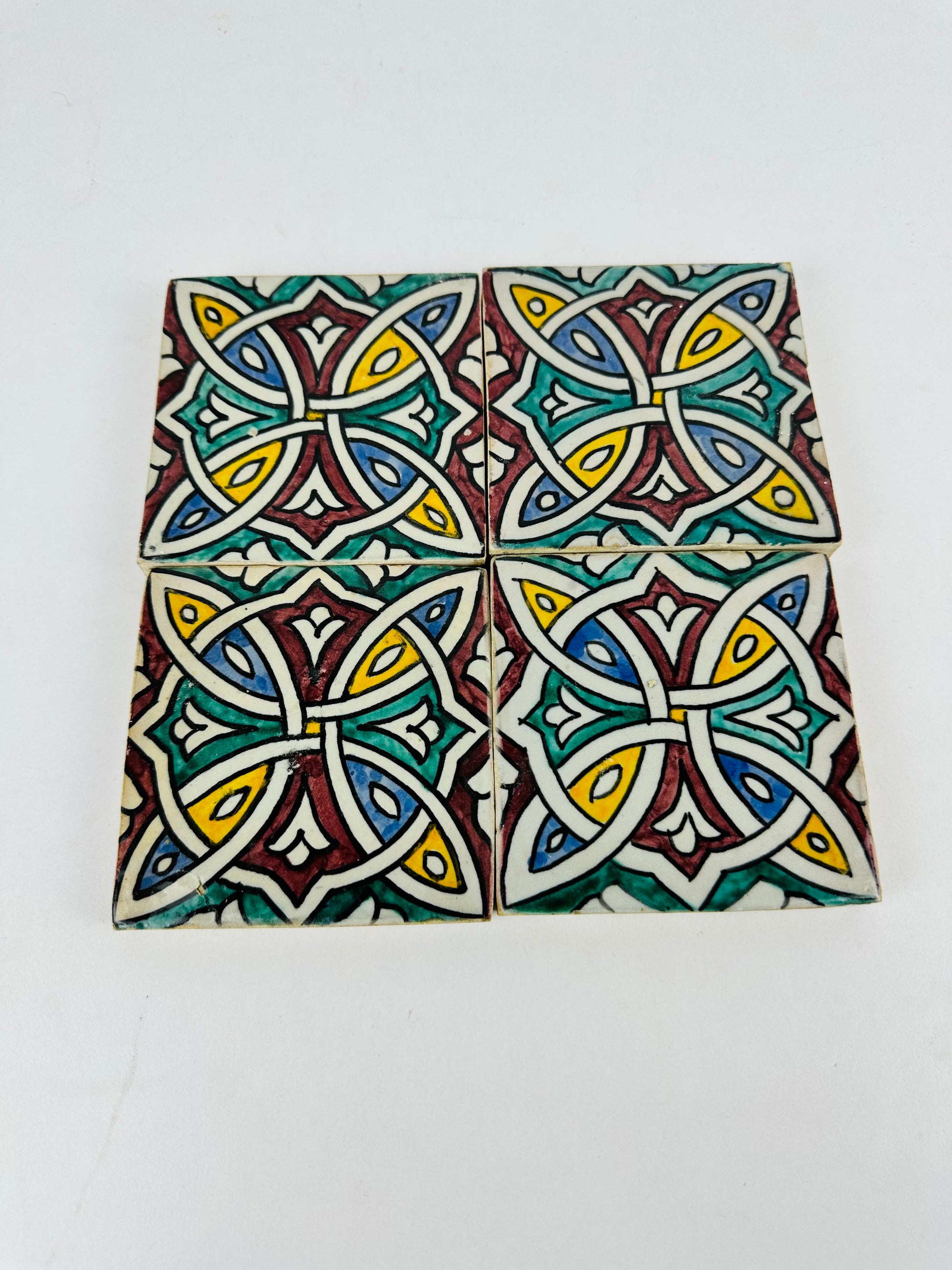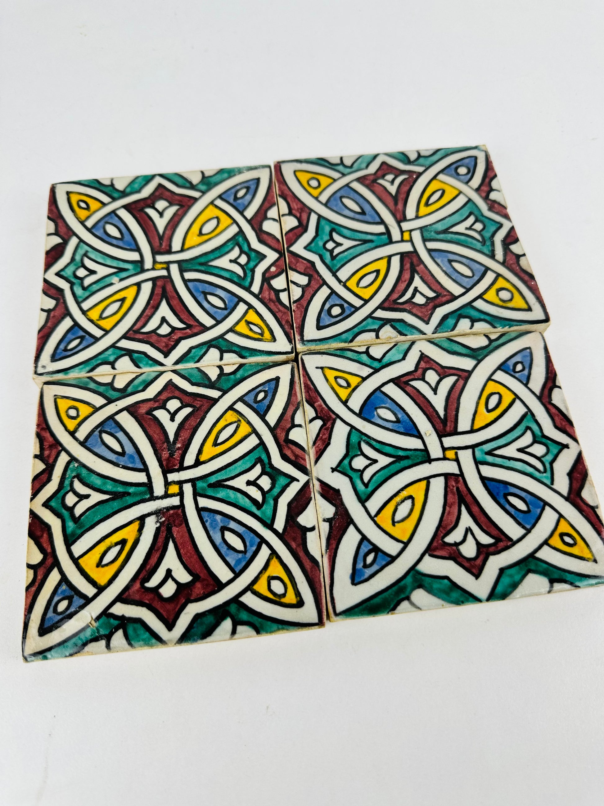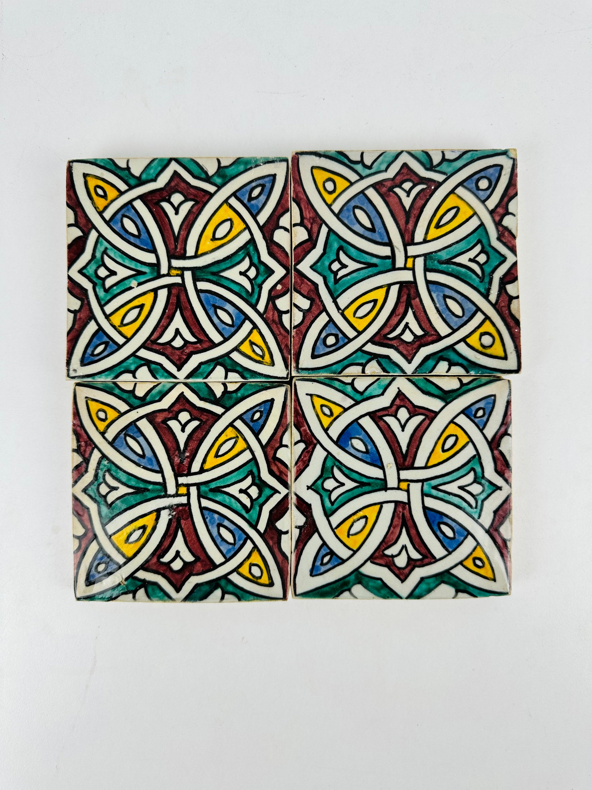The Alhambra Bloom Moroccan Zellige Tiles are a celebration of Moorish floral geometry, reminiscent of the intricate patterns found in the historic Alhambra Palace. These hand-painted tiles feature a mesmerizing interwoven floral motif in shades of blue, yellow, green, and deep burgundy, forming a stunning symmetrical design that adds warmth and elegance to any space.