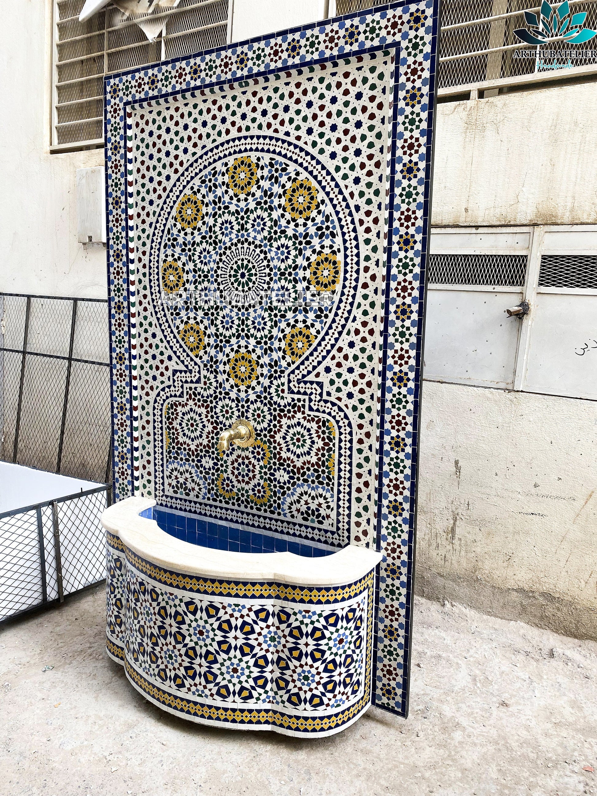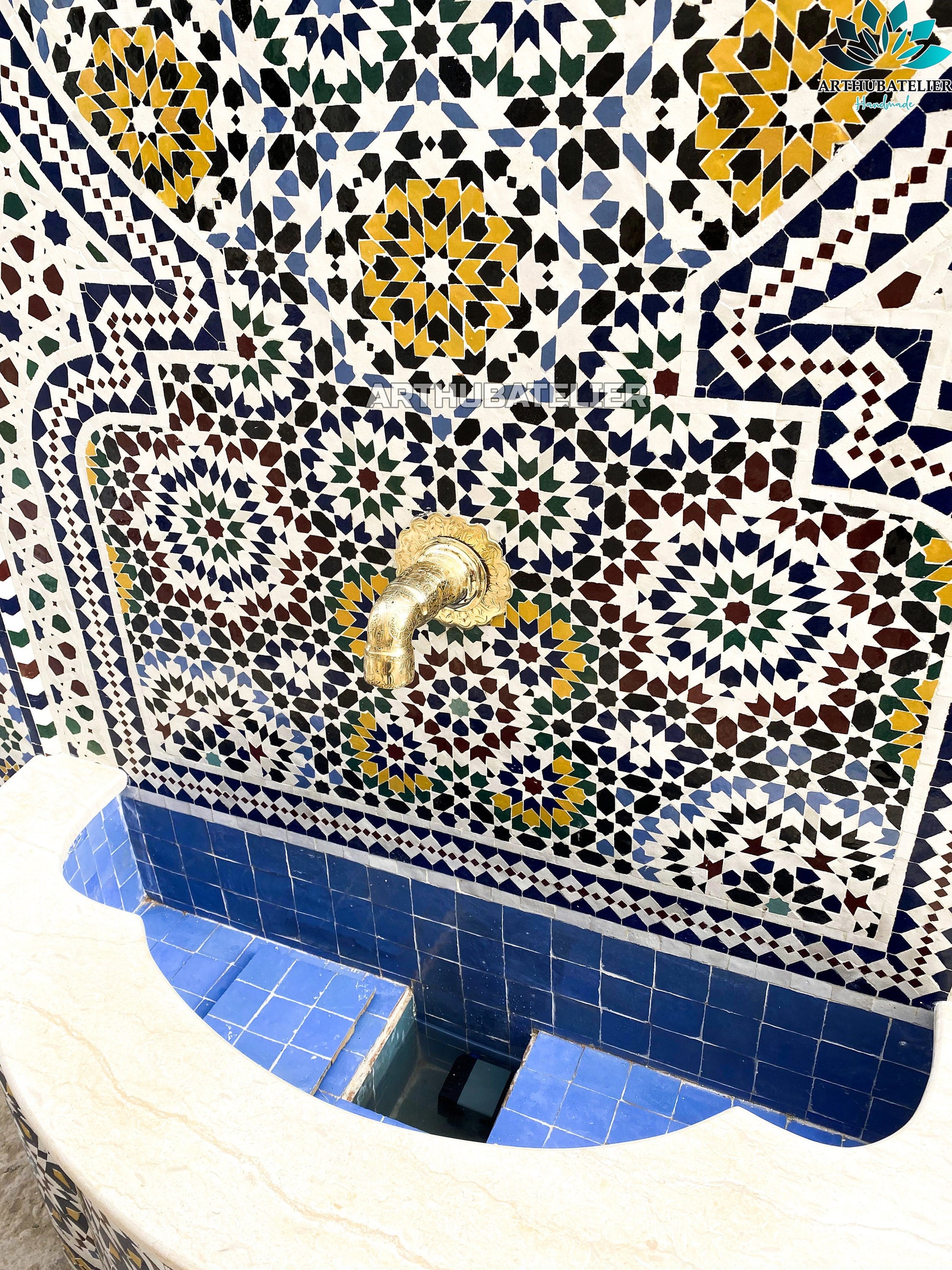 Indulge in the grandeur of Moroccan craftsmanship with this exquisite mosaic fountain, meticulously handcrafted using hand-cut Zellige tiles. The intricate radial patterns evoke a sense of harmony and sophistication, making it a stunning statement piece for any setting.
