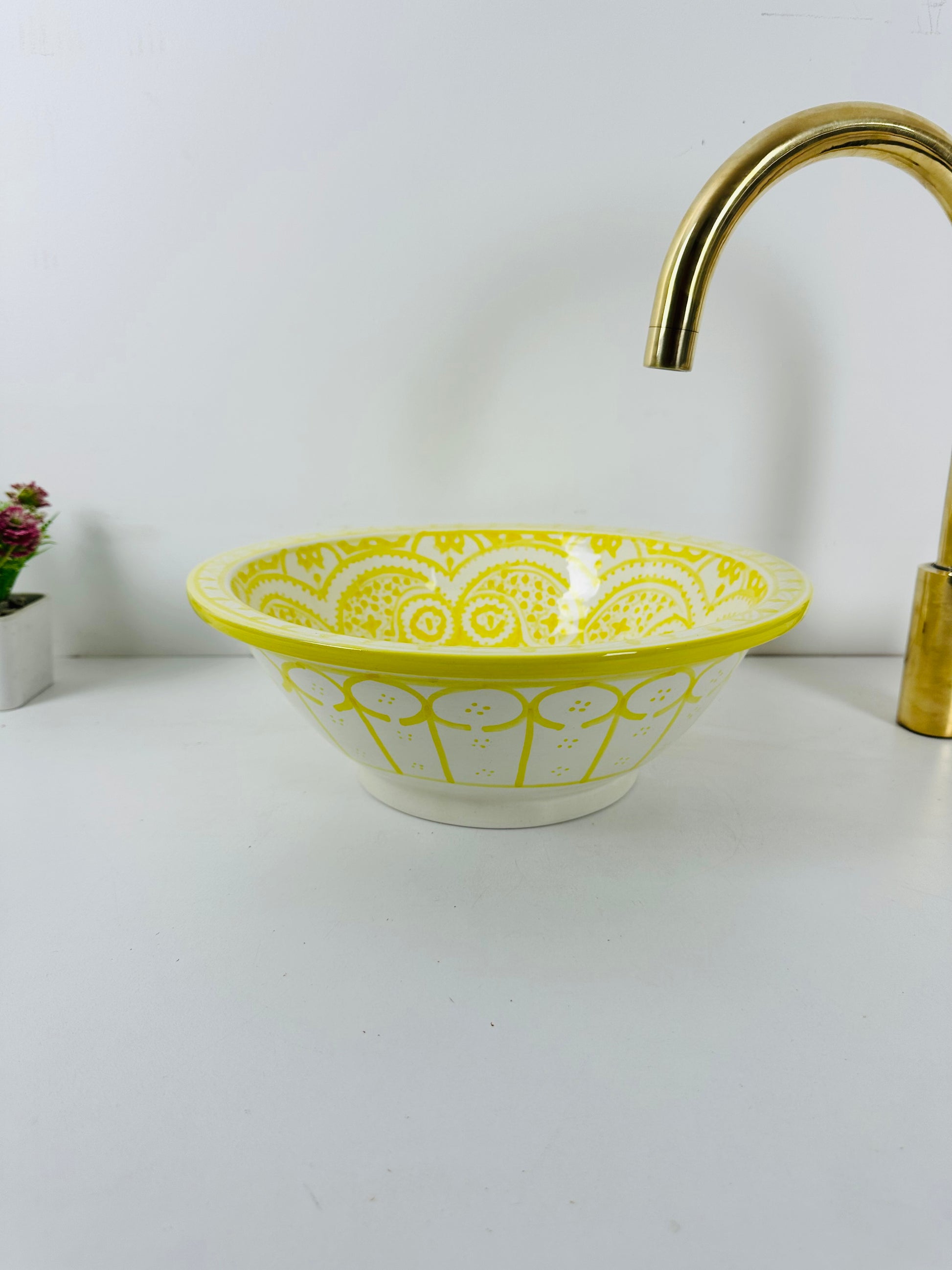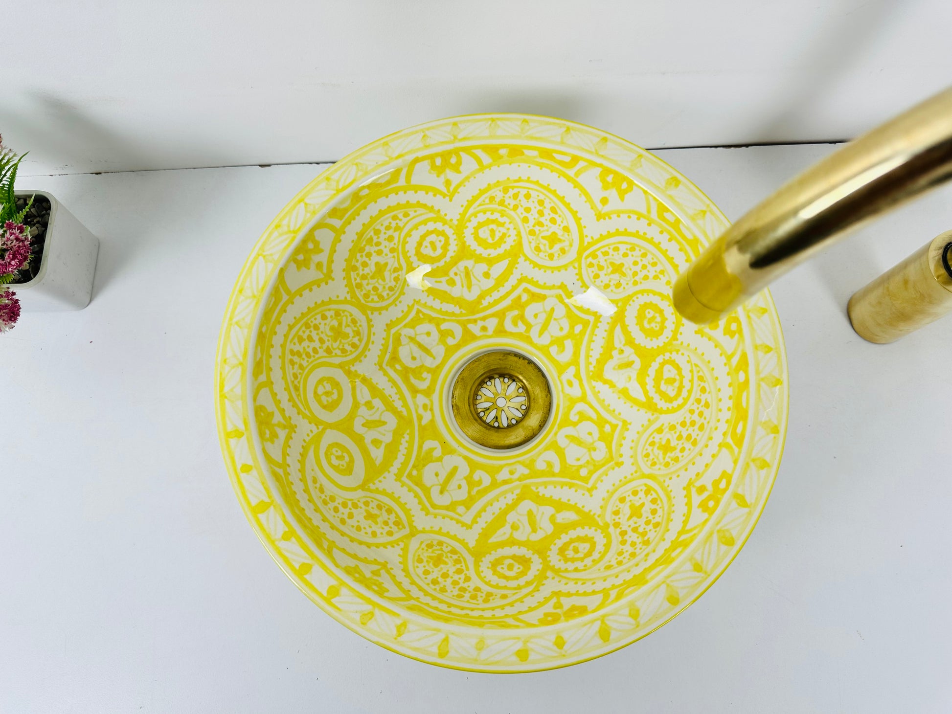 Brighten your bathroom or hotel space with this radiant sunburst yellow ceramic vessel sink, adorned with hand-painted intricate patterns that bring warmth and vibrancy. Its luxurious brass-finished drain adds an elegant contrast, making it a statement piece in any setting.