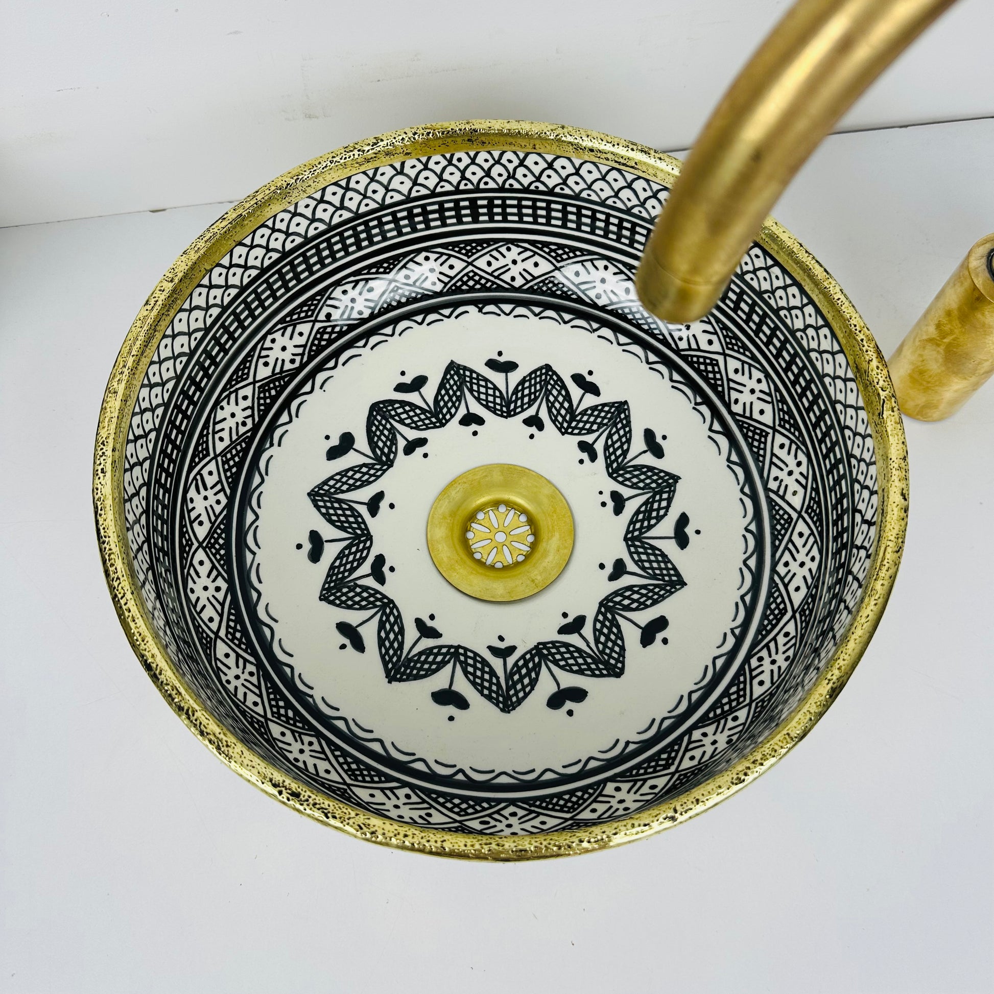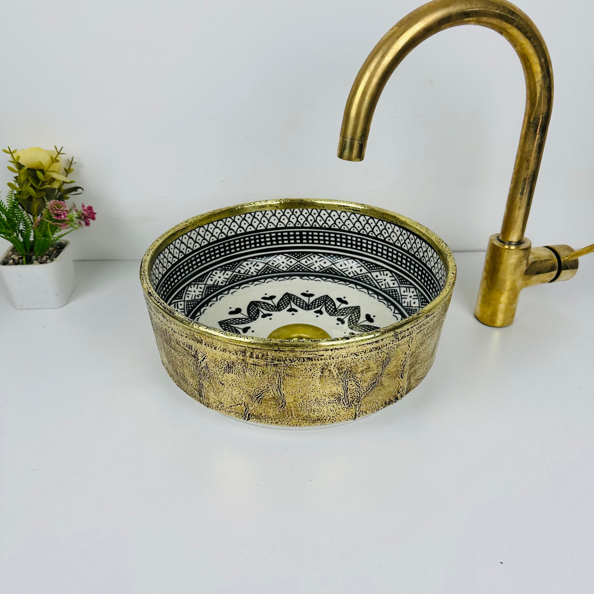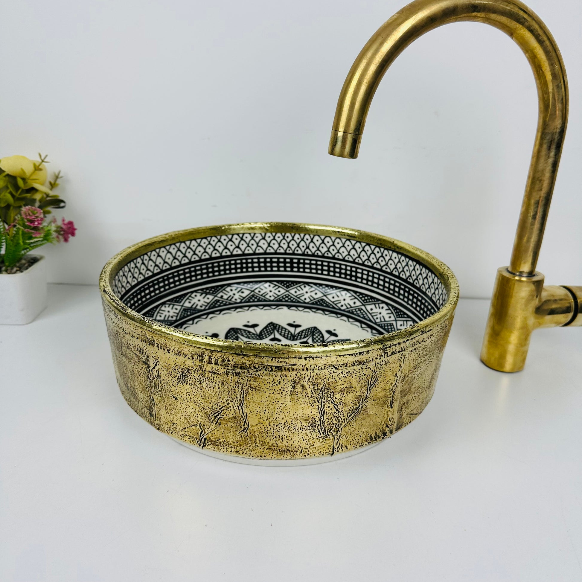 Luxury in Every Detail: Black and white Ceramic Sink with Goldish brass Embellishments