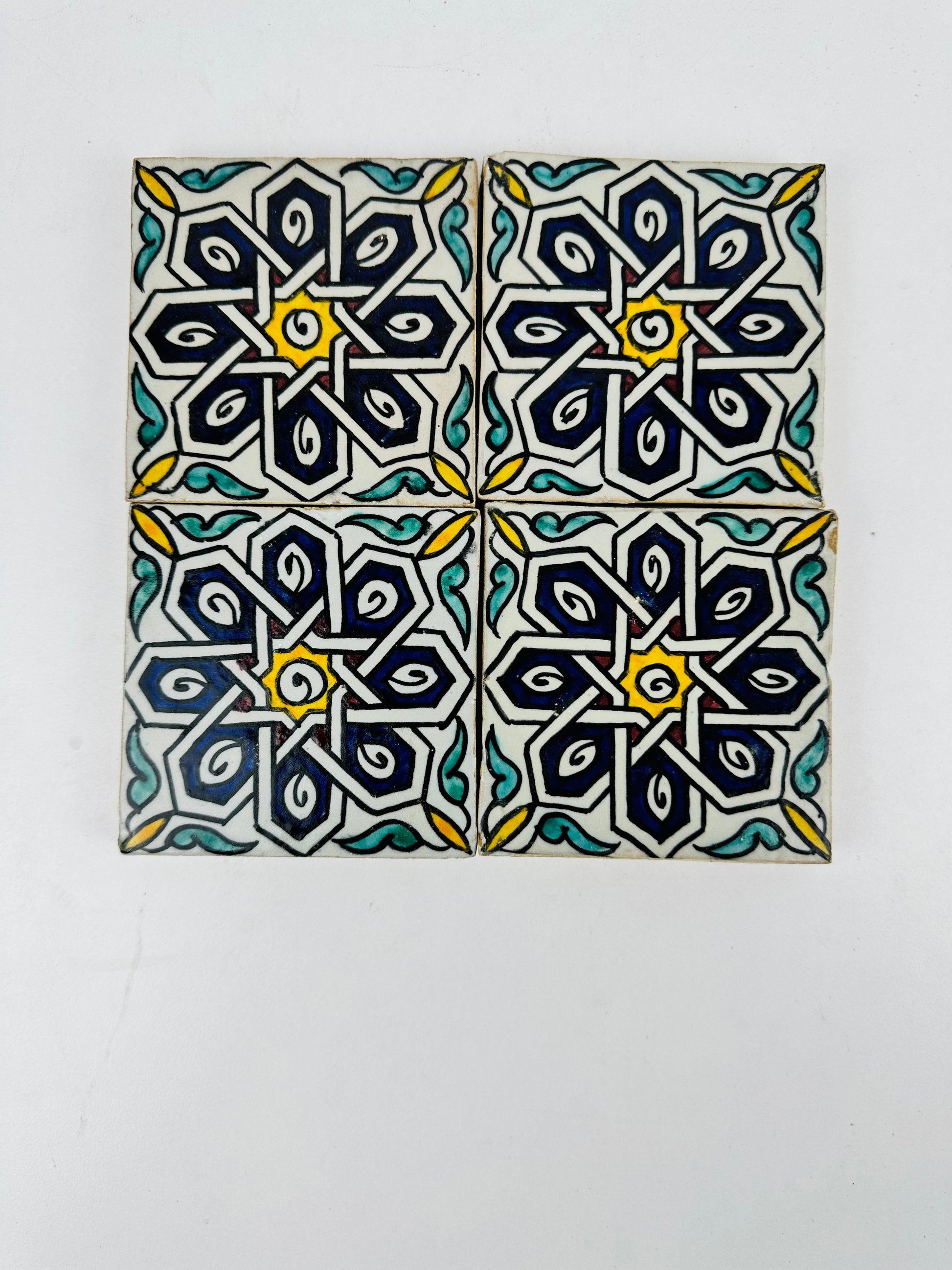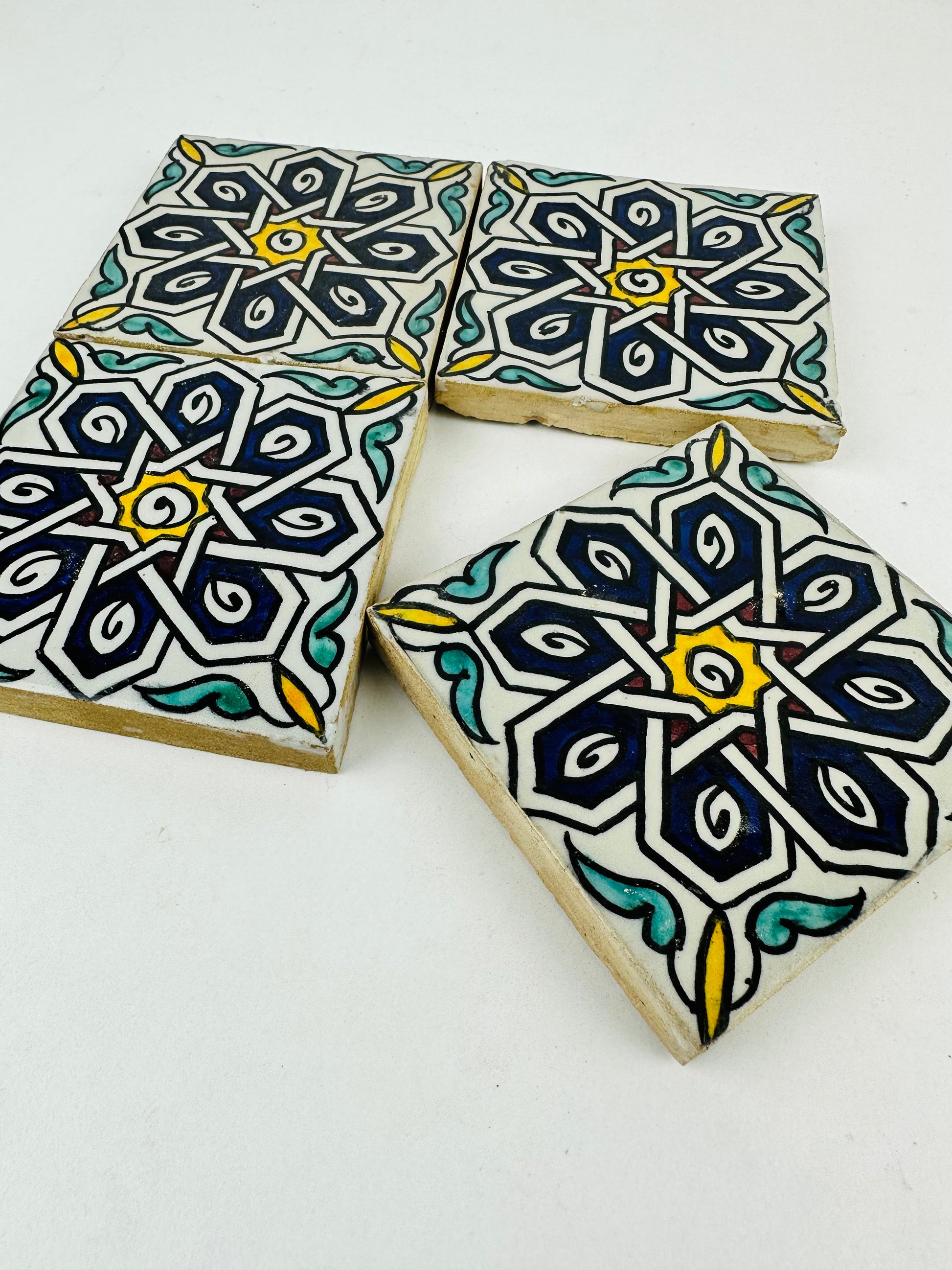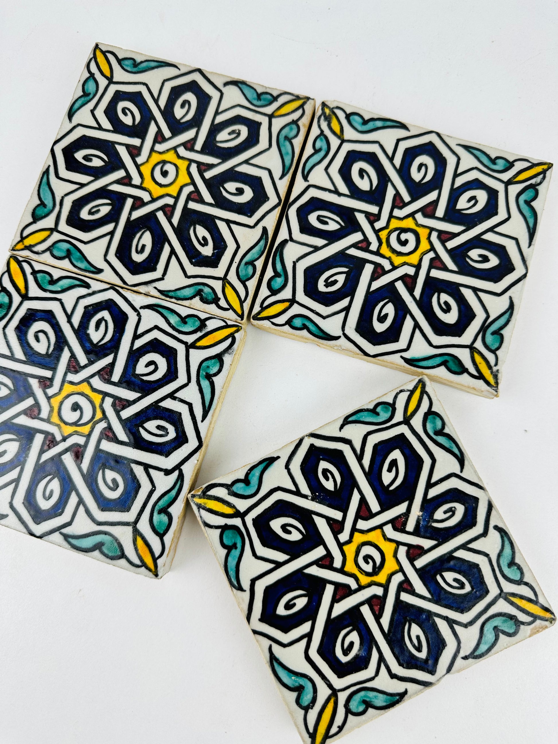 The Eternal Star Moroccan Zellige Tiles feature an intricate geometric starburst pattern, hand-painted in bold navy, golden yellow, and delicate teal accents. Inspired by Moroccan architecture and Islamic artistry, this mesmerizing tile design embodies symmetry and balance, creating a stunning visual impact. Each tile is handmade and hand-painted, ensuring an authentic and unique touch to any interior or exterior space.