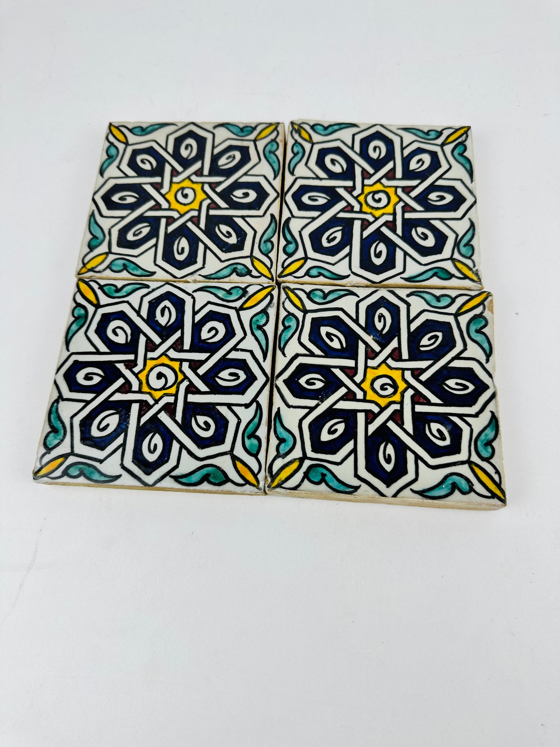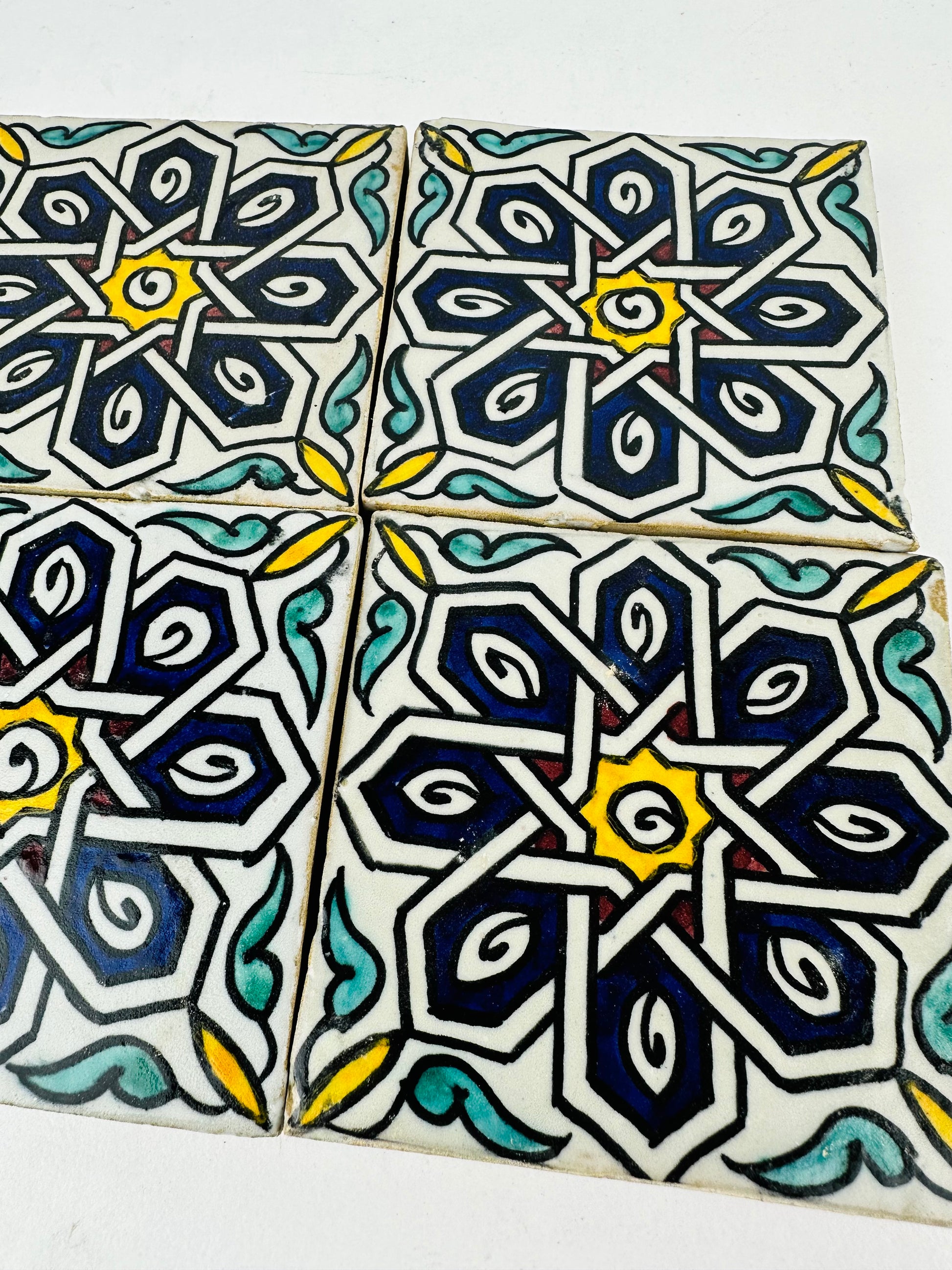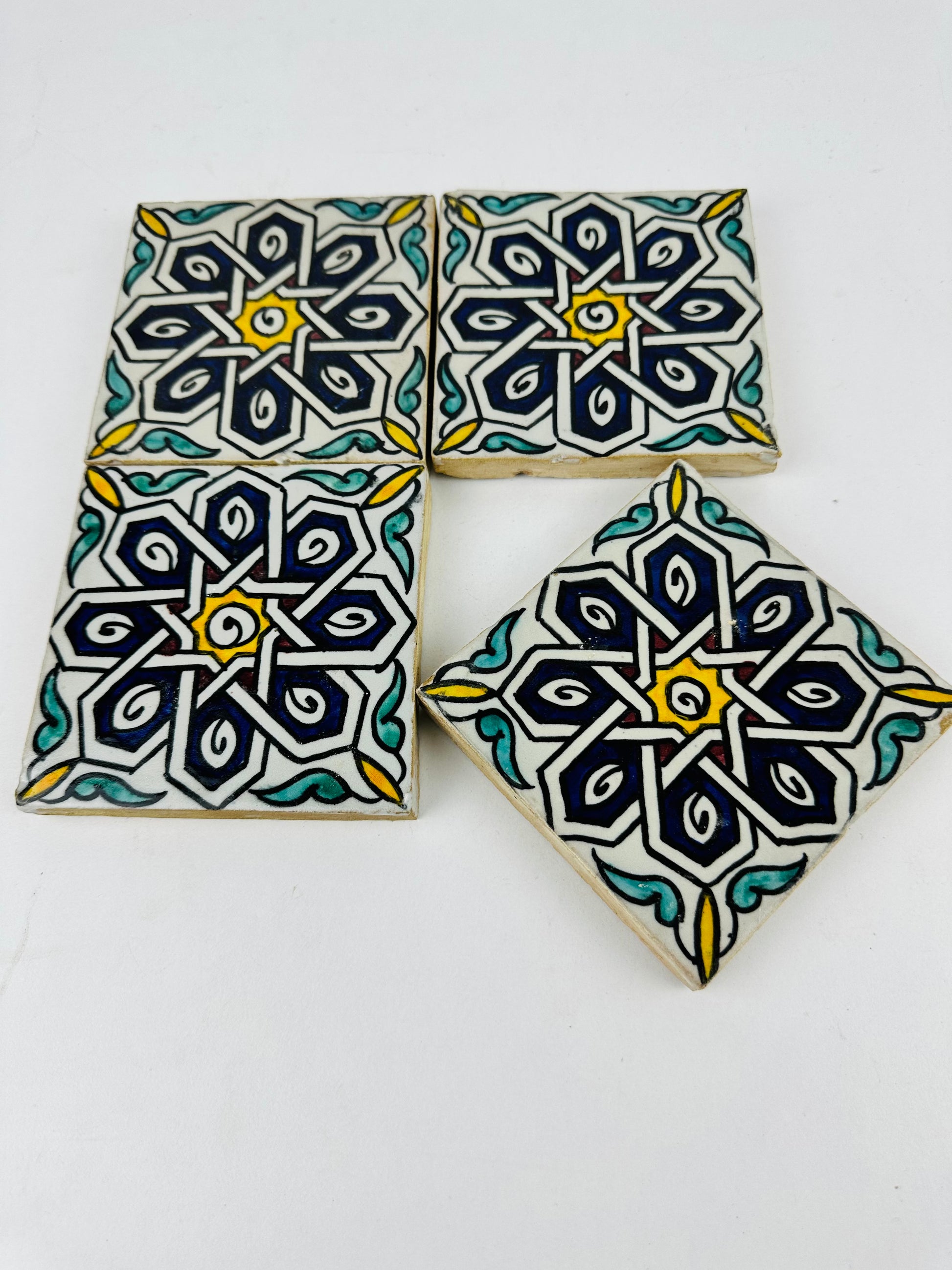The Eternal Star Moroccan Zellige Tiles feature an intricate geometric starburst pattern, hand-painted in bold navy, golden yellow, and delicate teal accents. Inspired by Moroccan architecture and Islamic artistry, this mesmerizing tile design embodies symmetry and balance, creating a stunning visual impact. Each tile is handmade and hand-painted, ensuring an authentic and unique touch to any interior or exterior space.