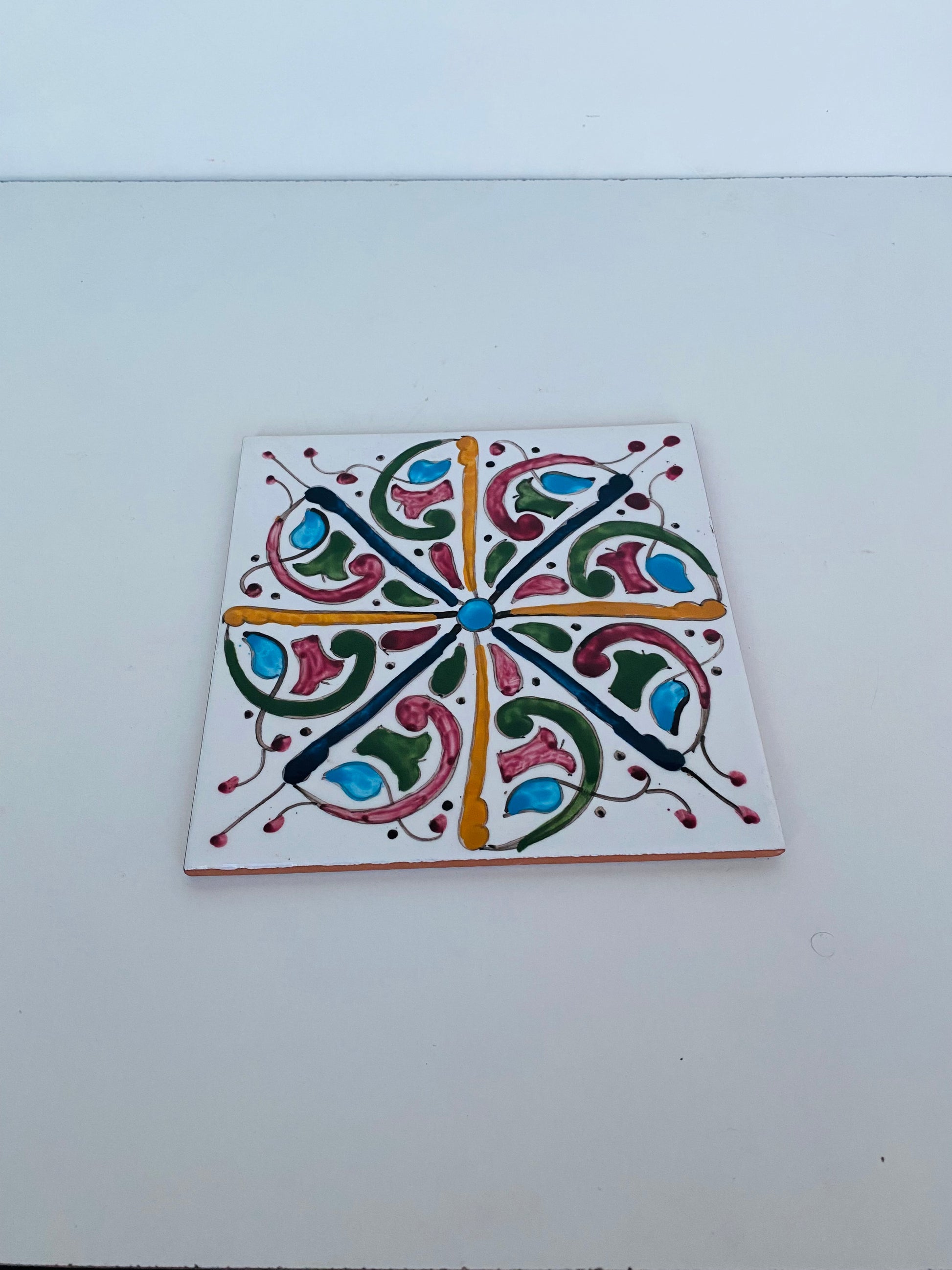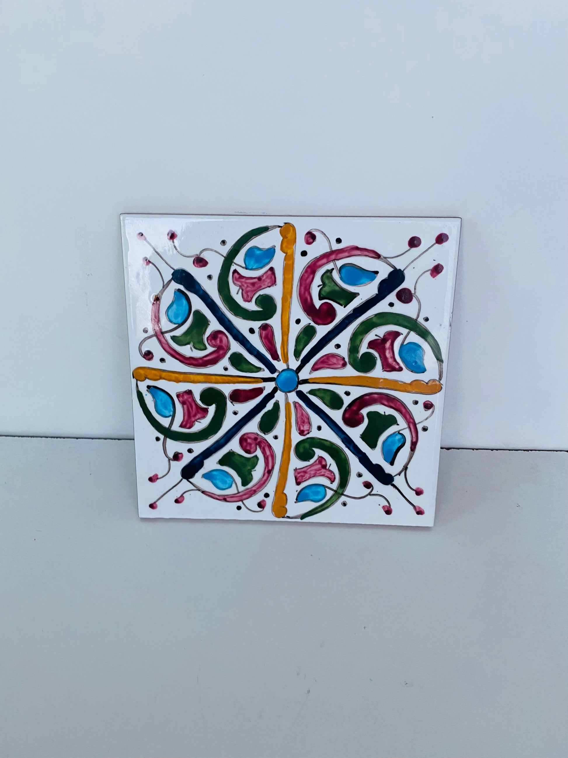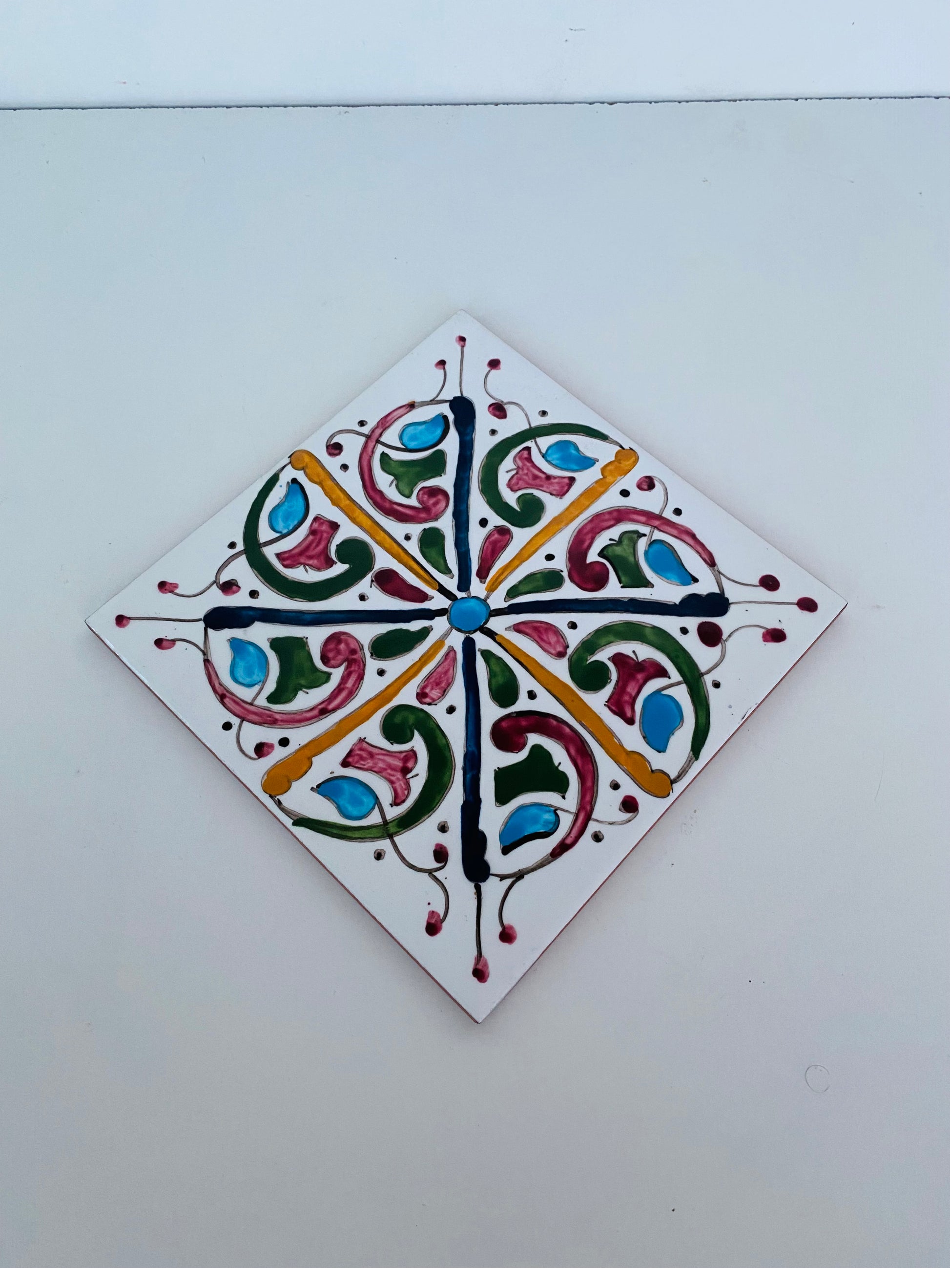 The Floral Radiance Moroccan Zellige Tile is a delicate masterpiece that captures the essence of Moroccan craftsmanship with its ornate floral-inspired design. Featuring an elegant eight-section radial pattern, this tile is adorned with hand-painted swirling vines, petals, and blossoms in rich shades of blue, green, rose pink, and gold. The subtle cream-white background enhances the intricate detailing, creating a sophisticated and timeless look. Each tile is handmade and hand-painted, ensuring a one-of-a-kind artistic expression for any interior or exterior space.