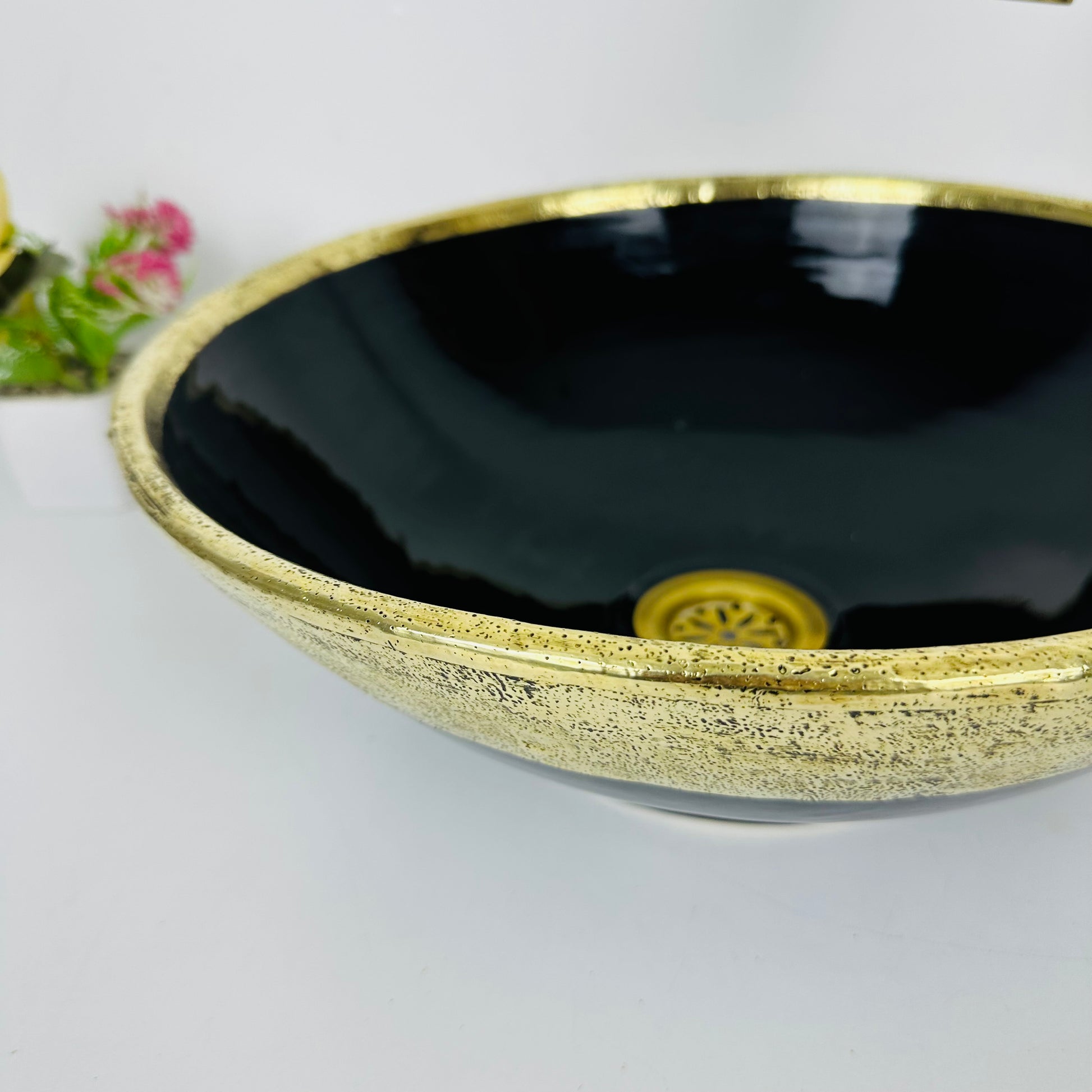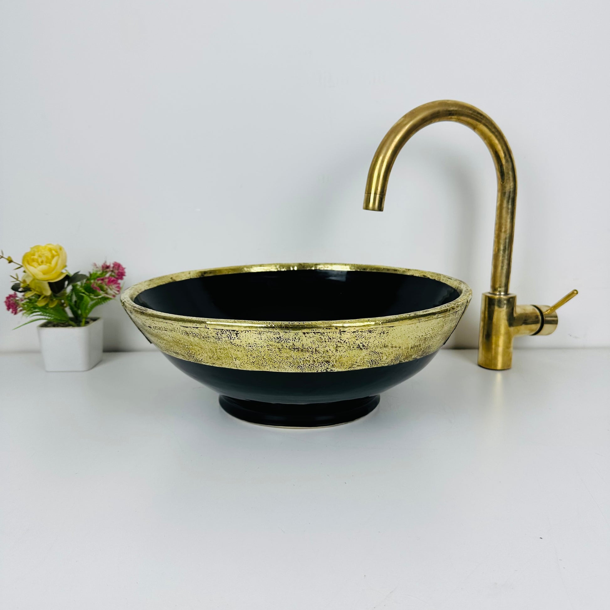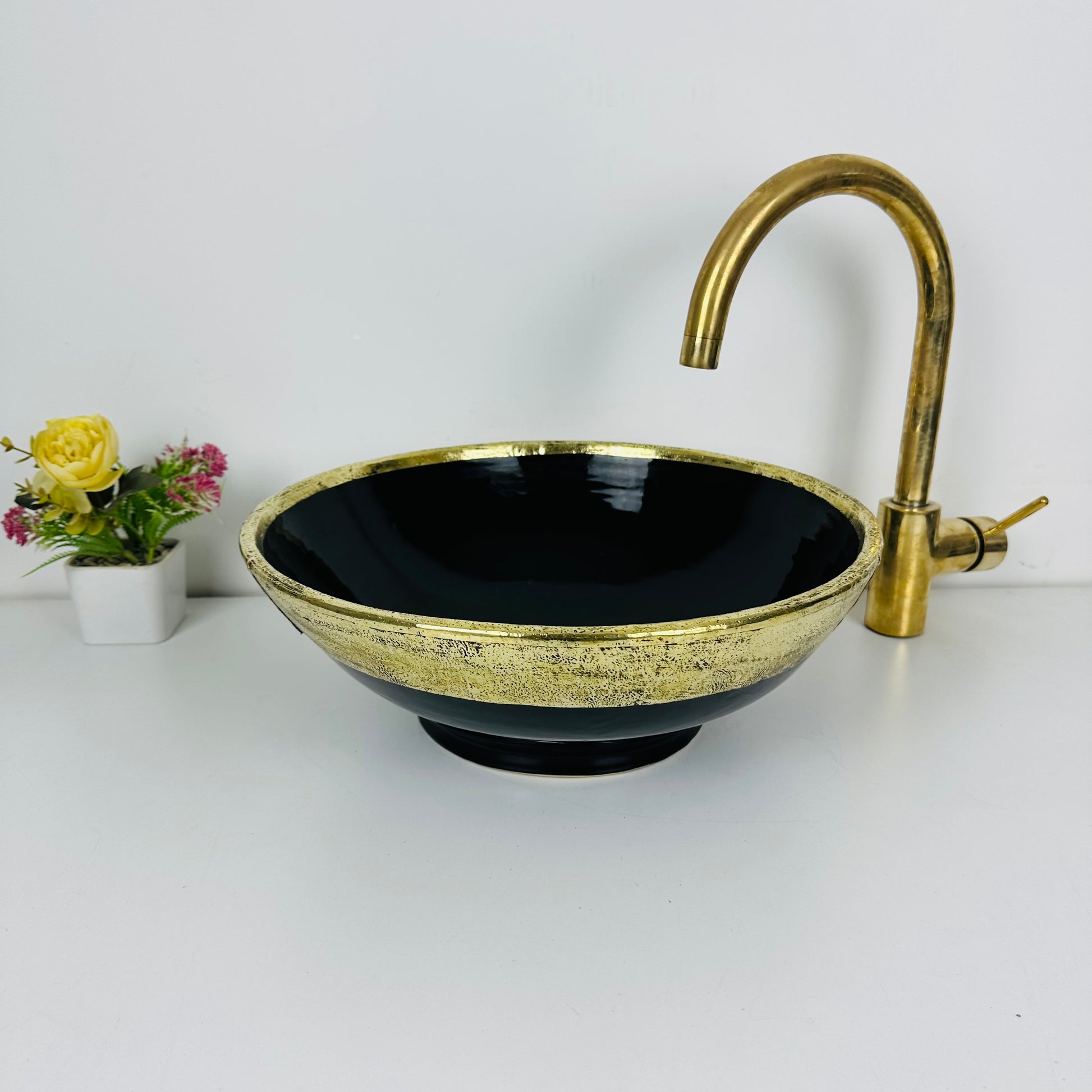 Round Handcrafted Ceramic Sink - Midnight Black with Gold Brass