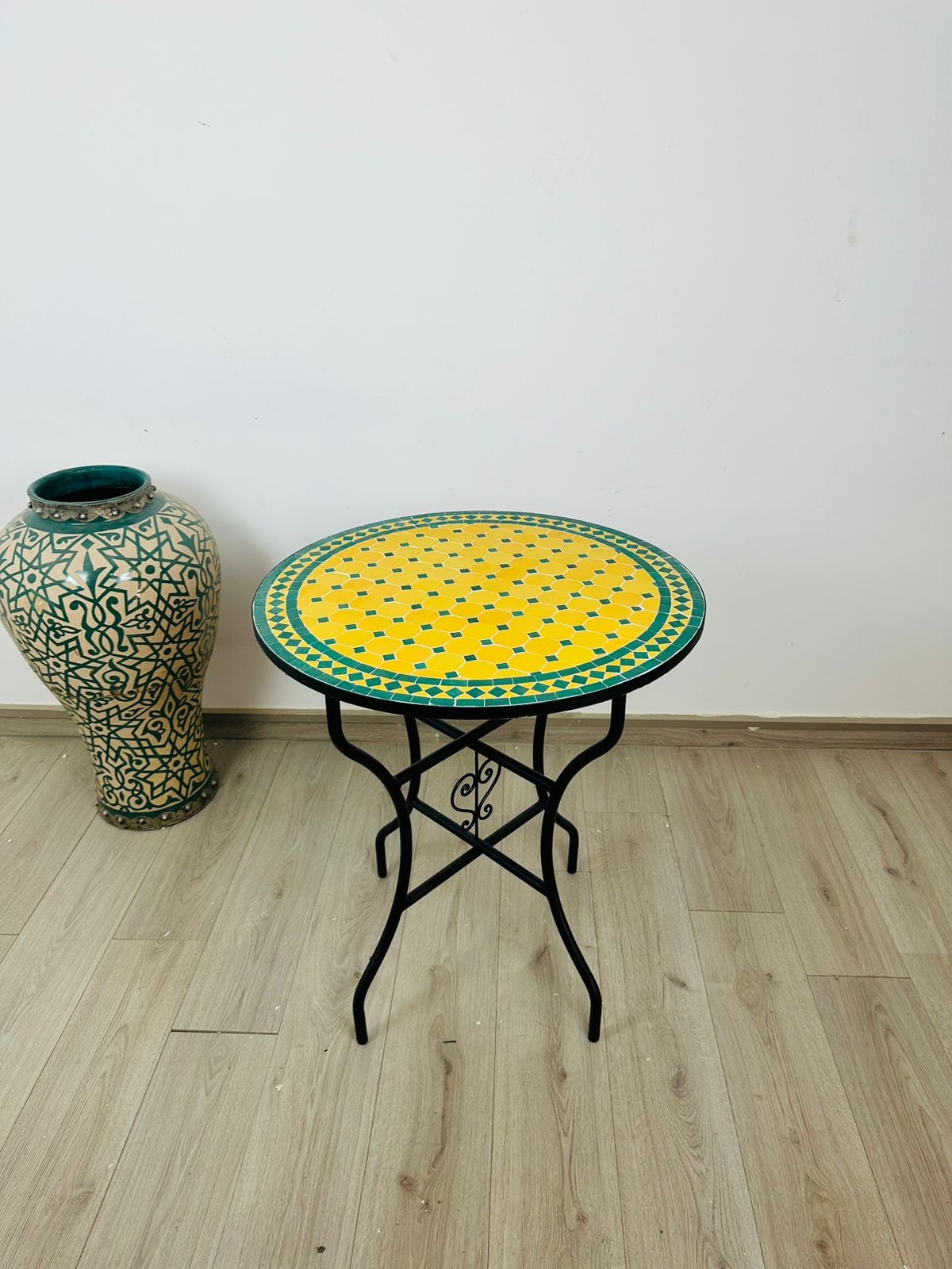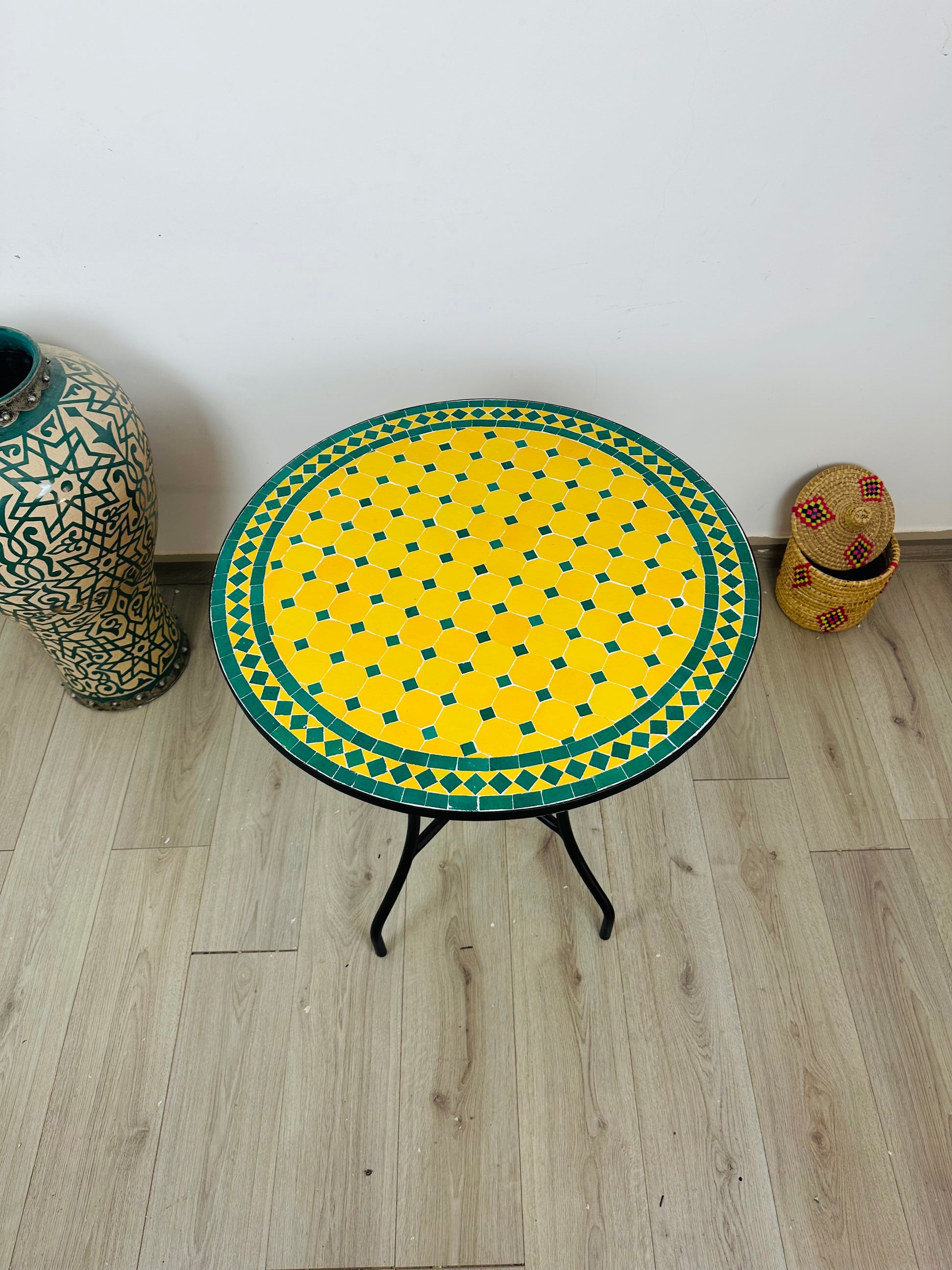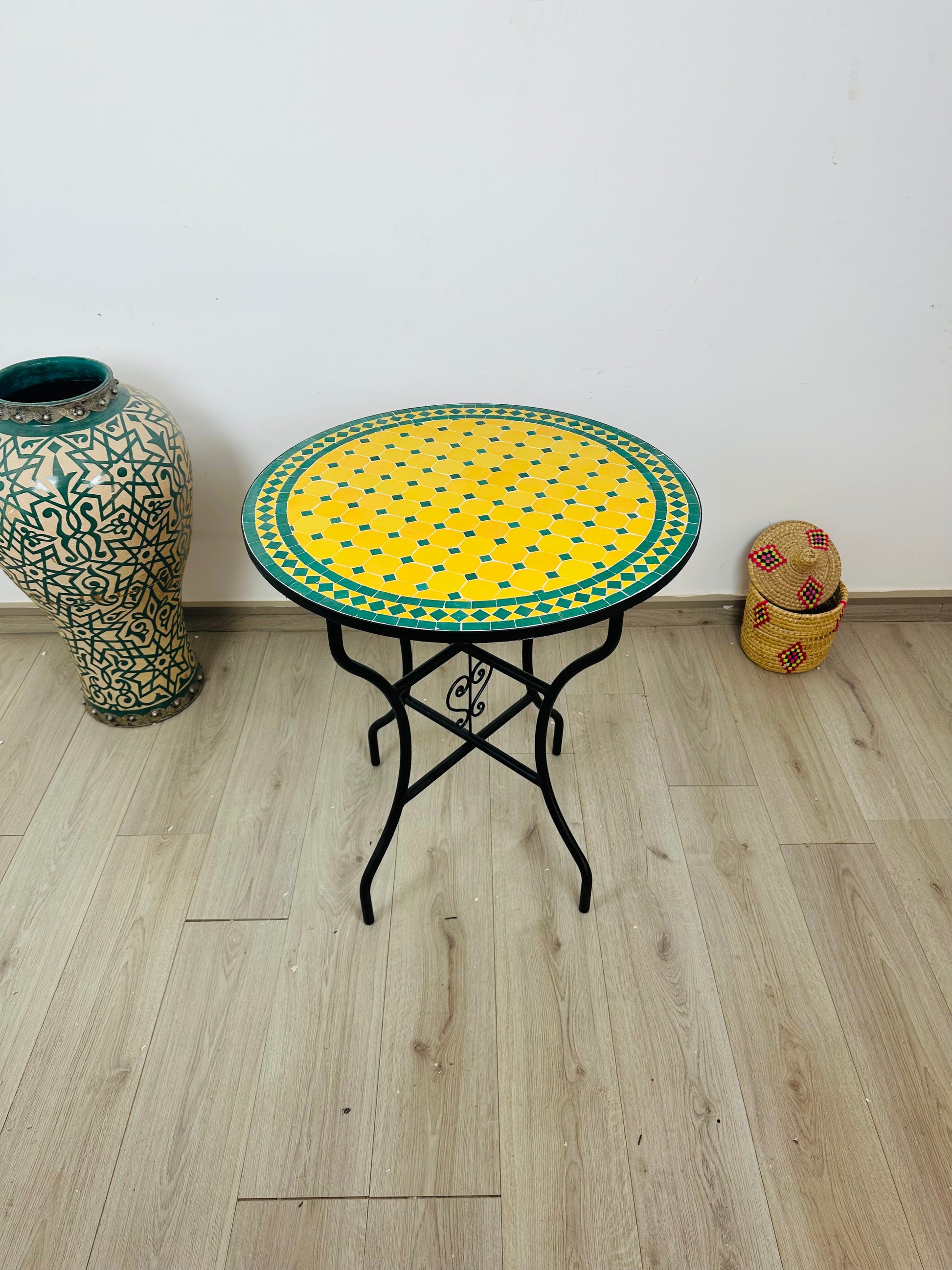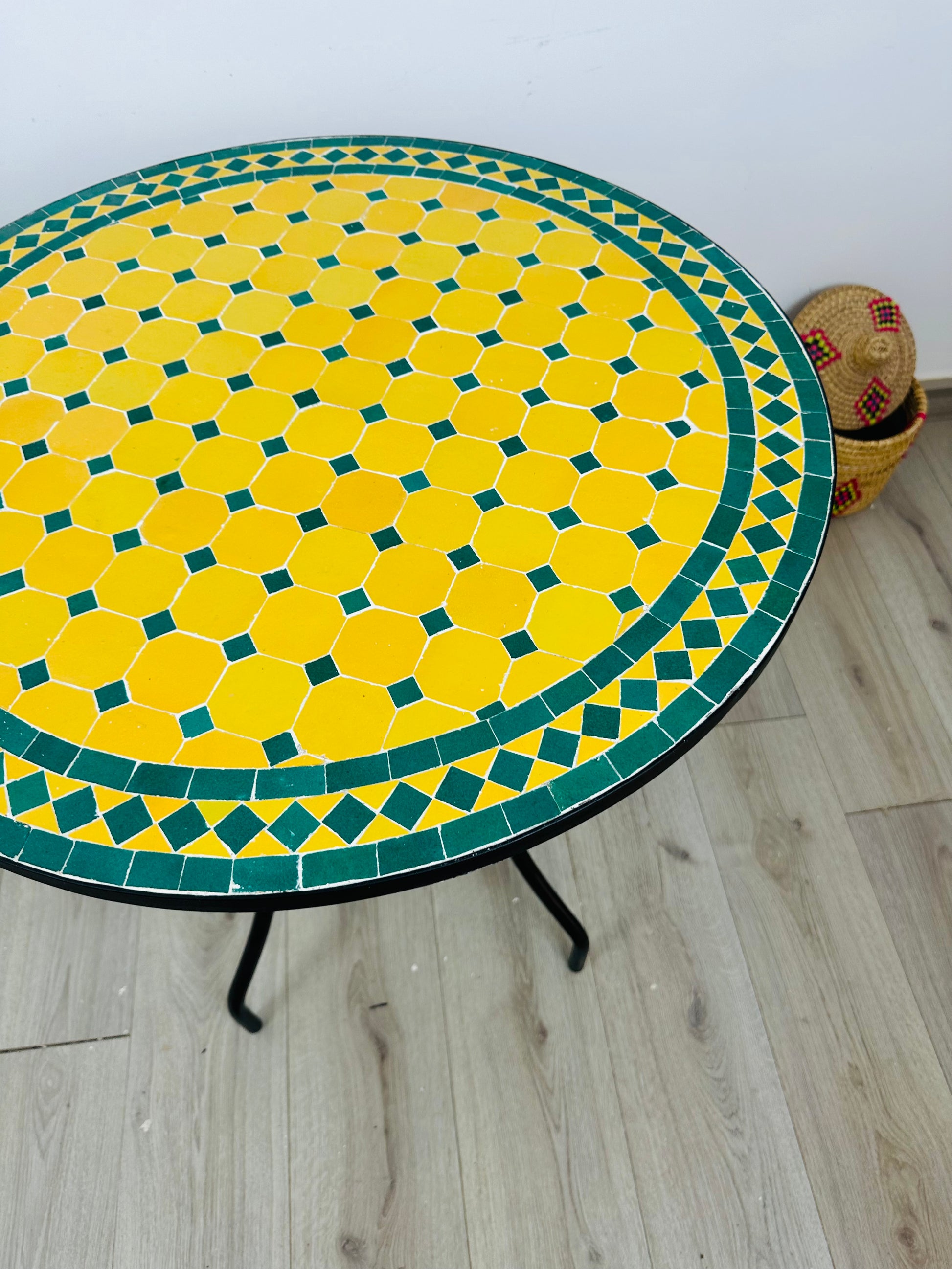 Bright and inviting, this handcrafted Moroccan mosaic table is a statement piece with its vibrant yellow and deep green hues. Intricately arranged mosaic tiles form a symmetrical pattern, adding warmth and character to any space. Designed with a sturdy wrought iron base, this table seamlessly blends functionality with traditional artistry, making it perfect for both indoor and outdoor settings.