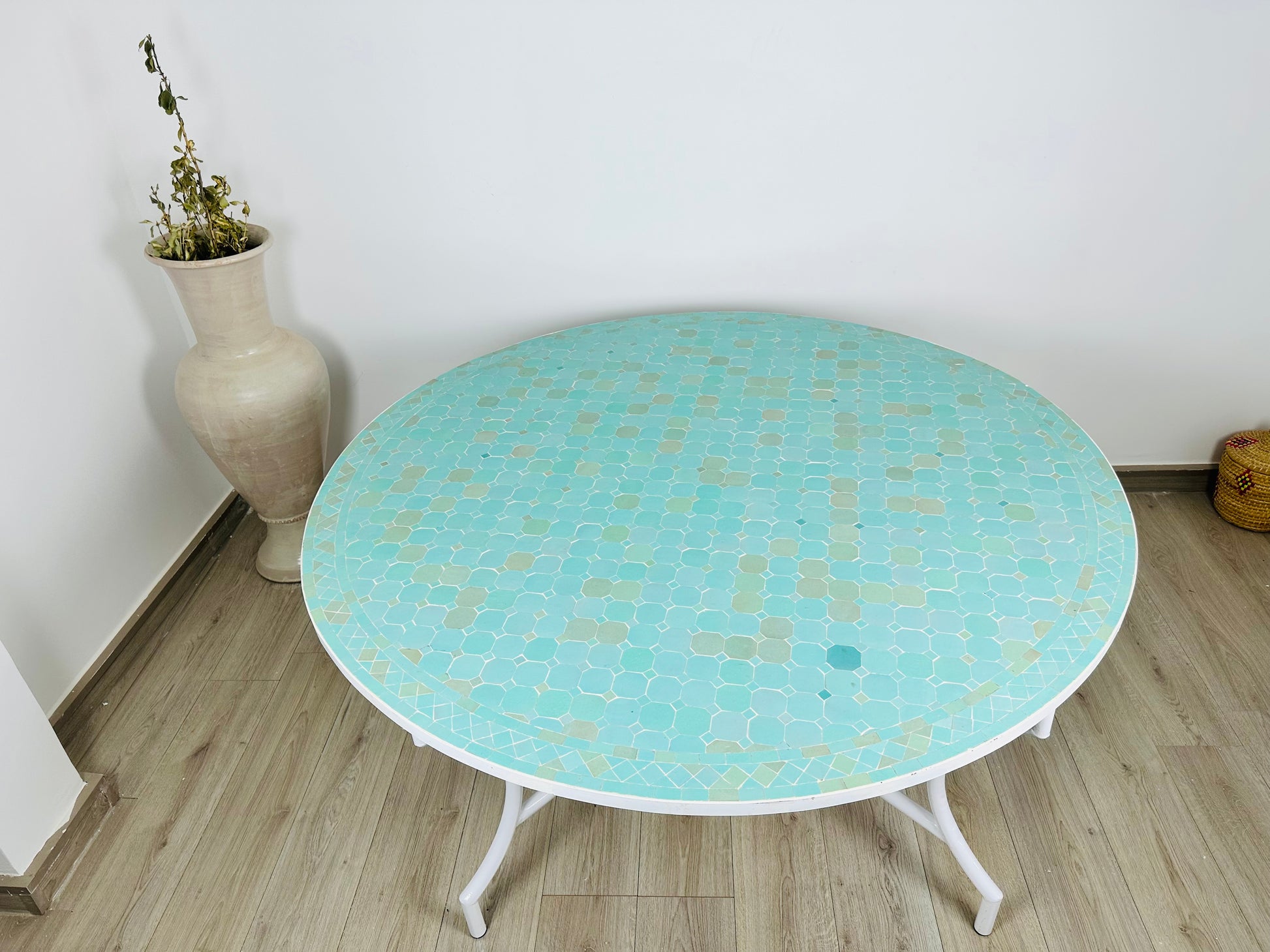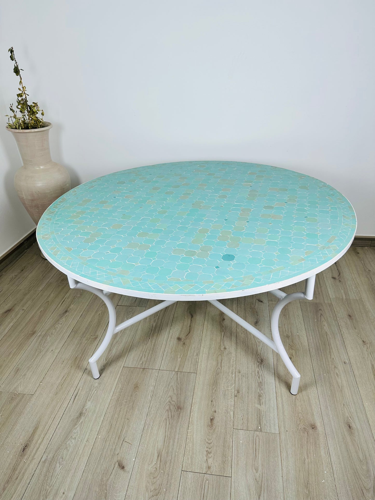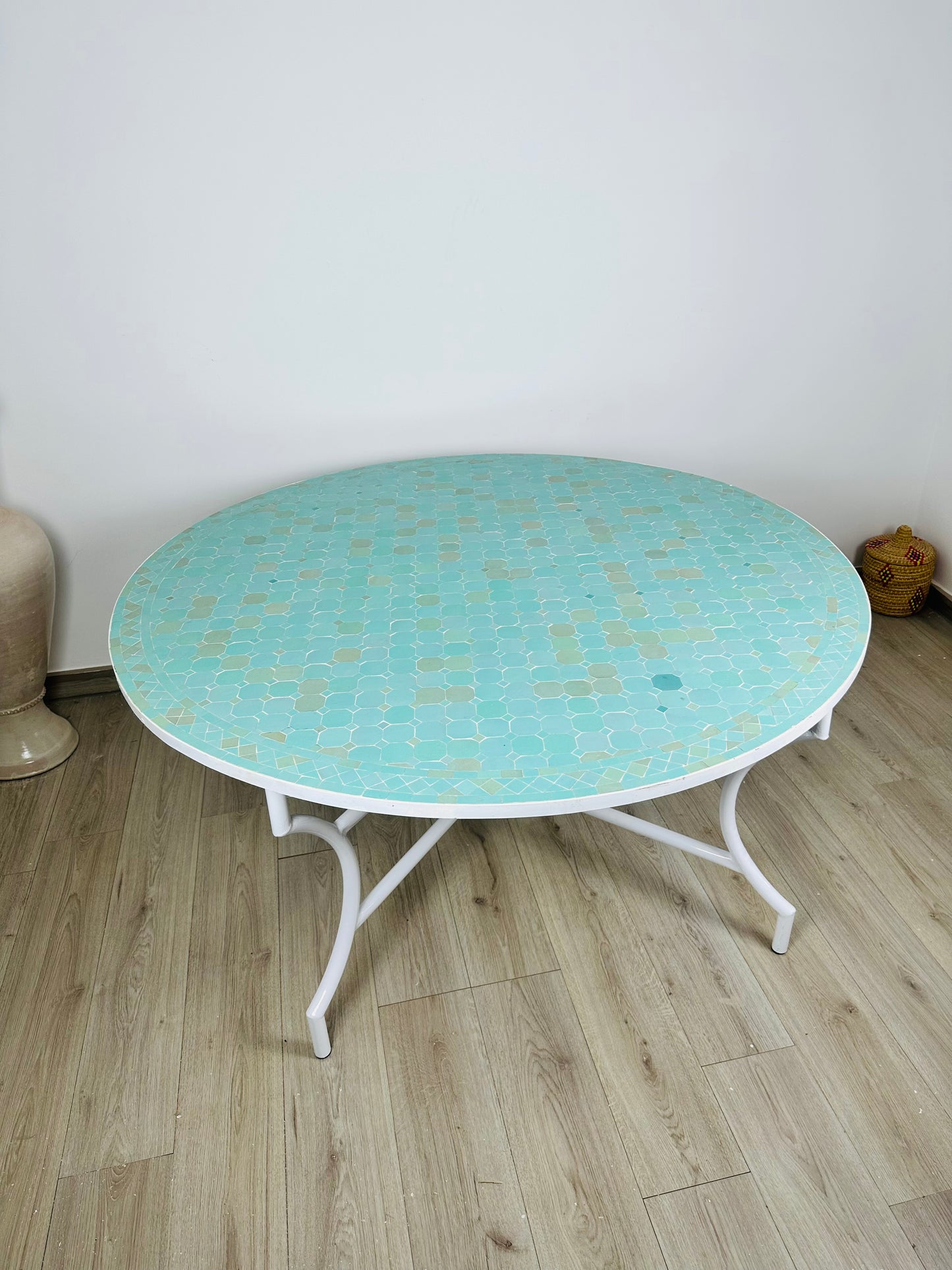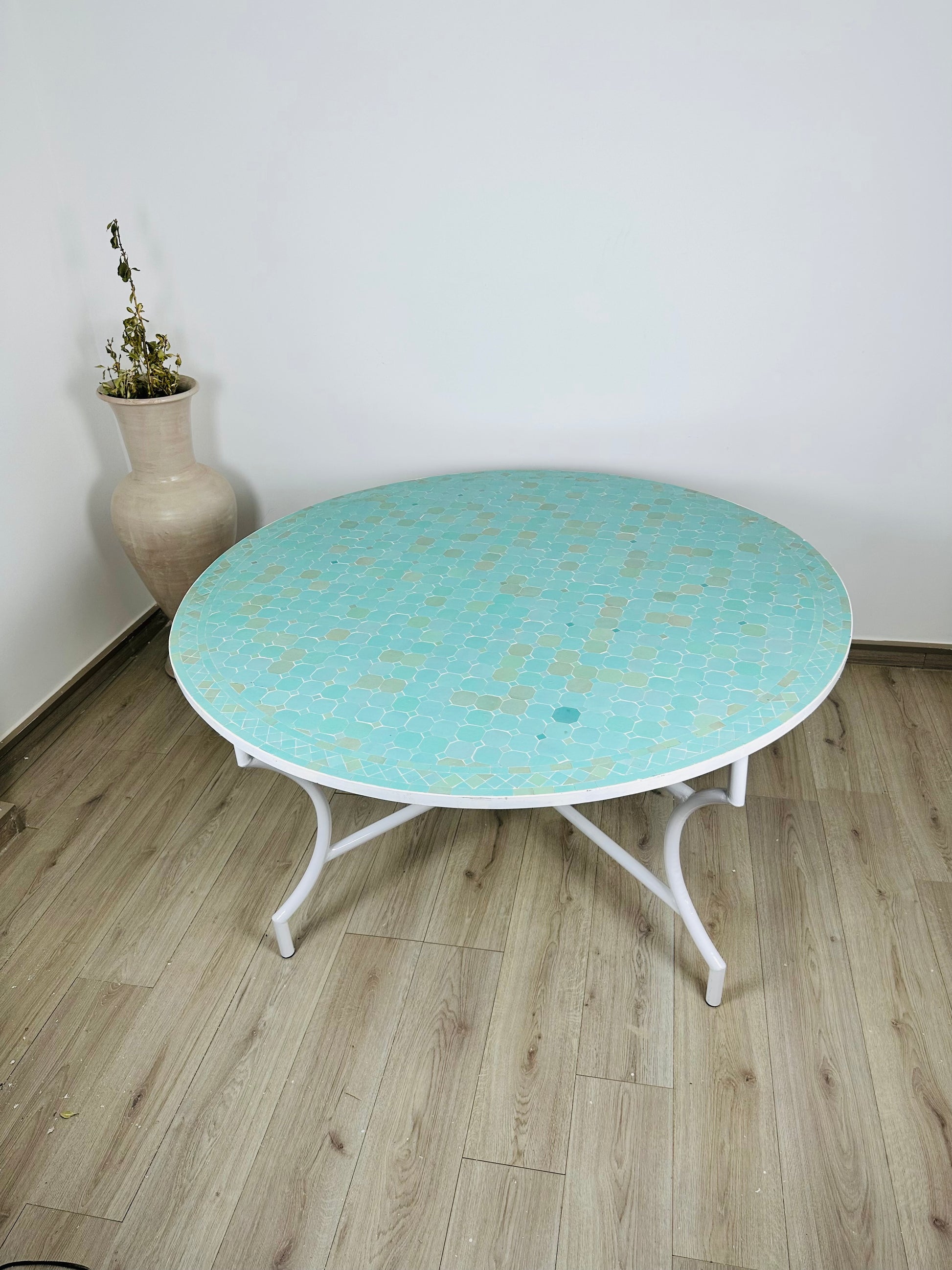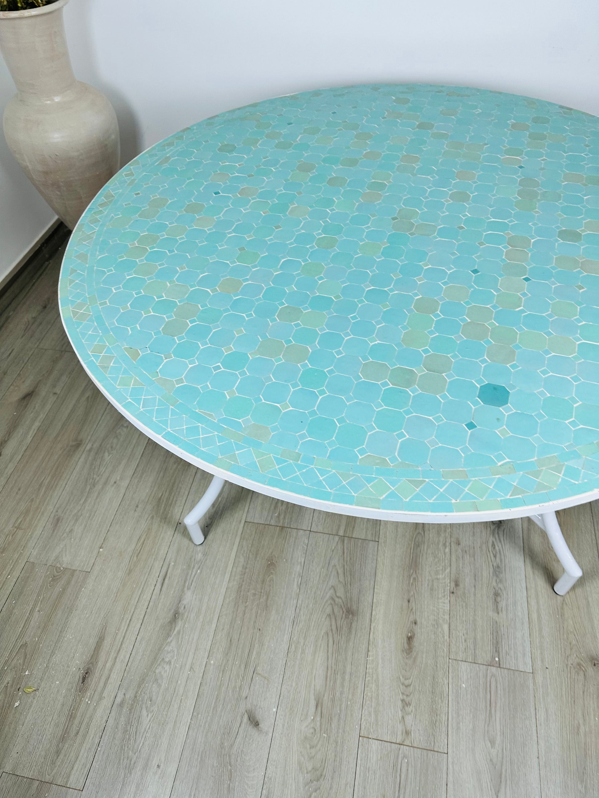 Serene Aqua Mosaic Table with White Iron Base