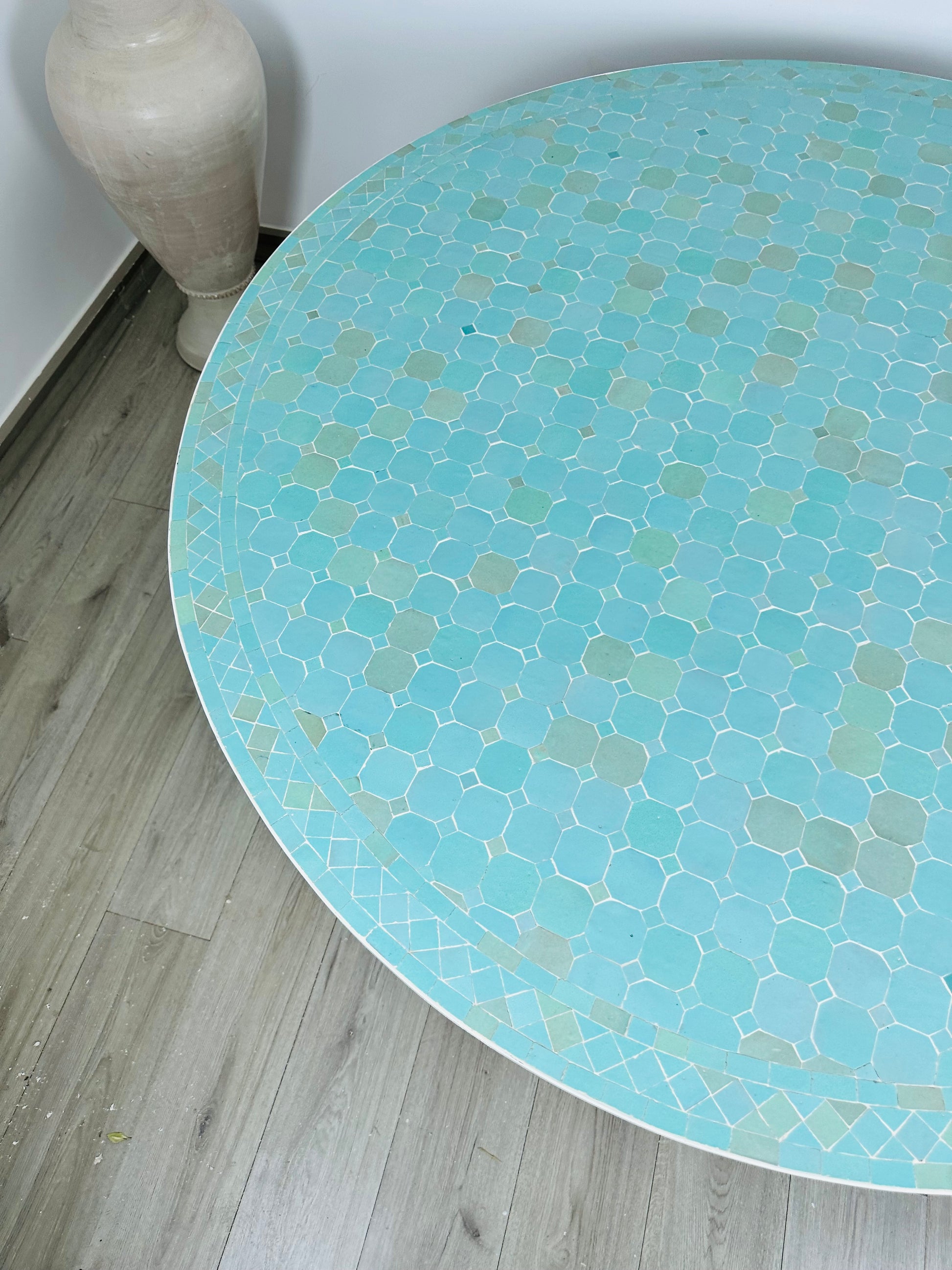 Bring a touch of tranquility to your space with this stunning mosaic table, crafted with a soft blend of aqua, beige, and turquoise tiles. The delicate, hand-laid mosaic pattern exudes an airy, coastal charm, making it an ideal choice for both indoor and outdoor settings. The sturdy white iron base complements the refreshing color palette, adding a sophisticated contrast to the intricate design.