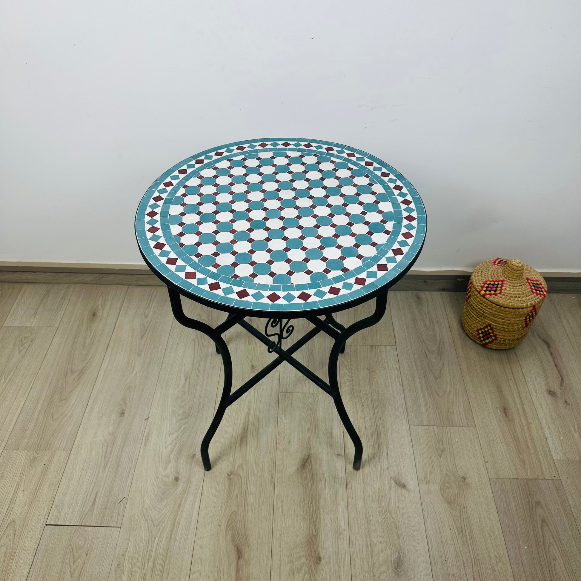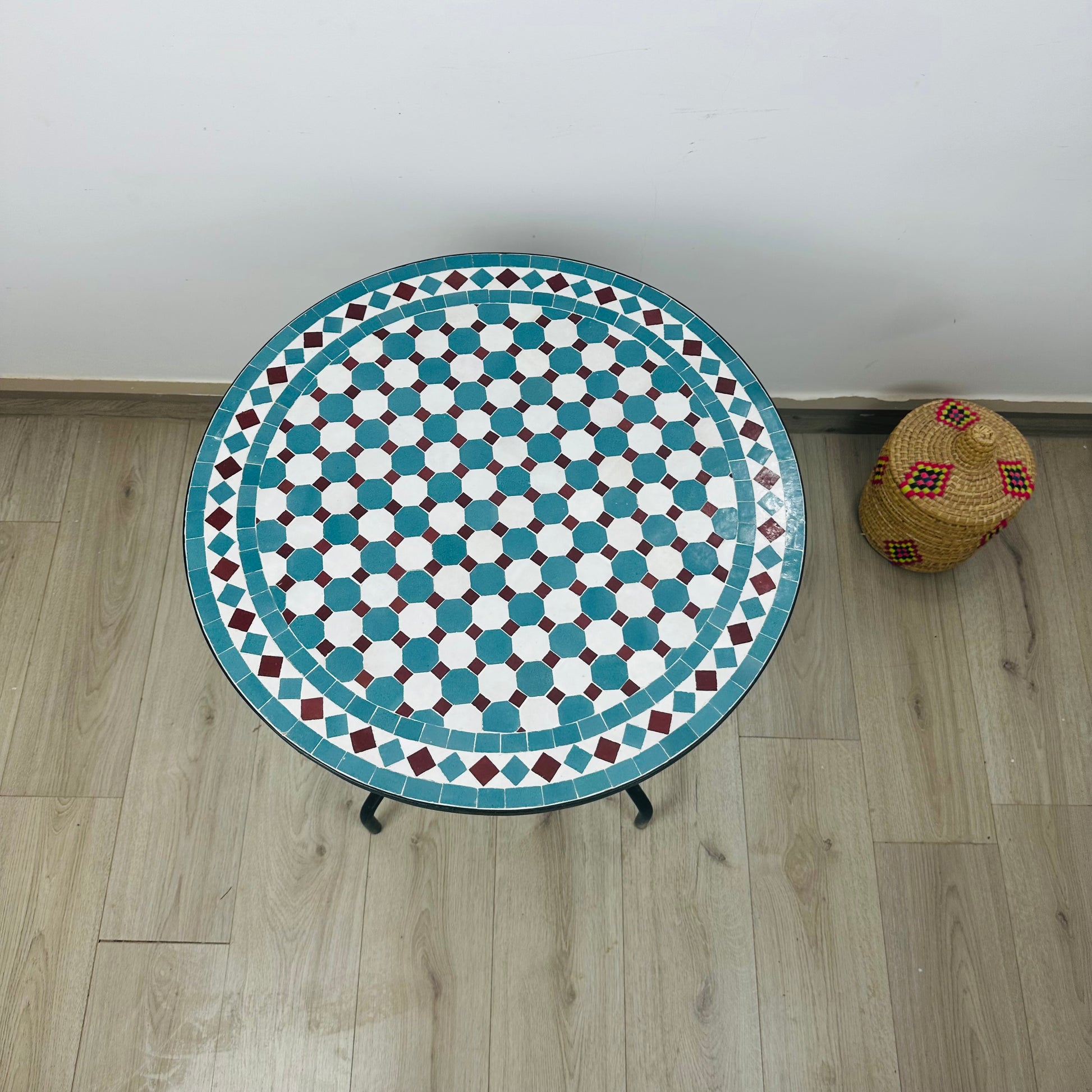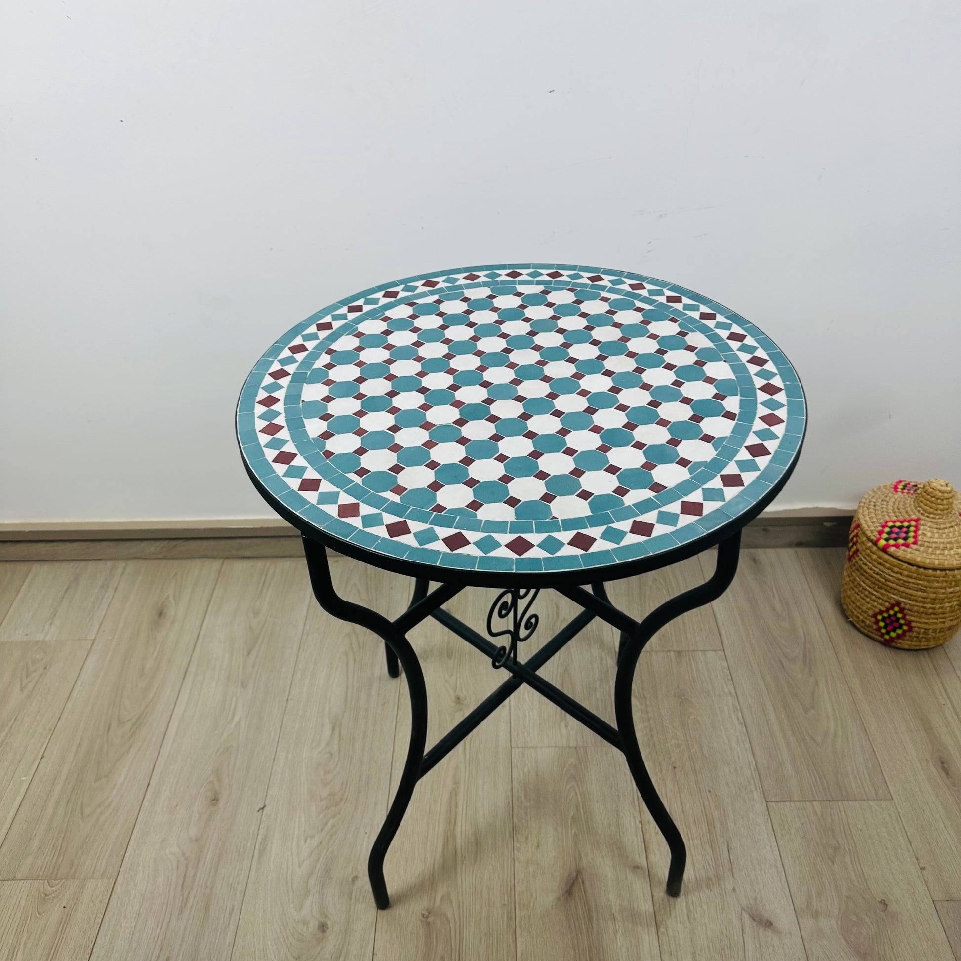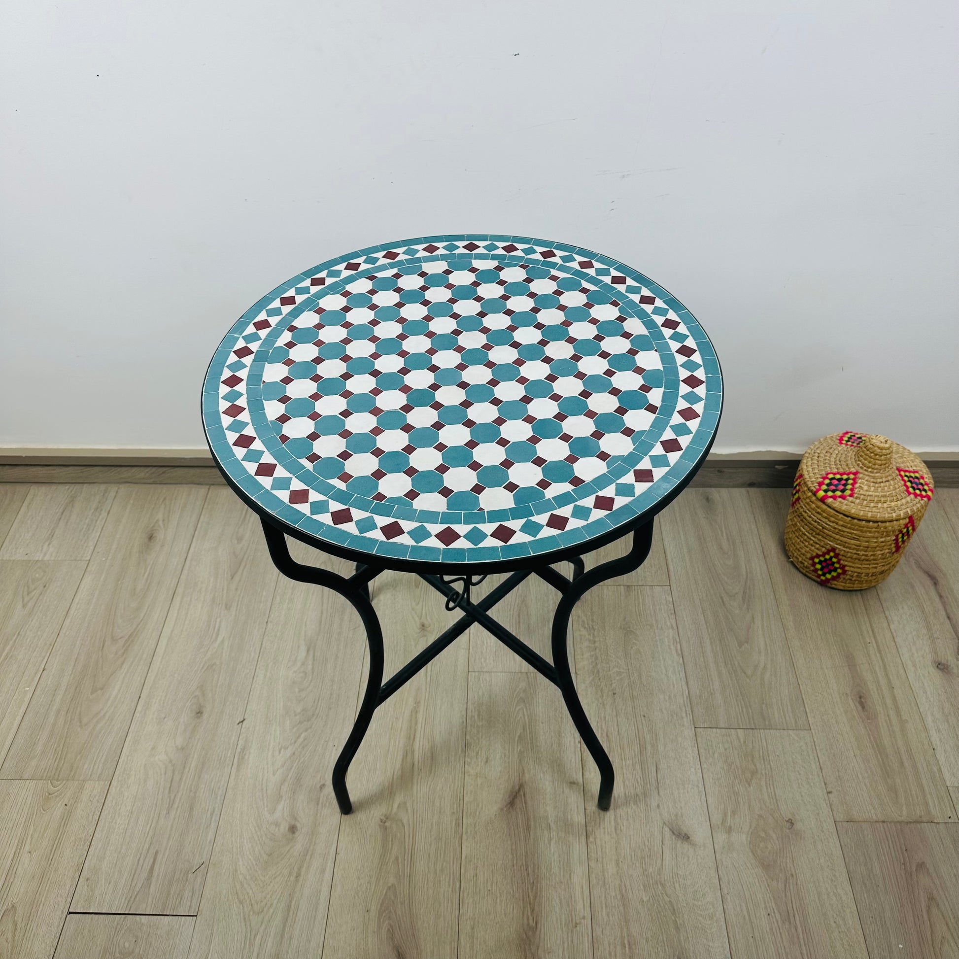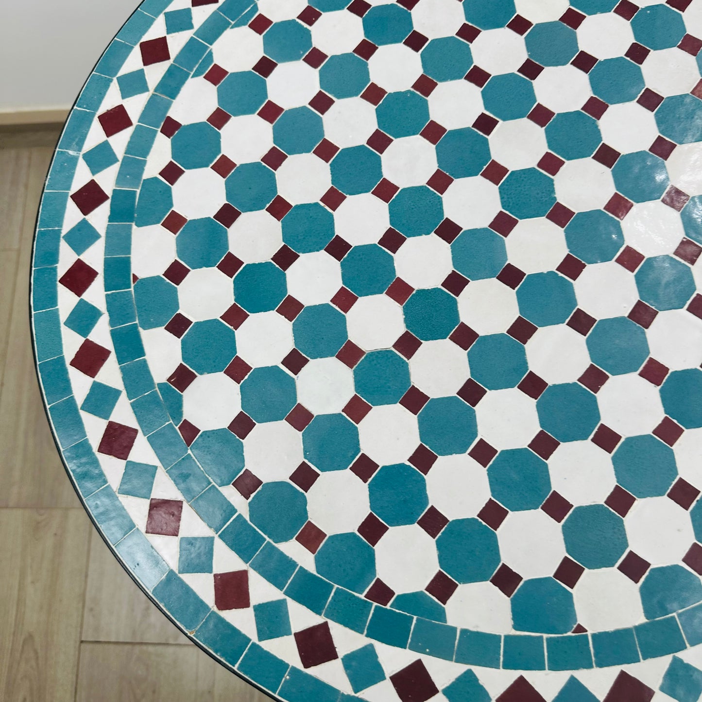 Elevate your space with this stunning handcrafted Moroccan mosaic table, featuring an intricate geometric pattern in shades of blue, burgundy, and white. The sturdy wrought iron base provides durability, while the carefully arranged mosaic tiles bring an artistic touch to any setting. Perfect for indoor or outdoor use, this table is a statement of craftsmanship and elegance.