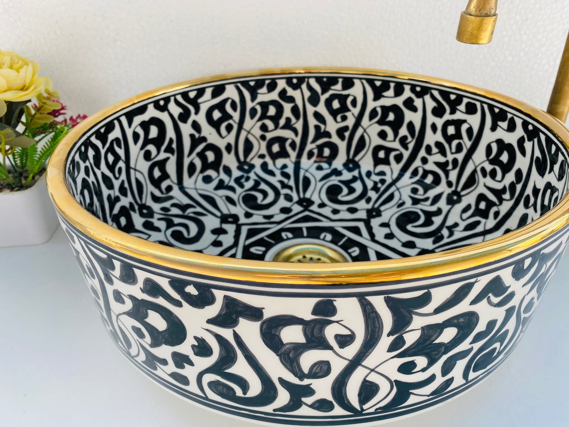 A perfect blend of tradition and elegance, this Moroccan ceramic sink features bold black hand-painted calligraphic motifs on a crisp white background. Accented with a luxurious brass rim, this sink is a stunning statement piece, seamlessly combining artisanal craftsmanship with timeless beauty.