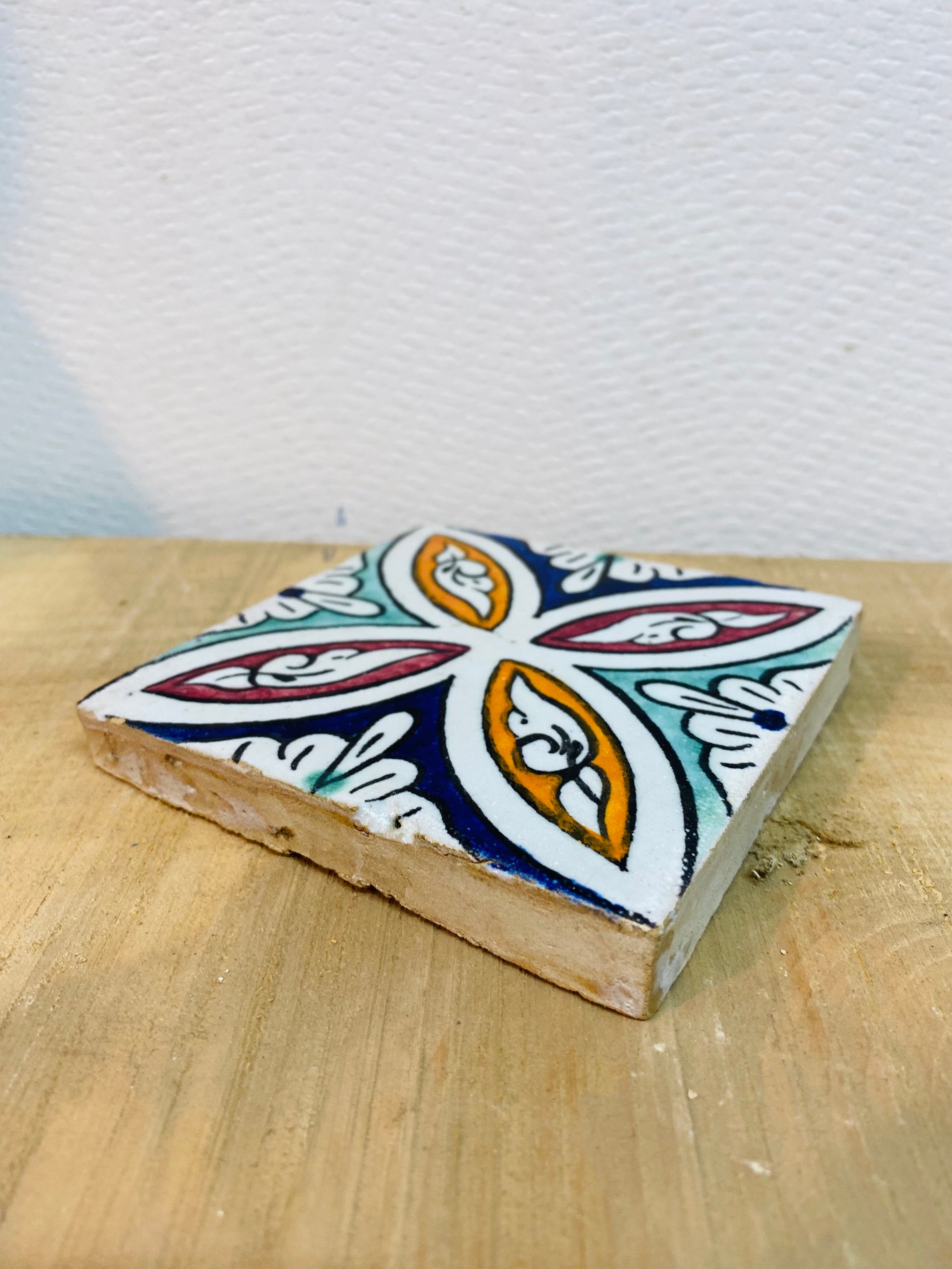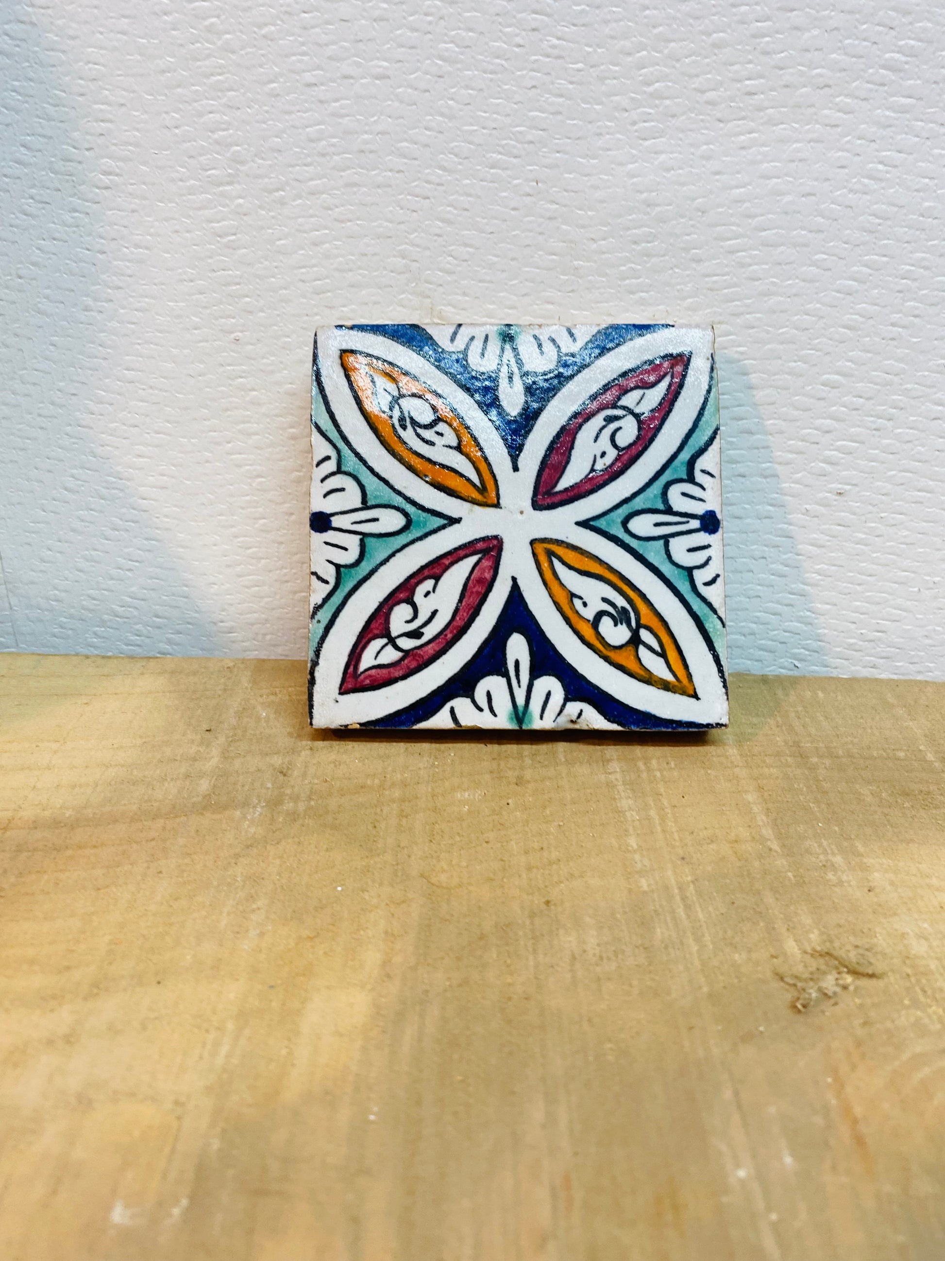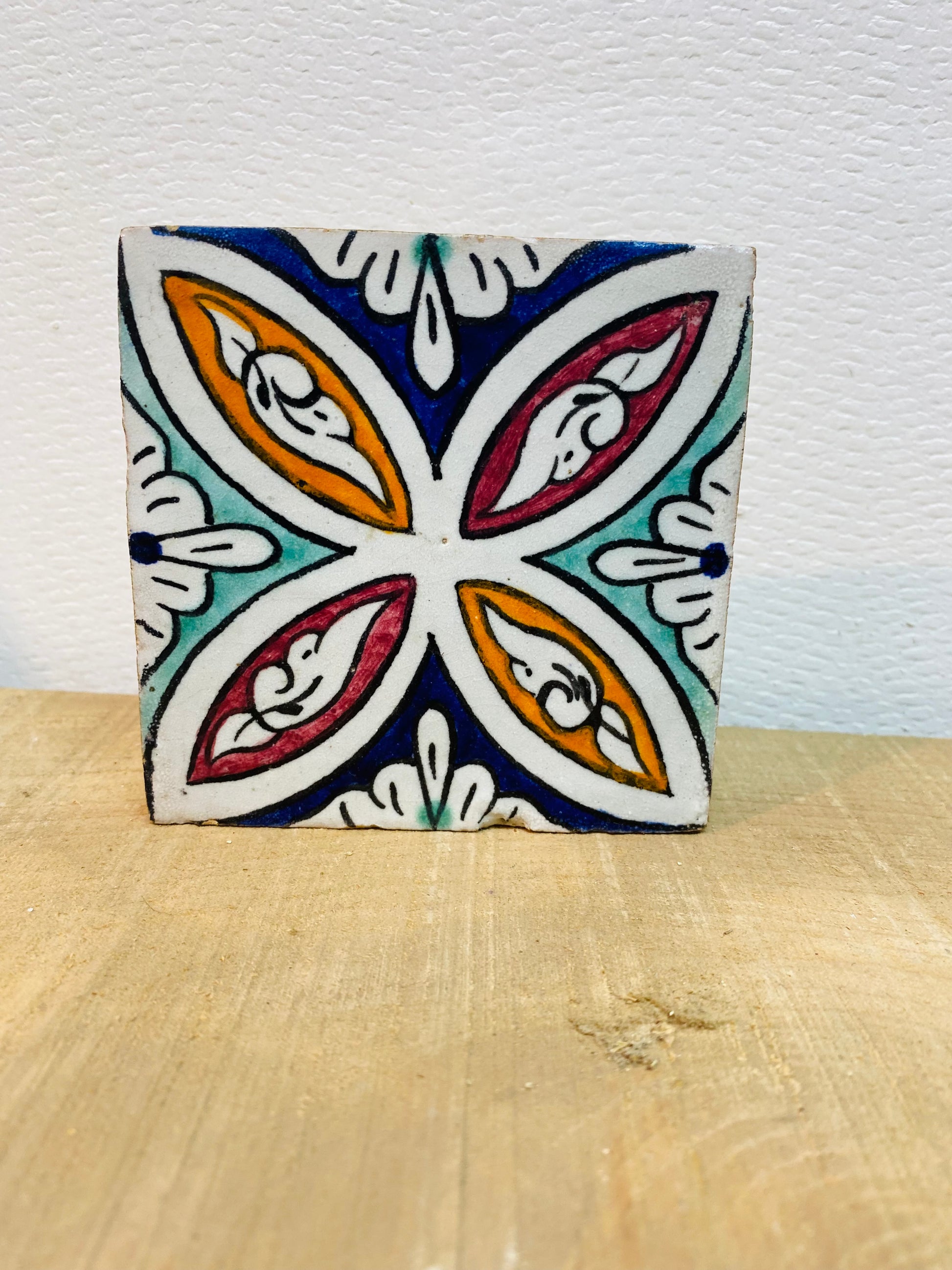 The Floral Essence Moroccan Zellige Tile presents a vivid hand-painted floral design, symbolizing Moroccan artistic tradition. The interwoven petal-like motifs, painted in rich burgundy, deep blue, and warm amber, create a captivating contrast against a soft cream backdrop. This handmade and hand-glazed tile brings a vibrant, yet elegant aesthetic to any space, making it a perfect choice for accent walls, kitchen backsplashes, and statement floors.