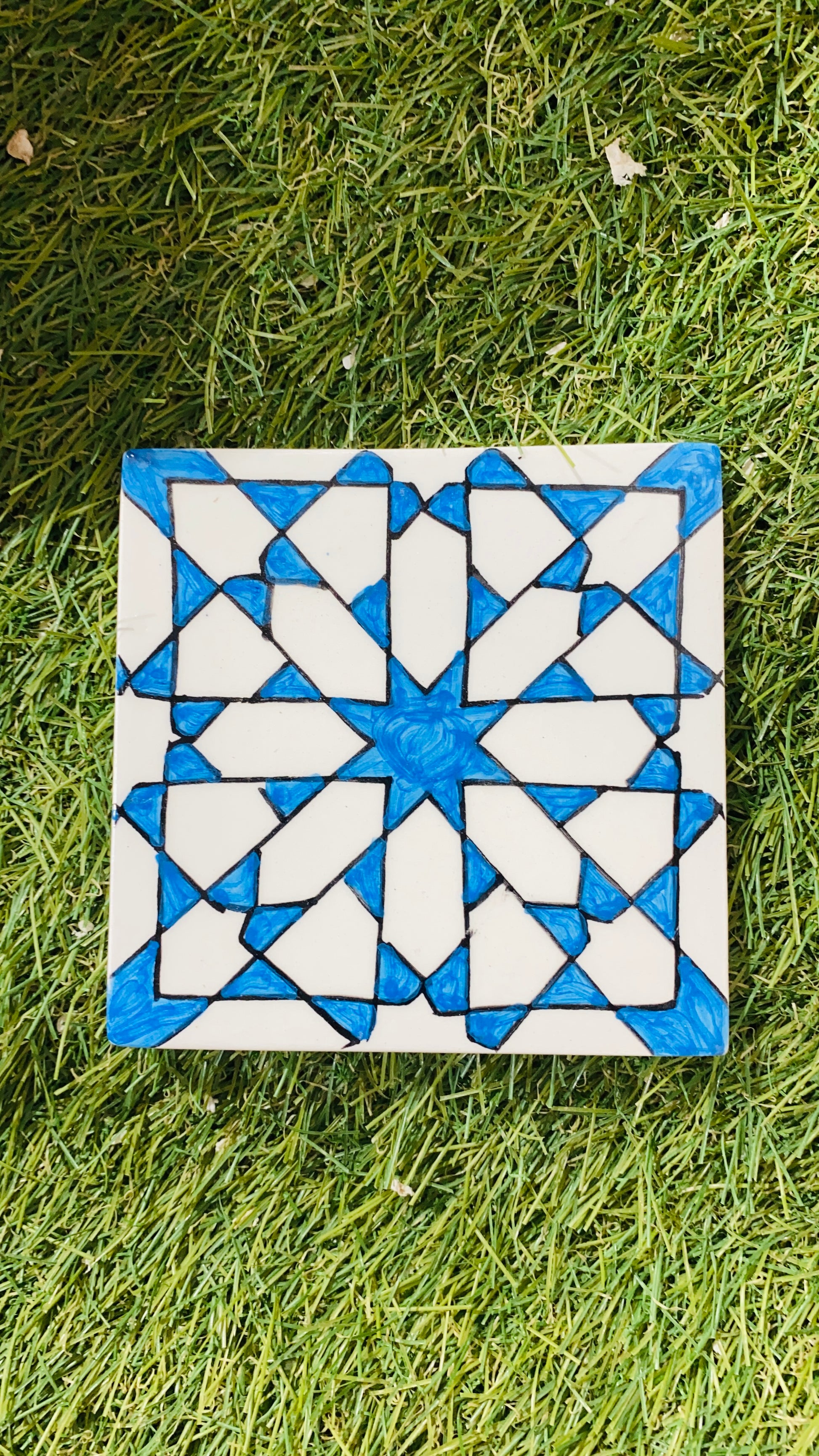 The Azure Star Moroccan Zellige Tile features a stunning geometric pattern with vivid blue accents forming a radiant starburst at the center. Hand-painted against a crisp white background, the intricate interlocking shapes reflect traditional Moroccan craftsmanship, making this tile a perfect blend of heritage and modernity. Its symmetrical design and striking color contrast create a bold and elegant aesthetic, ideal for elevating any space with a touch of artistry.