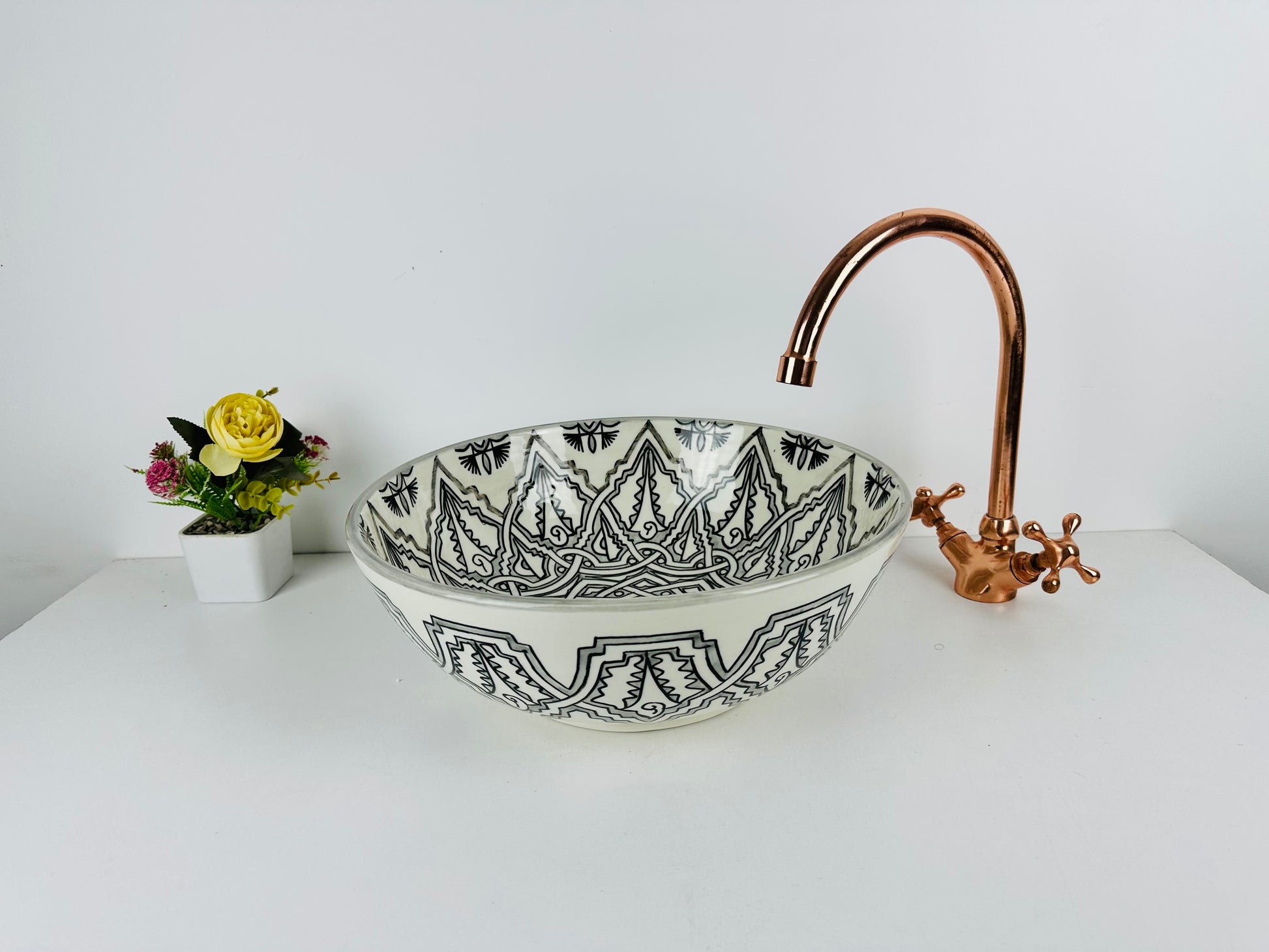 Elevate your bathroom with the striking elegance of this Monochrome Star Vessel Sink, featuring a hand-painted, intricate starburst design in black and white. The geometric patterns reflect traditional craftsmanship while offering a contemporary twist, making it an ideal statement piece for minimalist, modern, or Moroccan-inspired spaces. Its smooth, glazed surface ensures lasting beauty and easy cleaning.