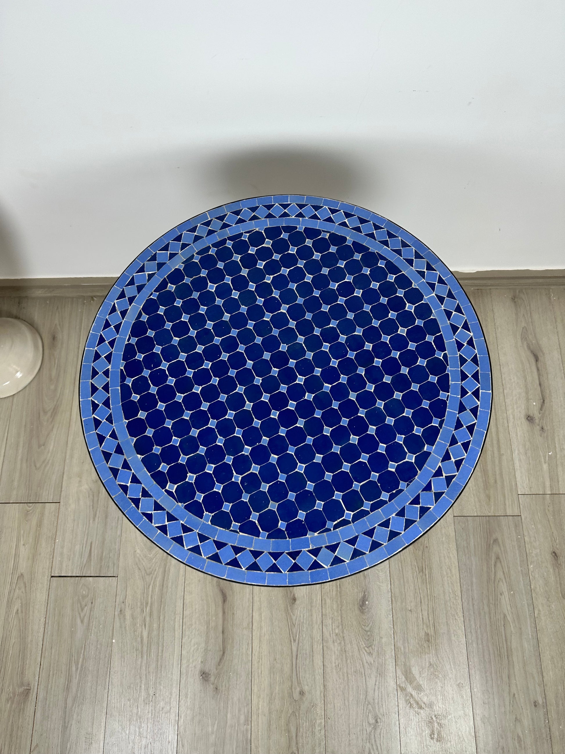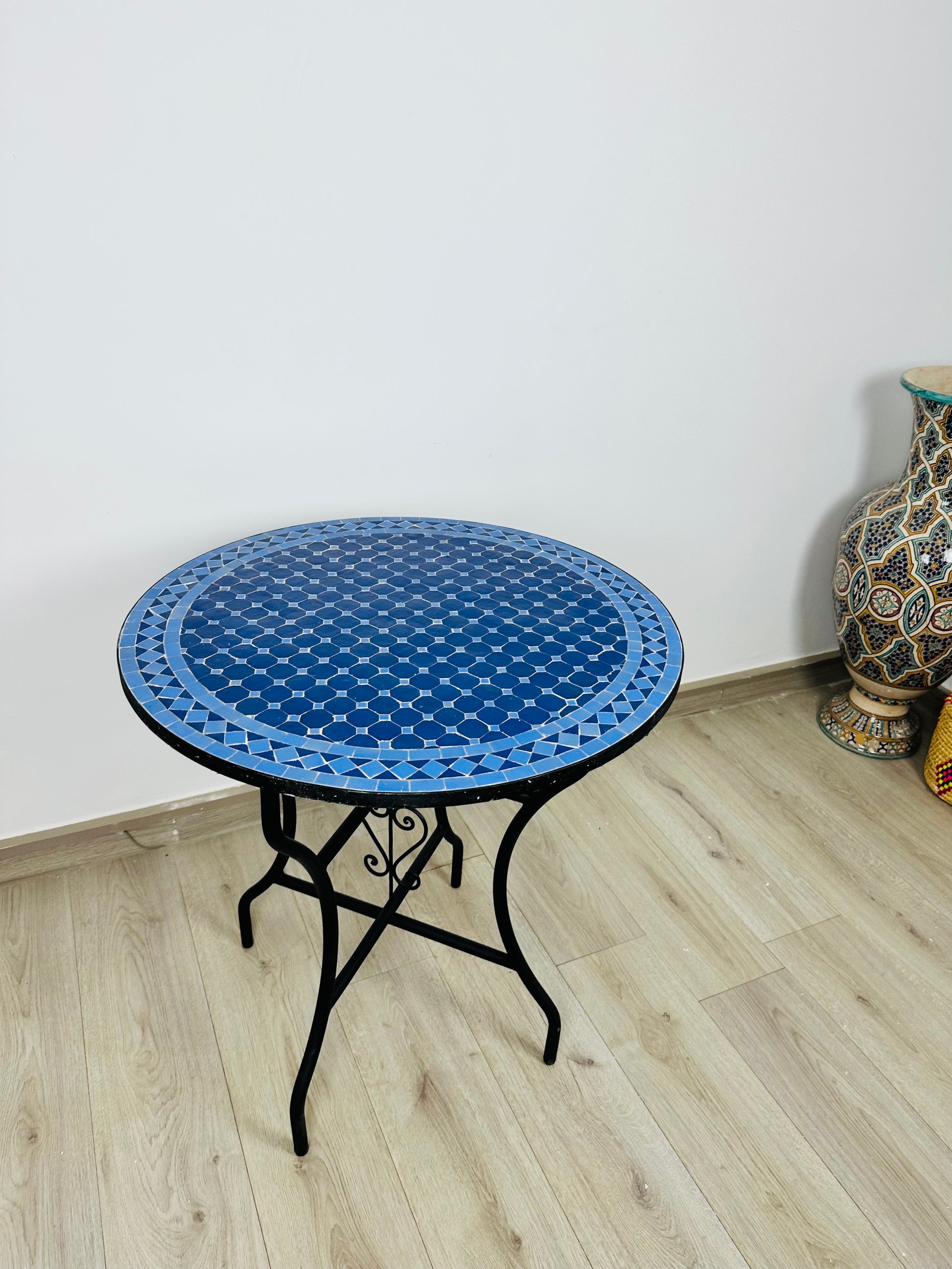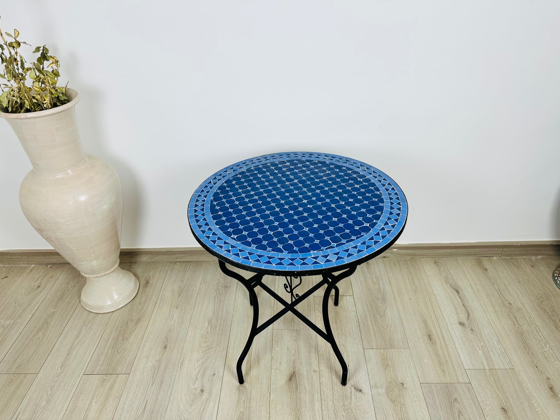 Immerse yourself in the beauty of Moroccan craftsmanship with this breathtaking mosaic table, showcasing an exquisite midnight blue and sky blue tile pattern. The contrast of deep and light blue tones creates a mesmerizing design, perfect for both indoor and outdoor spaces. Handcrafted with precision, this table adds a touch of Mediterranean charm to your patio, garden, or dining area. The sturdy wrought iron base ensures durability while maintaining an elegant aesthetic.