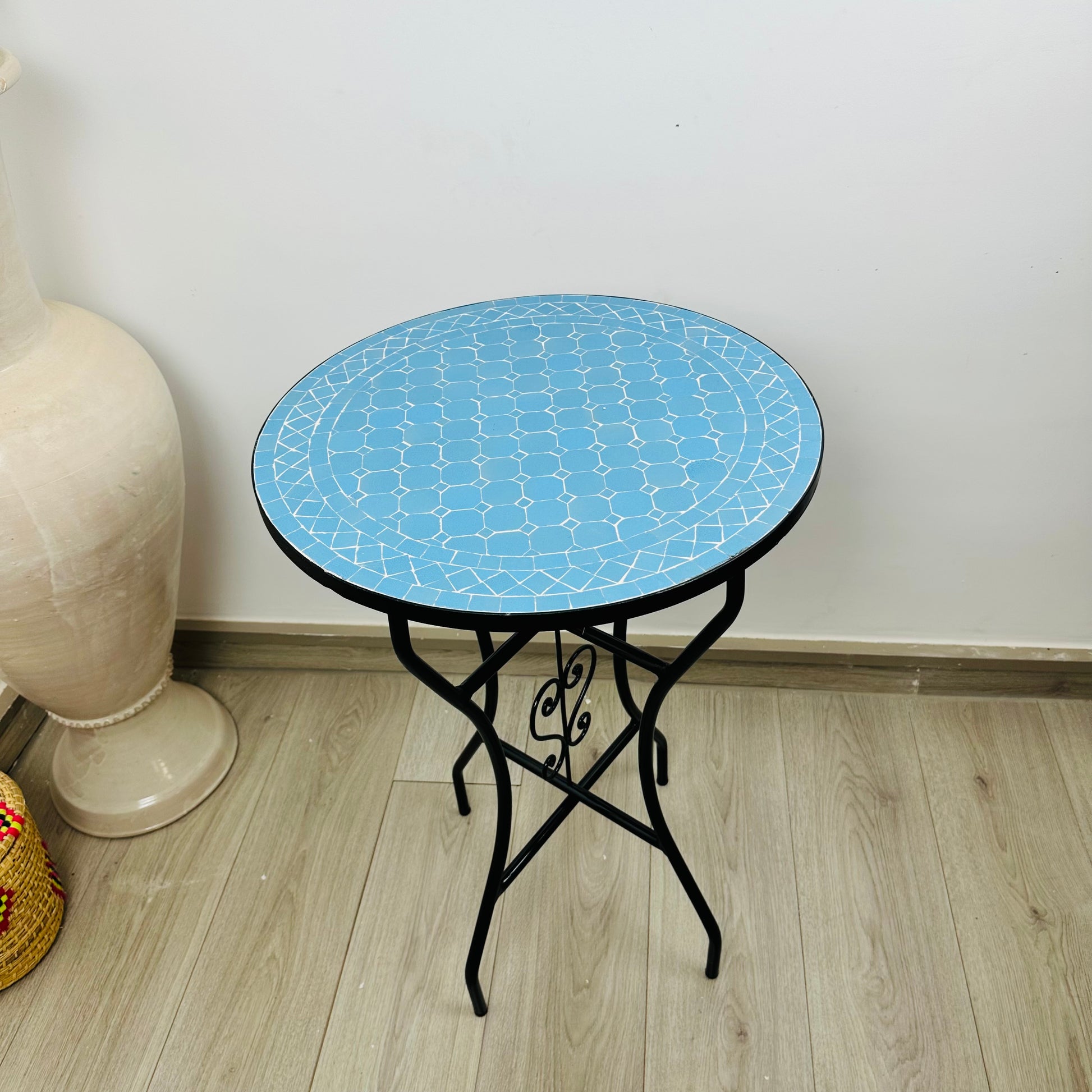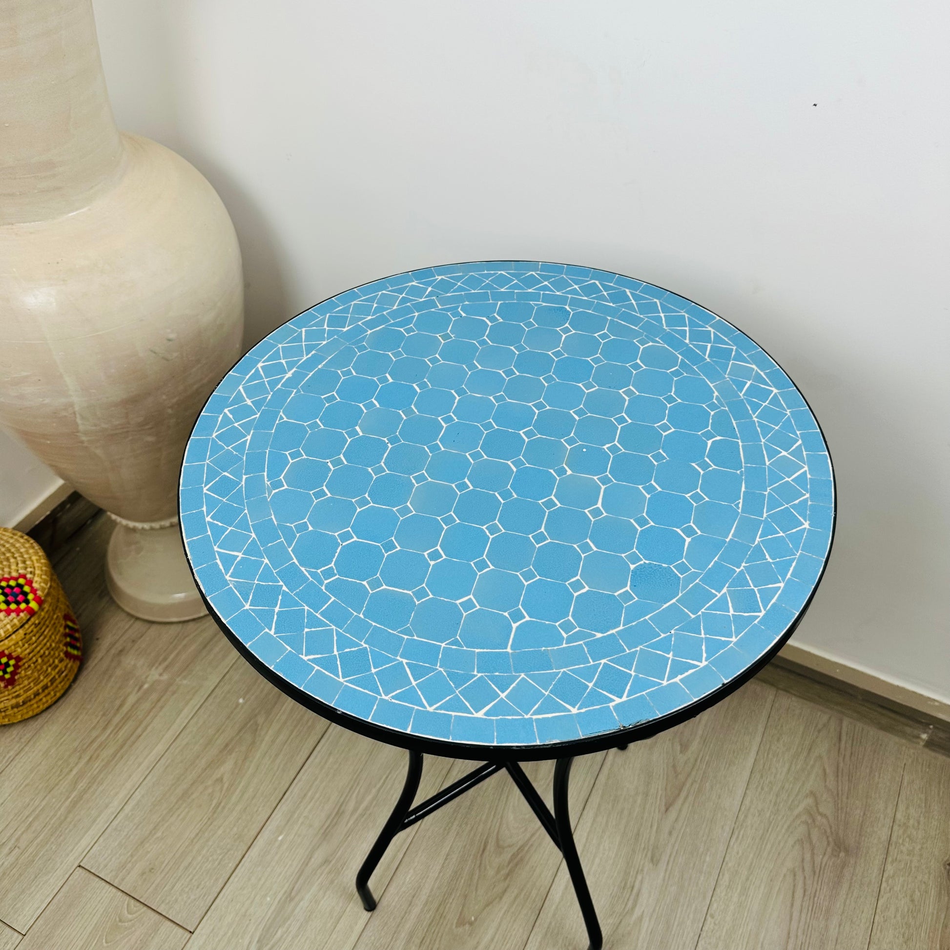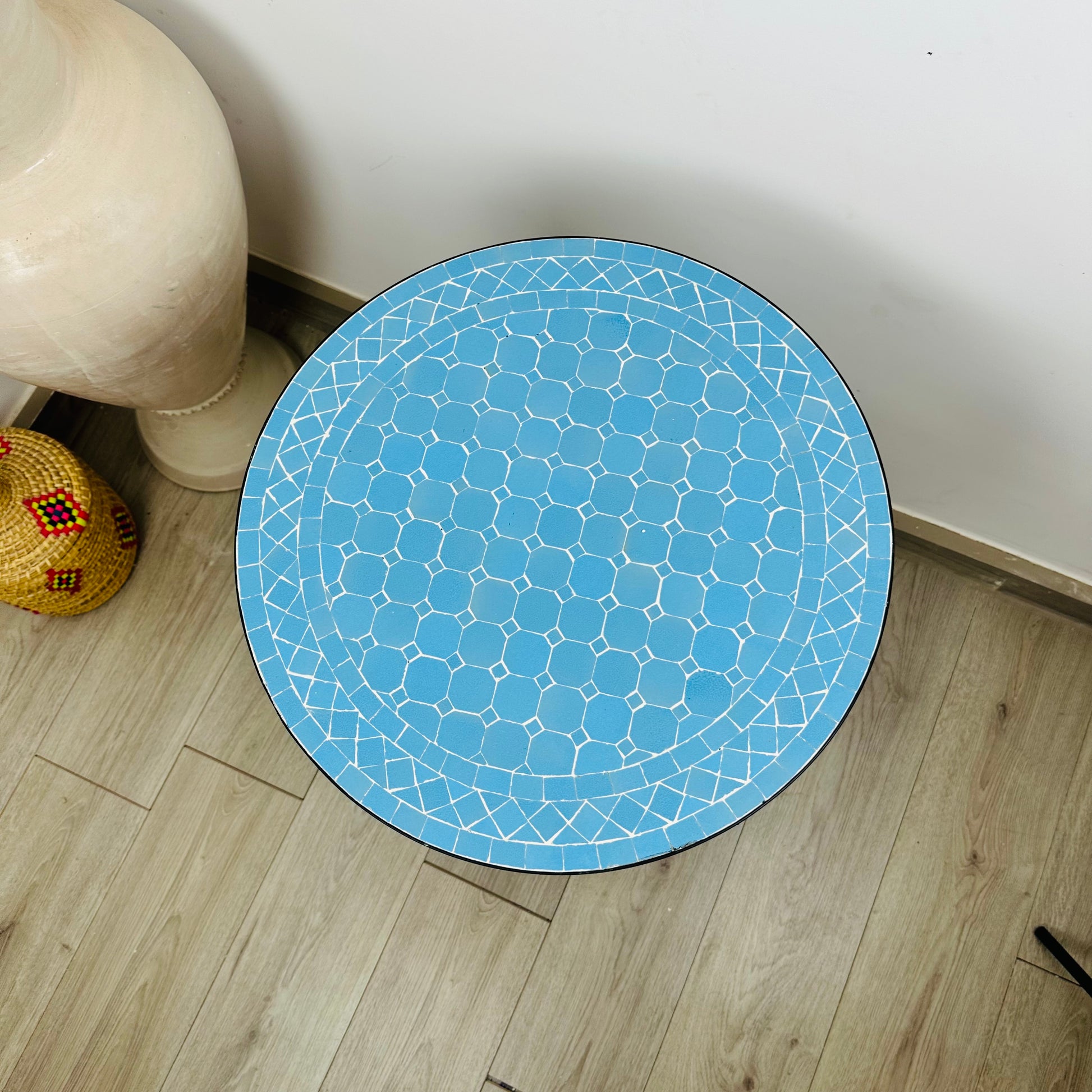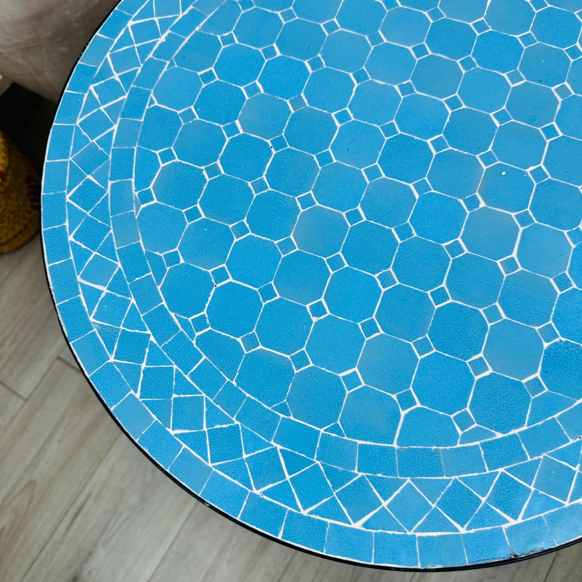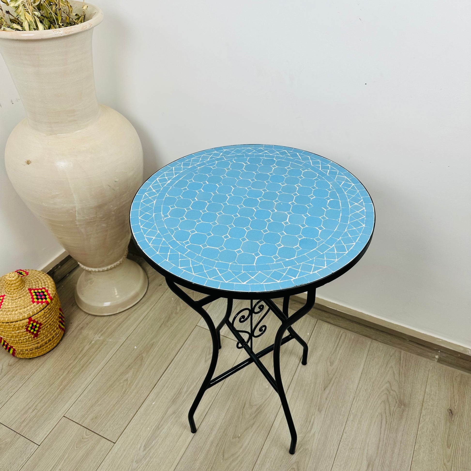Elevate your space with this exquisite Moroccan mosaic table, featuring a mesmerizing royal blue and white tile design. Handcrafted with precision, the intricate geometric patterns reflect the timeless artistry of Moroccan craftsmanship. Whether placed indoors or outdoors, this table adds a sophisticated and vibrant touch to any setting. Its durable wrought iron base ensures stability and elegance, making it perfect for patios, gardens, or cozy indoor corners.