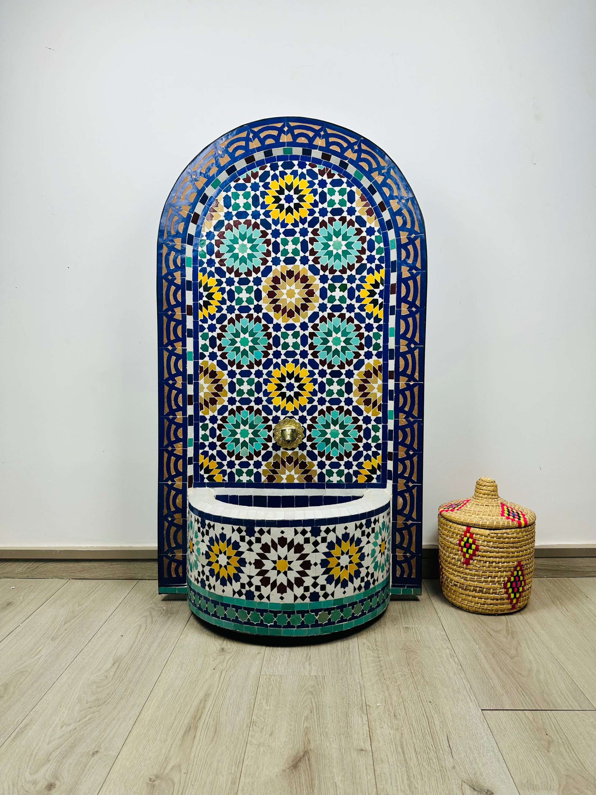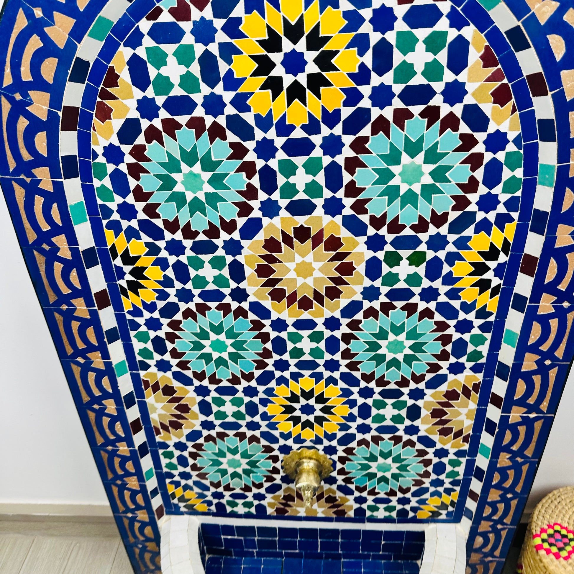 Elevate your space with this stunning Moroccan fountain, crafted with hand-cut Zellige tiles in a mesmerizing blend of blue, green, yellow, and earthy tones. The intricate geometric patterns, inspired by Andalusian and Moorish art, make this fountain a true centerpiece of beauty and tradition.