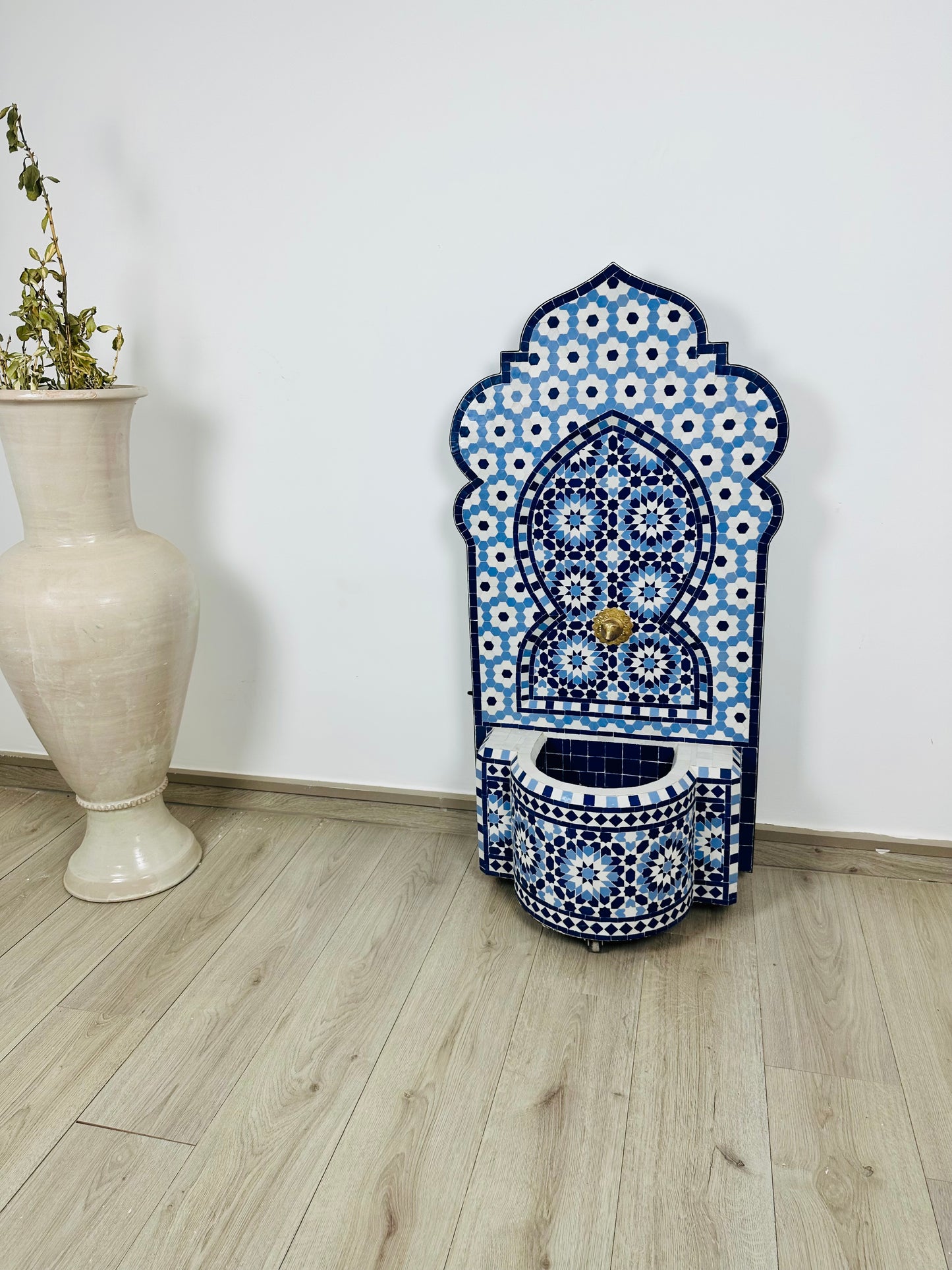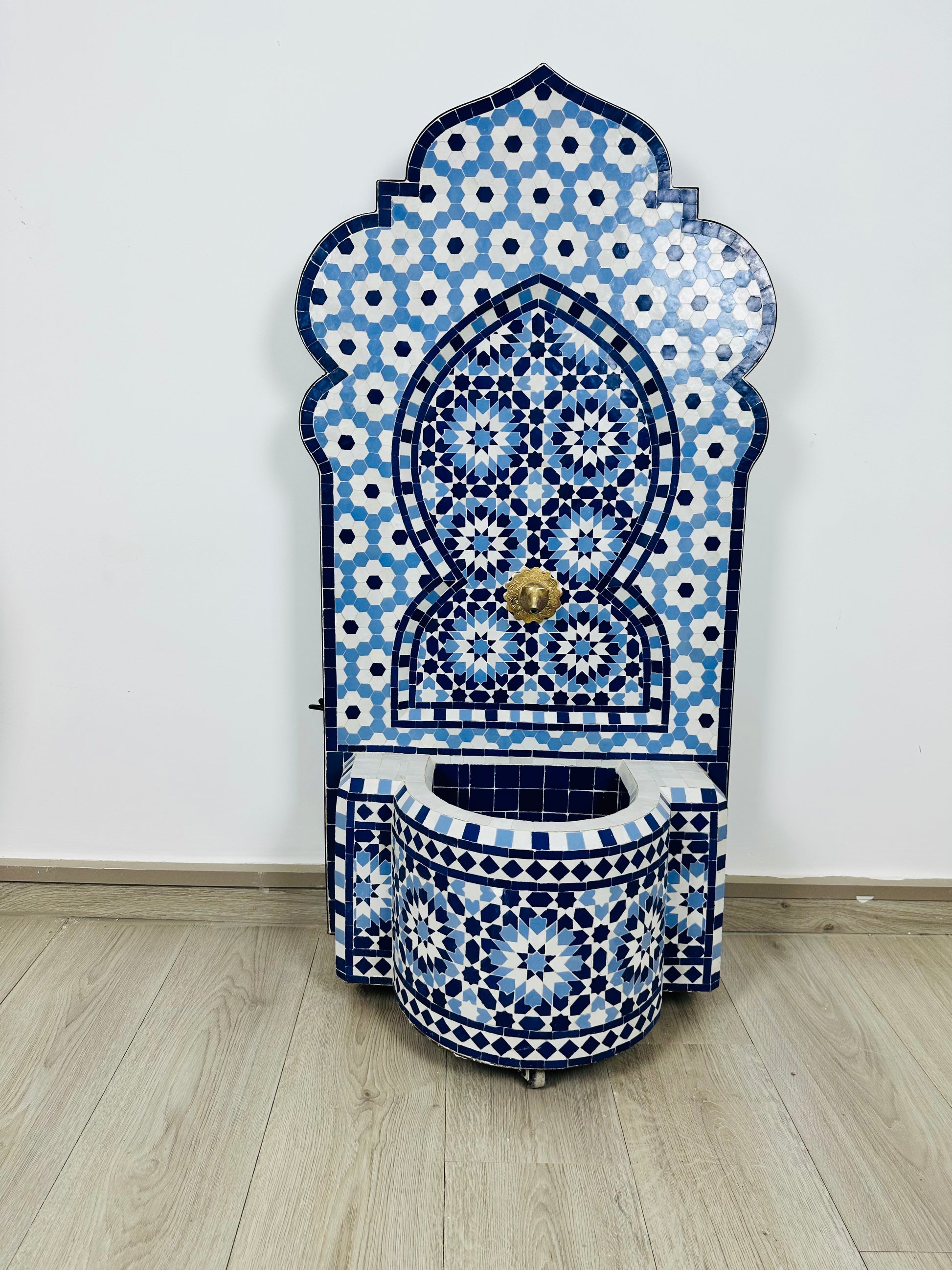A stunning Moroccan Zellige fountain featuring an intricate blue and white tile mosaic, this piece blends tradition and elegance effortlessly. Its handcrafted geometric patterns and ornate brass faucet make it a captivating addition to any space.