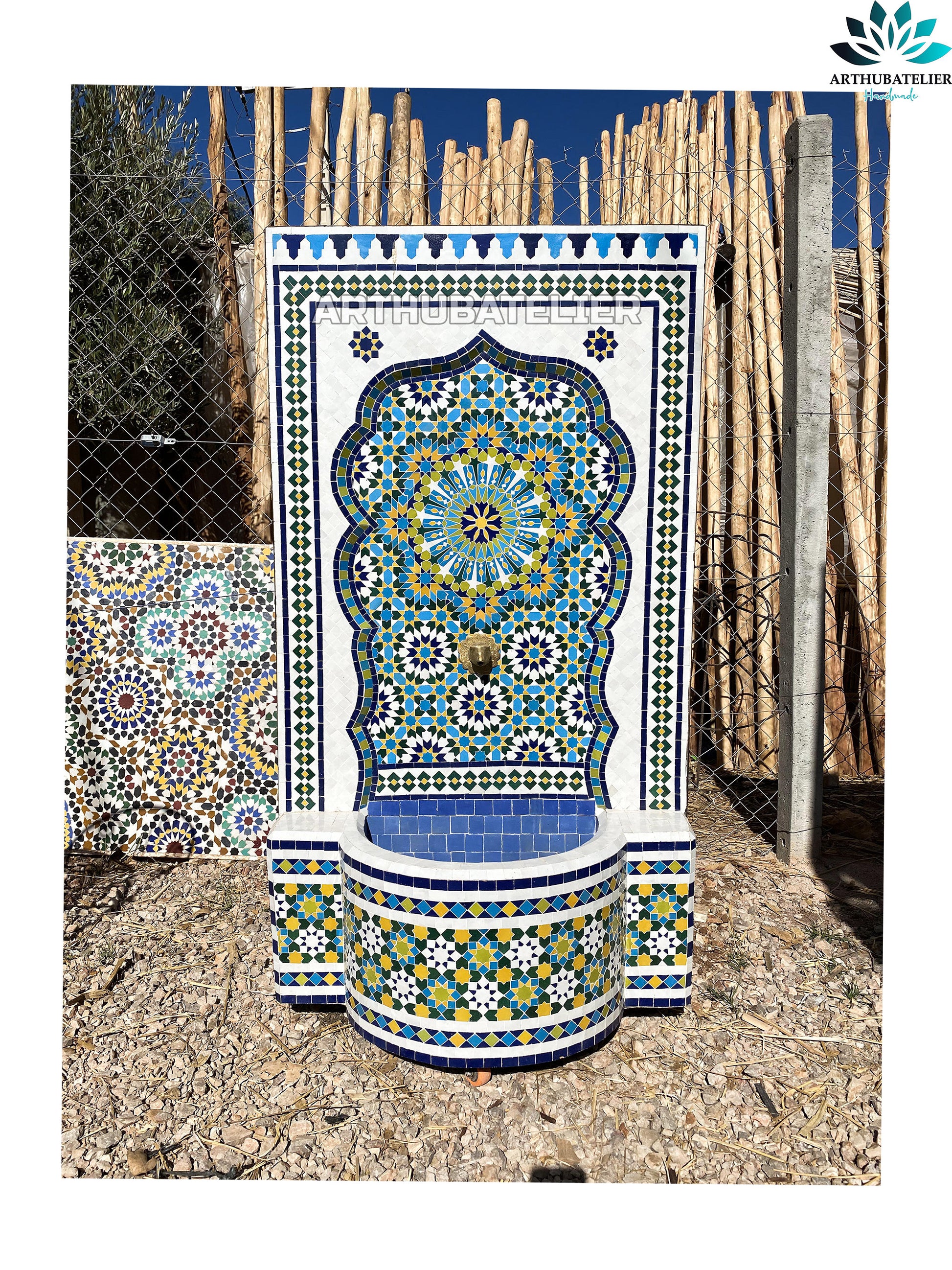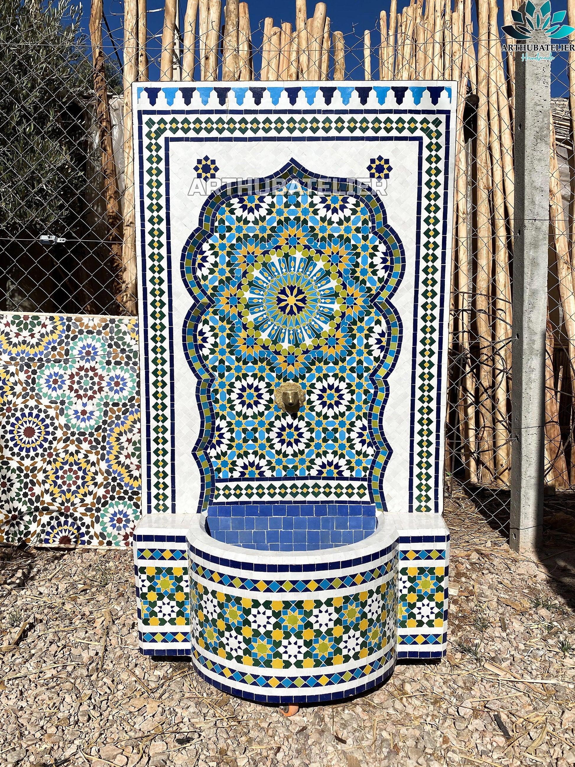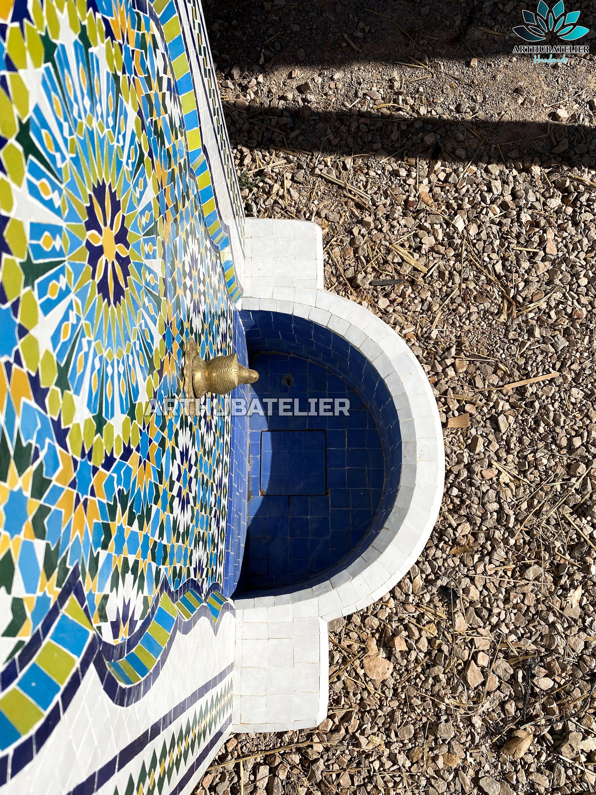 Enhance your space with the artisanal beauty of this Moroccan Zellige fountain, a true masterpiece of Moroccan craftsmanship. Featuring a breathtaking blue, yellow, and white tile pattern, this fountain is handmade using traditional techniques and high-quality materials.