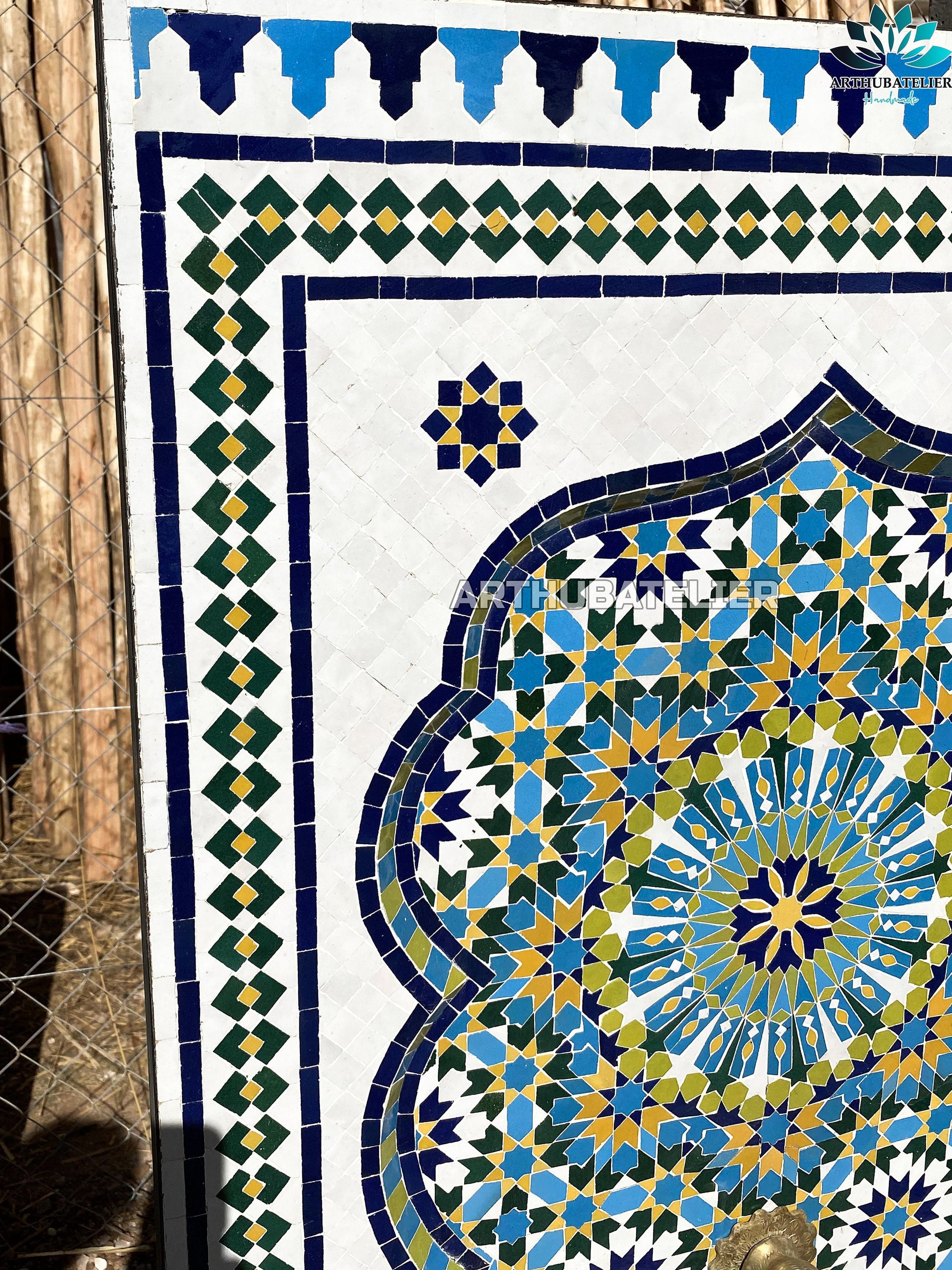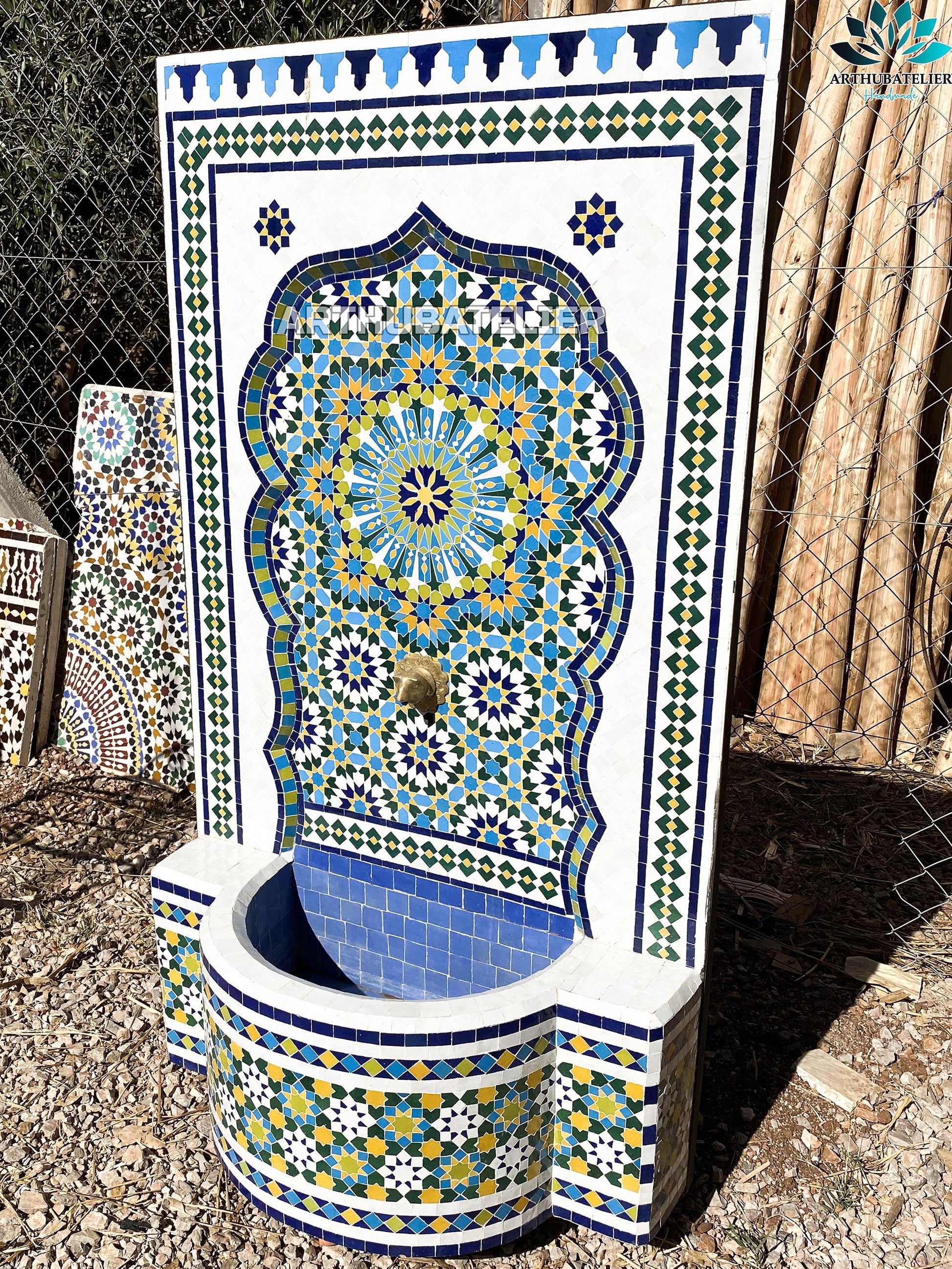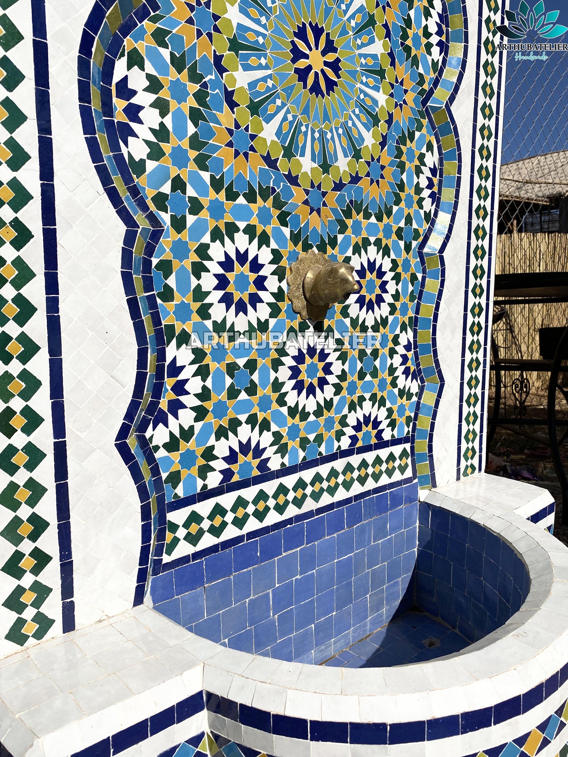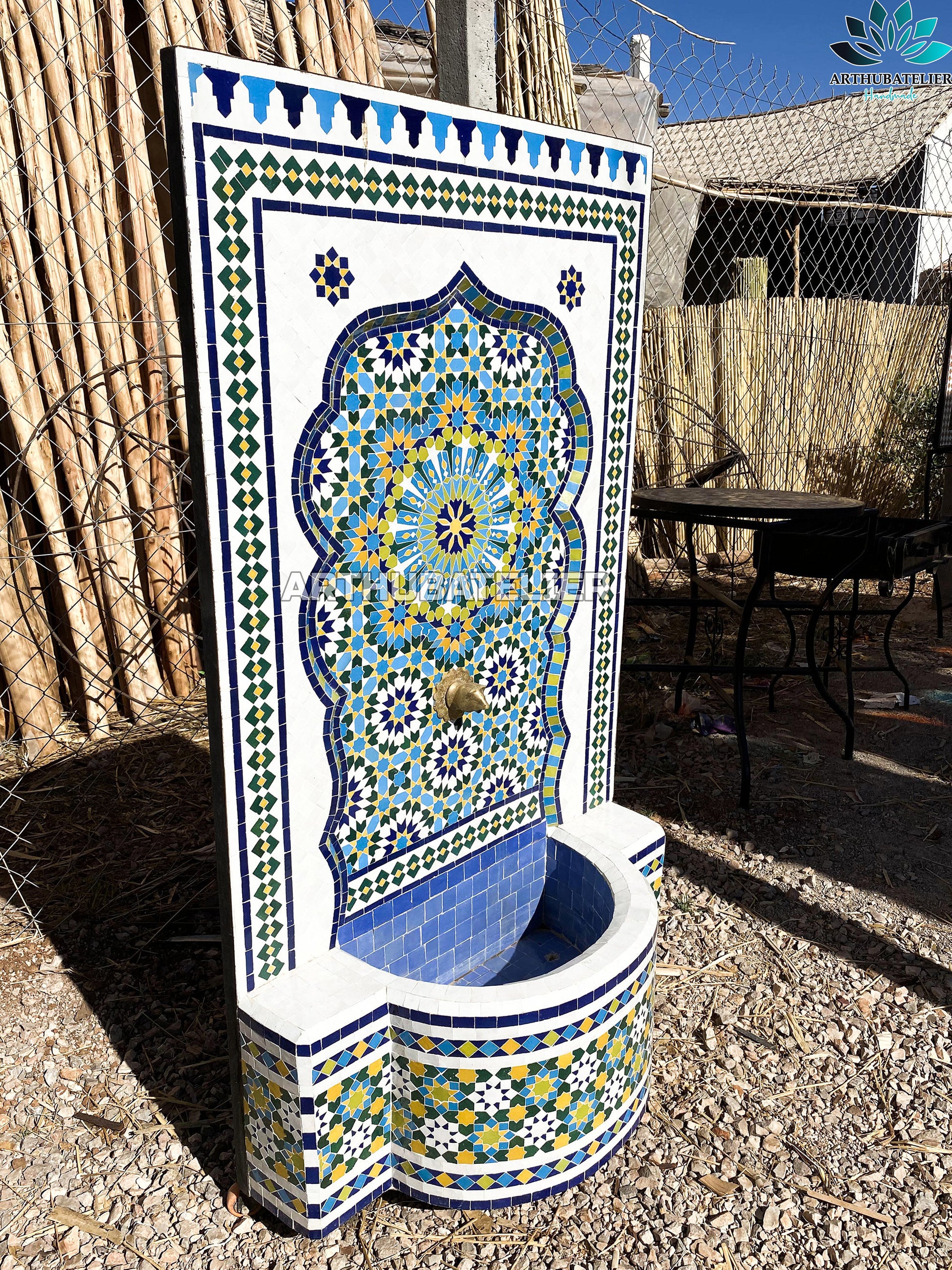 Enhance your space with the artisanal beauty of this Moroccan Zellige fountain, a true masterpiece of Moroccan craftsmanship. Featuring a breathtaking blue, yellow, and white tile pattern, this fountain is handmade using traditional techniques and high-quality materials.
