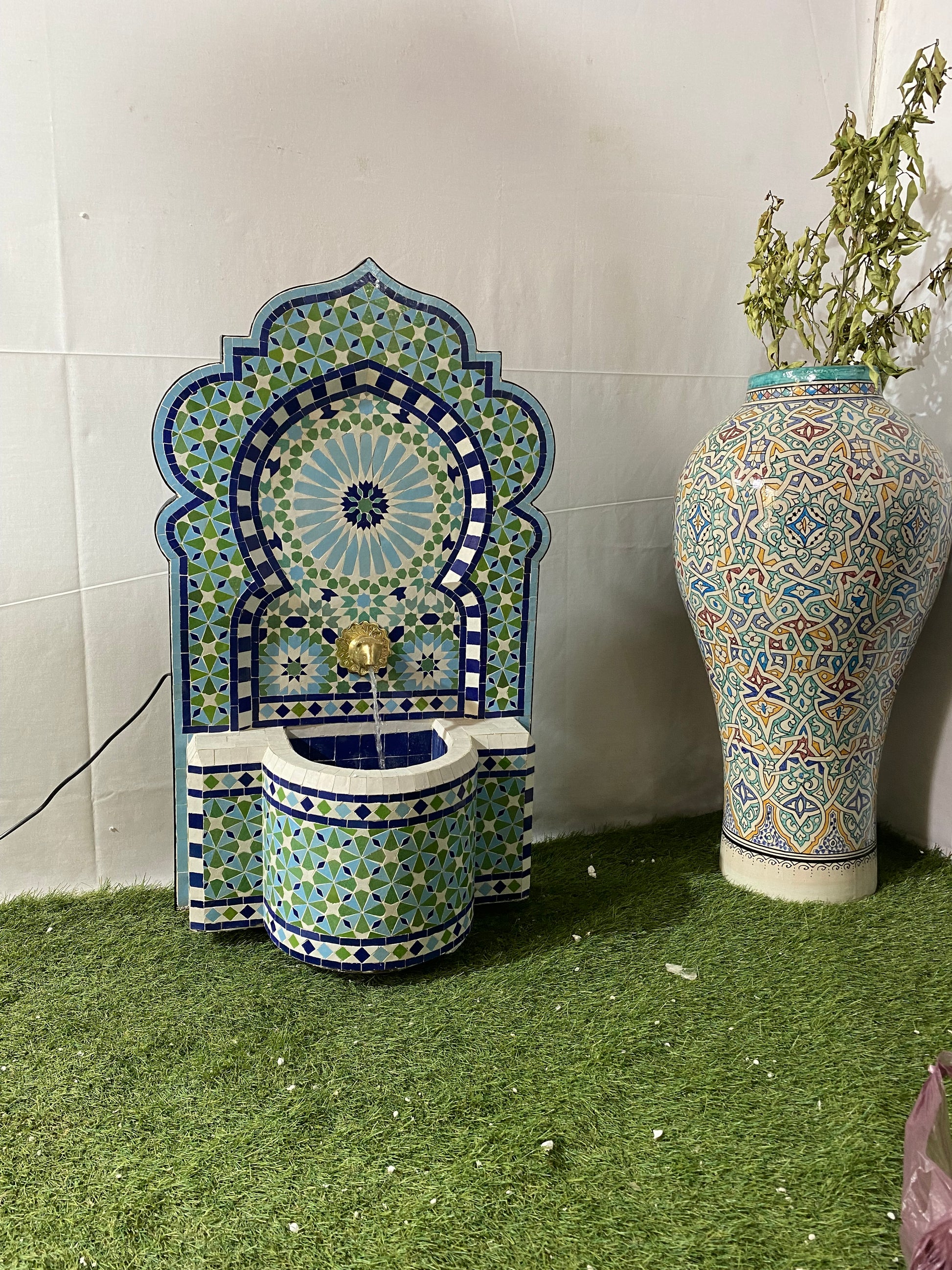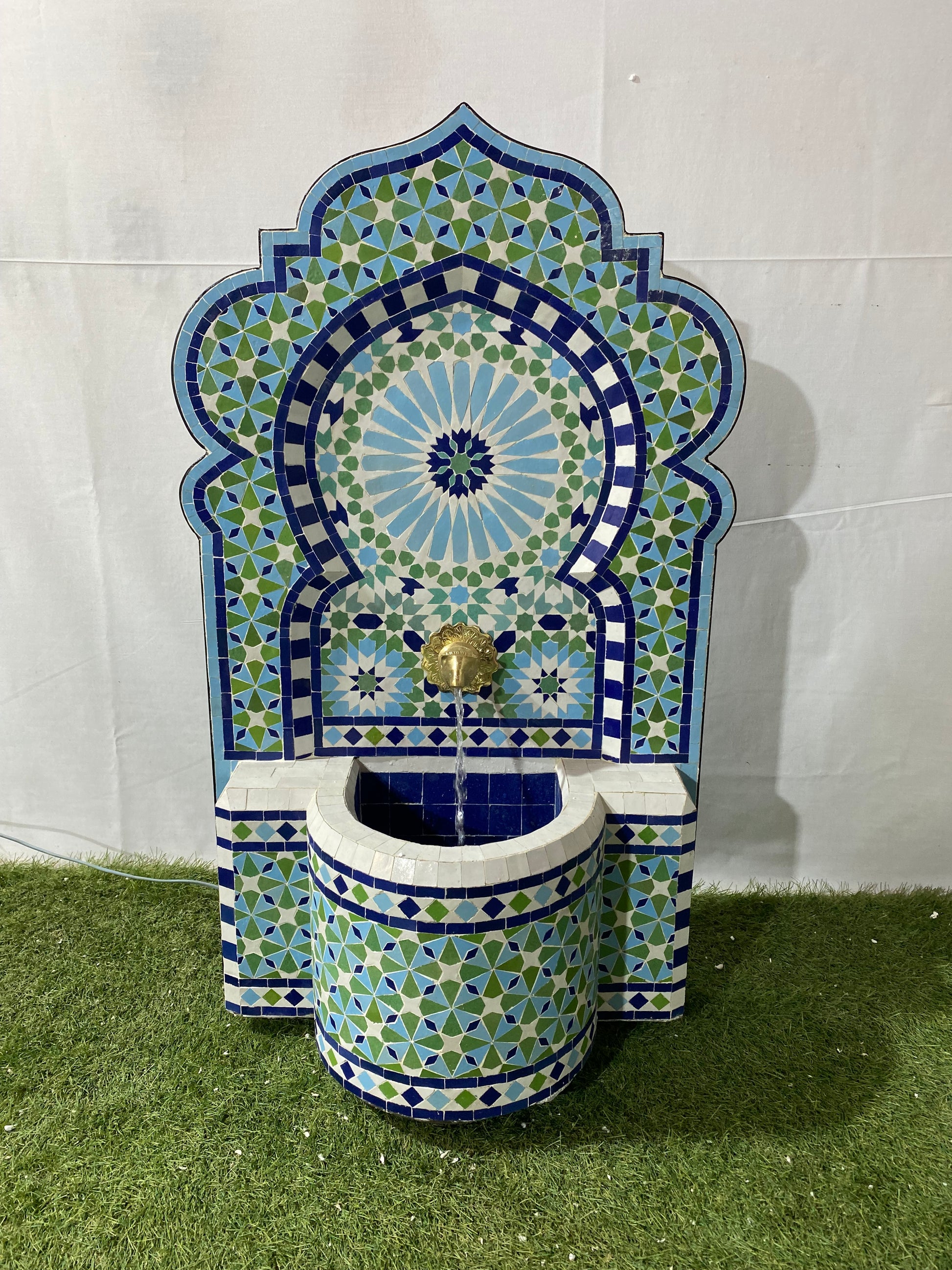 Bring the beauty of Moroccan craftsmanship into your home or garden with this breathtaking Zellige mosaic fountain. Featuring an intricate green and blue geometric design, a handcrafted brass tap, and an arch-shaped silhouette, this fountain is a perfect blend of tradition and elegance.