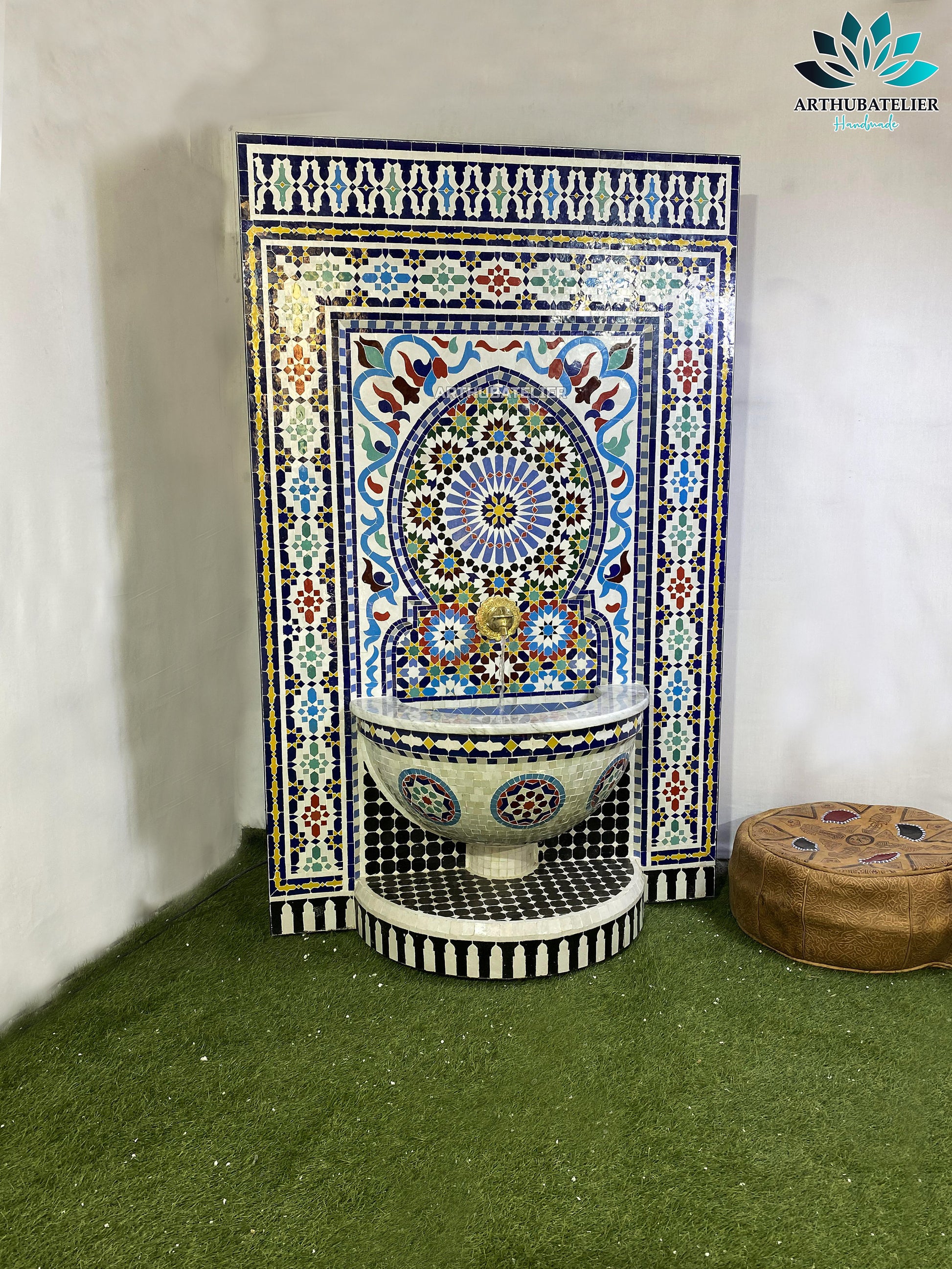 This breathtaking Moroccan mosaic fountain is a masterpiece of traditional craftsmanship, featuring hand-cut Zellige tiles arranged in intricate geometric and floral motifs. The combination of vibrant blues, warm yellows, rich blacks, and pure whites makes this fountain a stunning focal point for any patio, courtyard, or interior space.