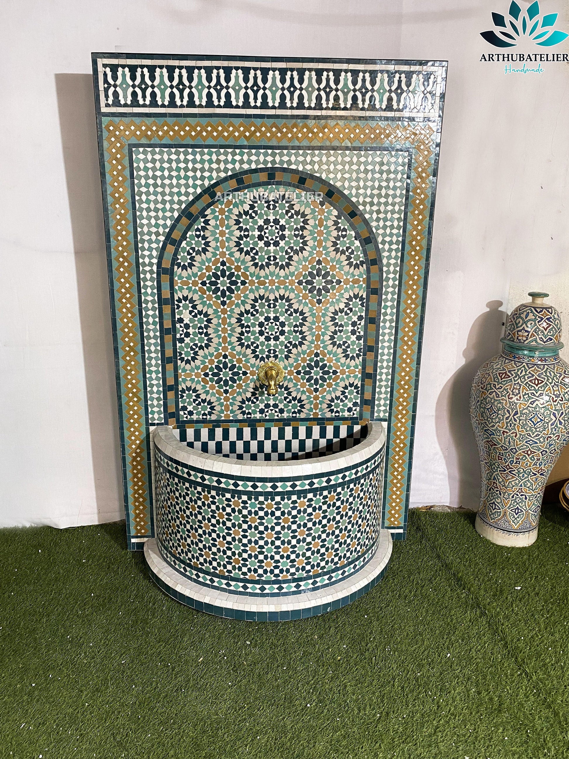 This Andalusian-inspired Moroccan fountain is a harmonious blend of traditional Moorish artistry and modern elegance. Featuring a stunning mosaic of hand-cut Zellige tiles in soft greens, golds, and whites, this fountain is a true statement of luxury.