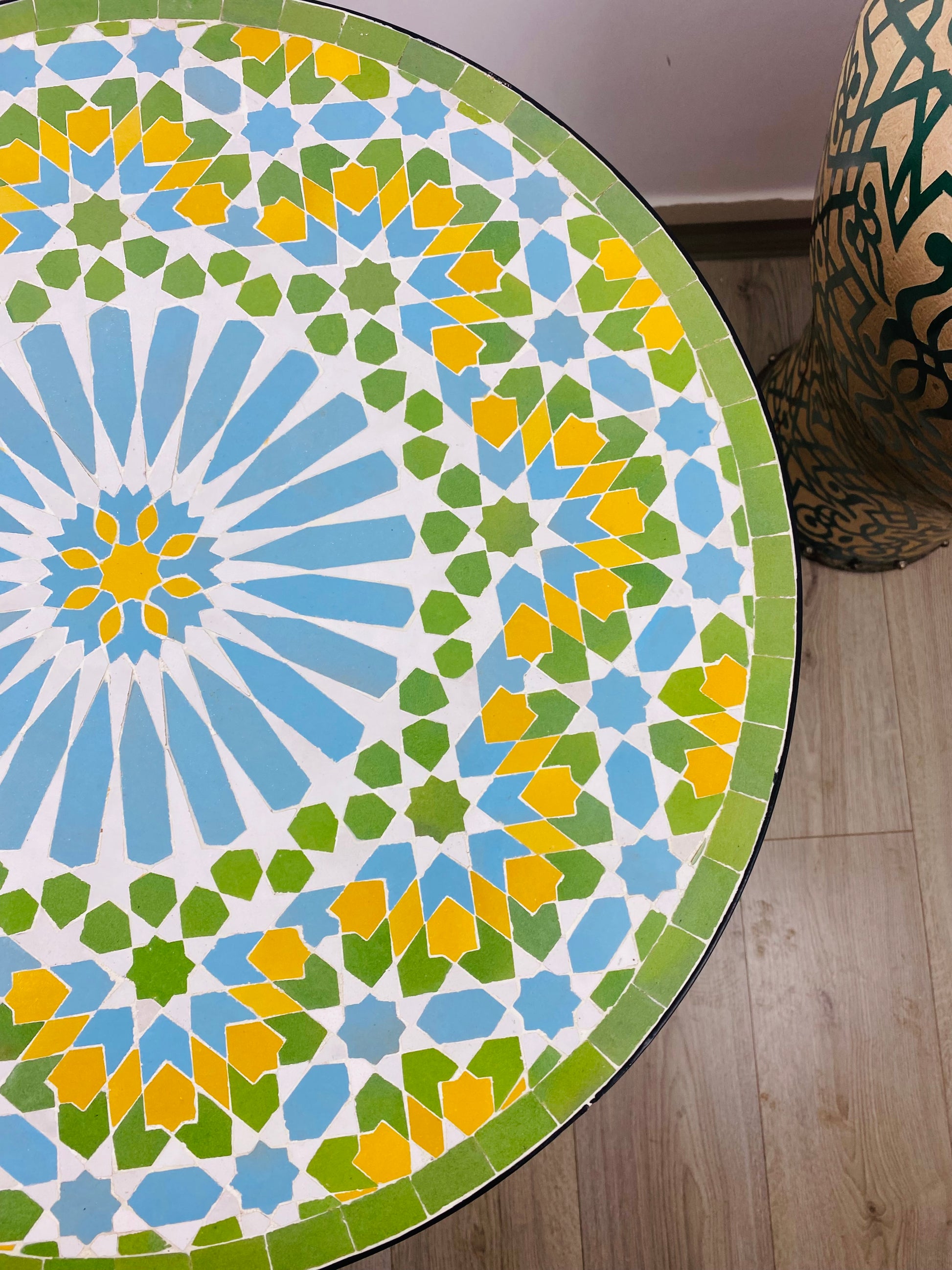 This beautifully handcrafted Moroccan Zellige mosaic side table radiates a sense of freshness and light, with its delicate blue, yellow, green, and white geometric pattern. The intricate sunburst-inspired design at the center is surrounded by a soft yet vibrant mix of colors, framed by a lively green border that enhances its unique aesthetic.