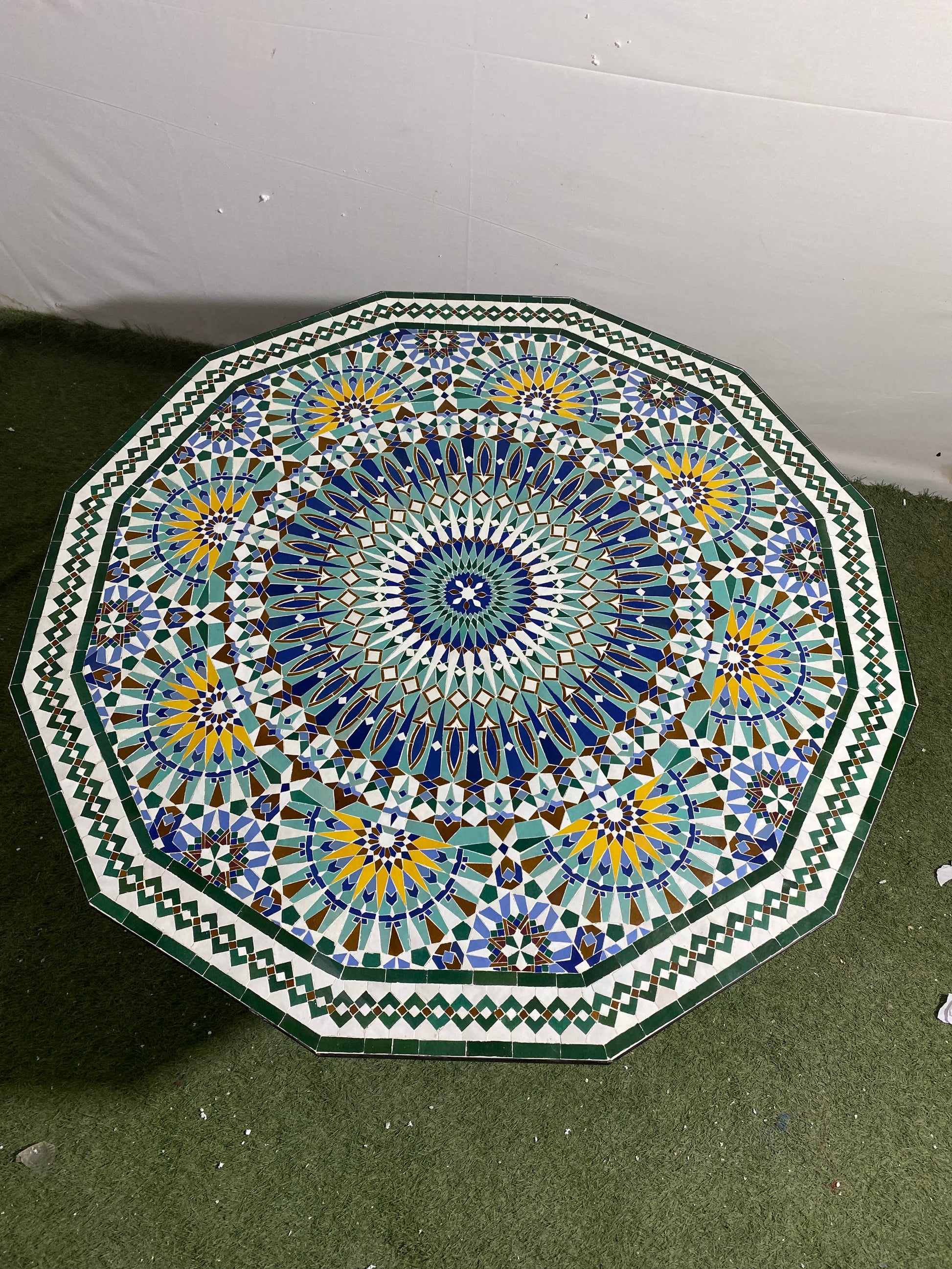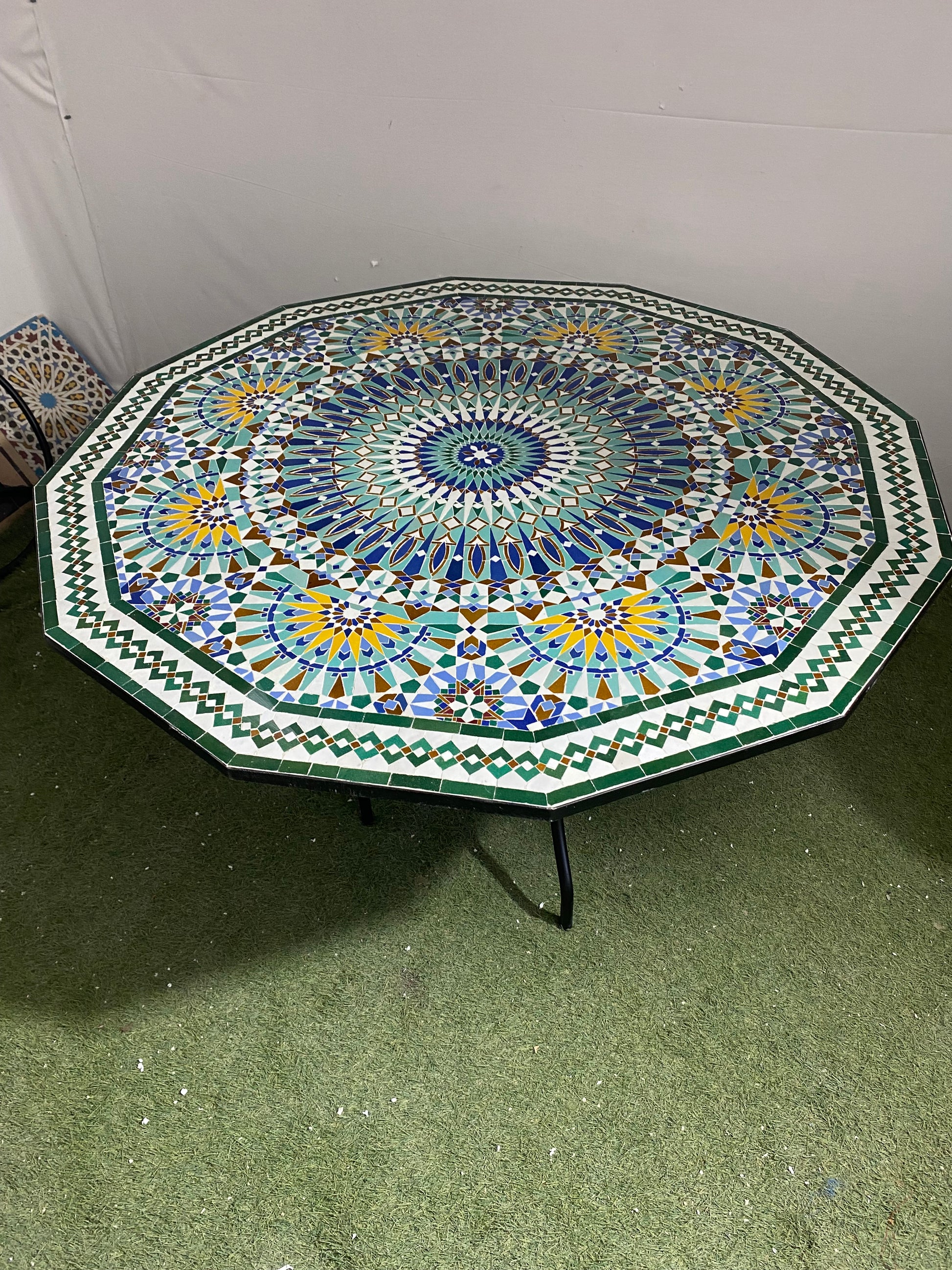 This magnificent handcrafted Moroccan Zellige mosaic table showcases a mesmerizing octagonal design, bringing a unique touch of Moroccan artistry to any space. The intricate starburst and floral patterns in deep blue, turquoise, emerald green, golden yellow, and white create a striking visual display, while the bold green and white geometric border enhances its distinctive shape. This table is a statement of luxury, perfect for adding character to your home or outdoor setting.