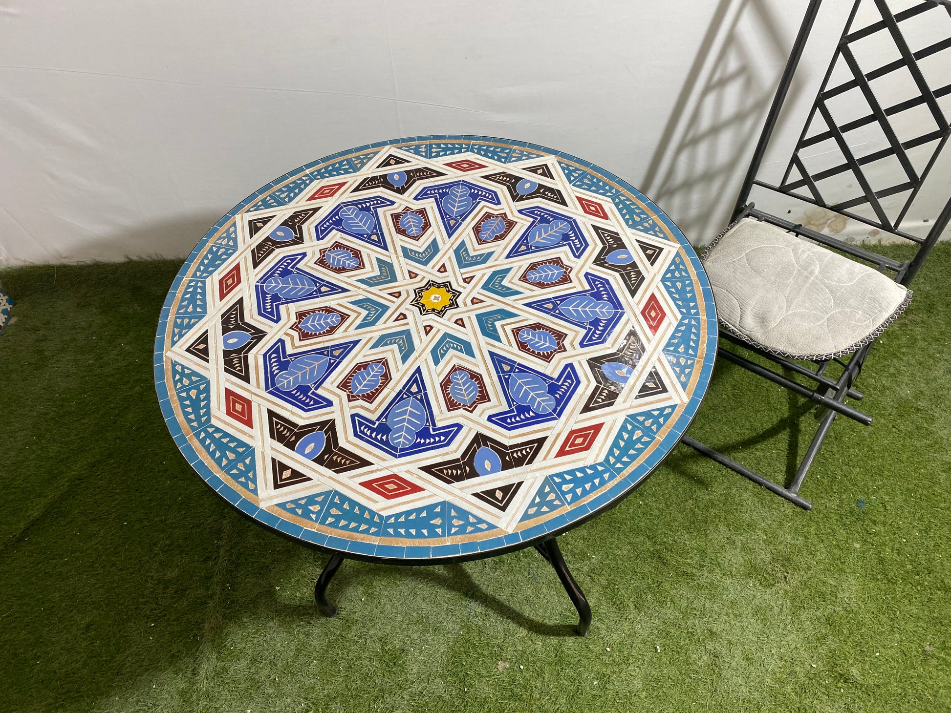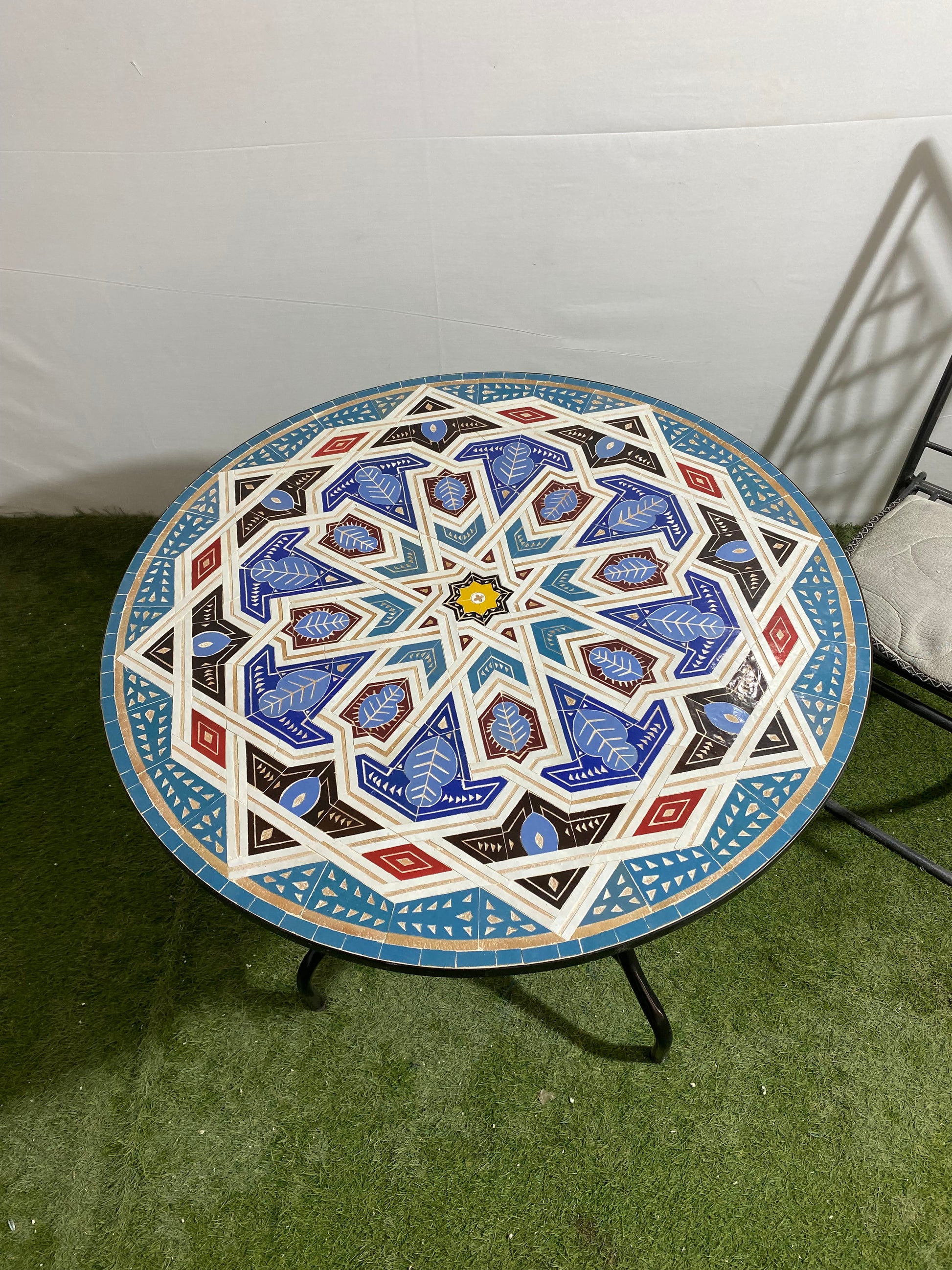 This handcrafted Moroccan Zellige mosaic table is a true masterpiece, featuring a bold tribal-inspired geometric pattern in deep blue, brown, red, turquoise, white, and golden yellow. The intricate starburst design, accented with delicate leaf motifs and symmetrical patterns, evokes the rich heritage of Moroccan and Berber artistry. The decorative blue and red border enhances the overall visual impact, making it a striking statement piece.