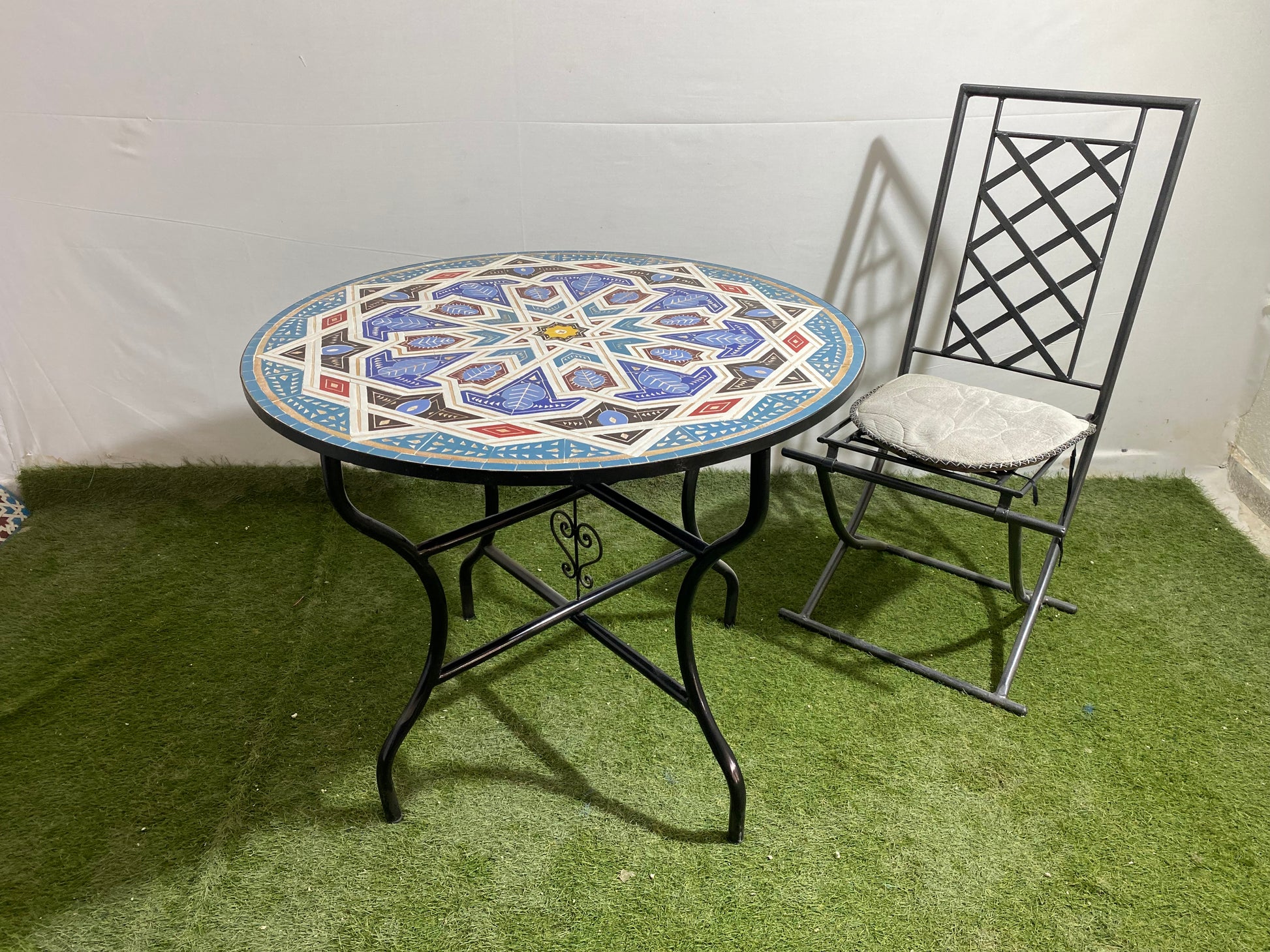 - TABLES : Mosaic, tiles, Clay, Iron, legs cap, metal base.