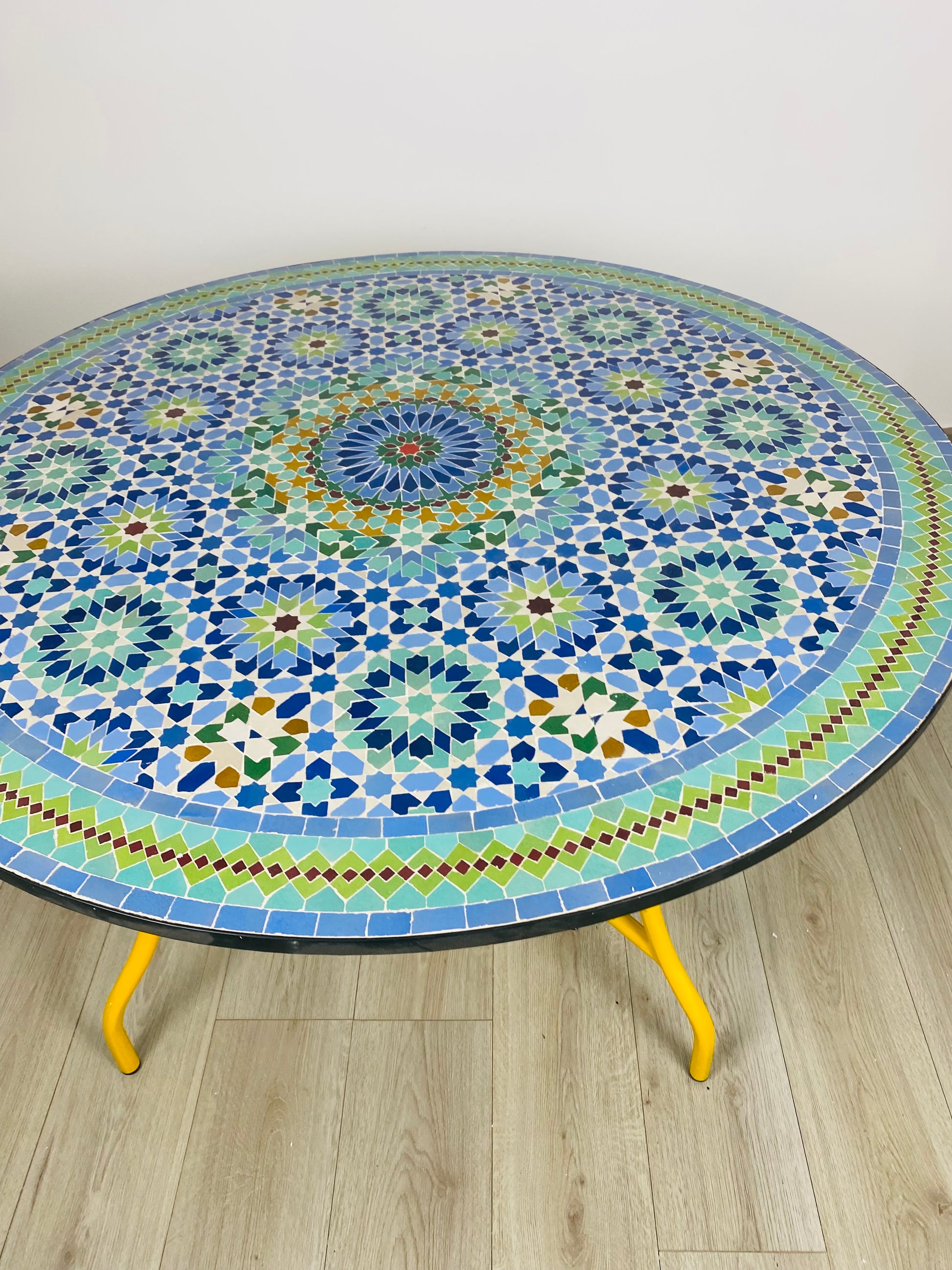 Immerse yourself in the artistry of Moroccan craftsmanship with this breathtaking Zellige mosaic table, radiating the serene beauty of ocean-inspired hues. The intricate design features vivid shades of blue, turquoise, soft green, yellow, and white, forming a mesmerizing geometric pattern that draws the eye to its detailed central motif. The vibrant yellow iron legs add a striking contrast, giving this piece a unique and lively character.