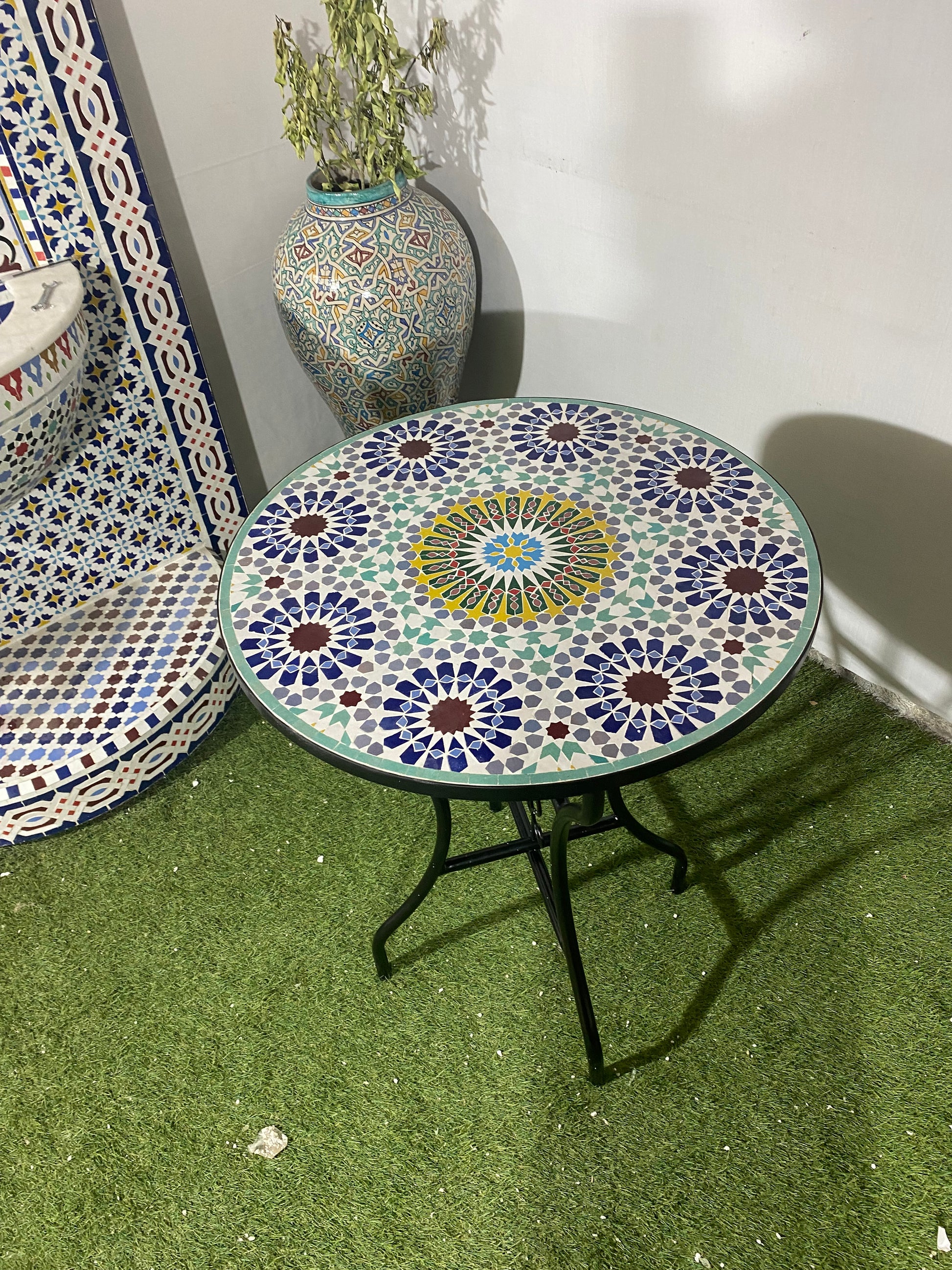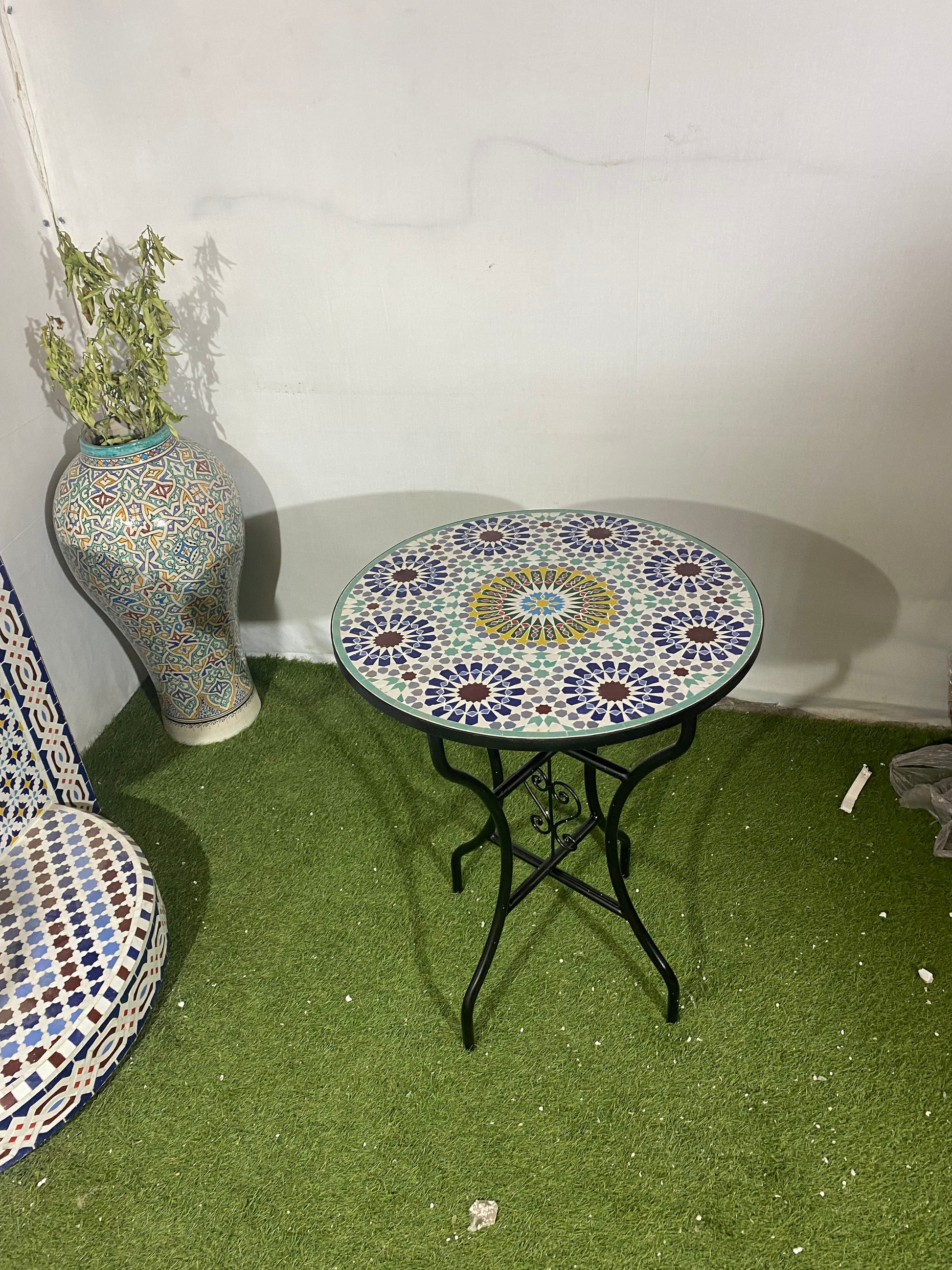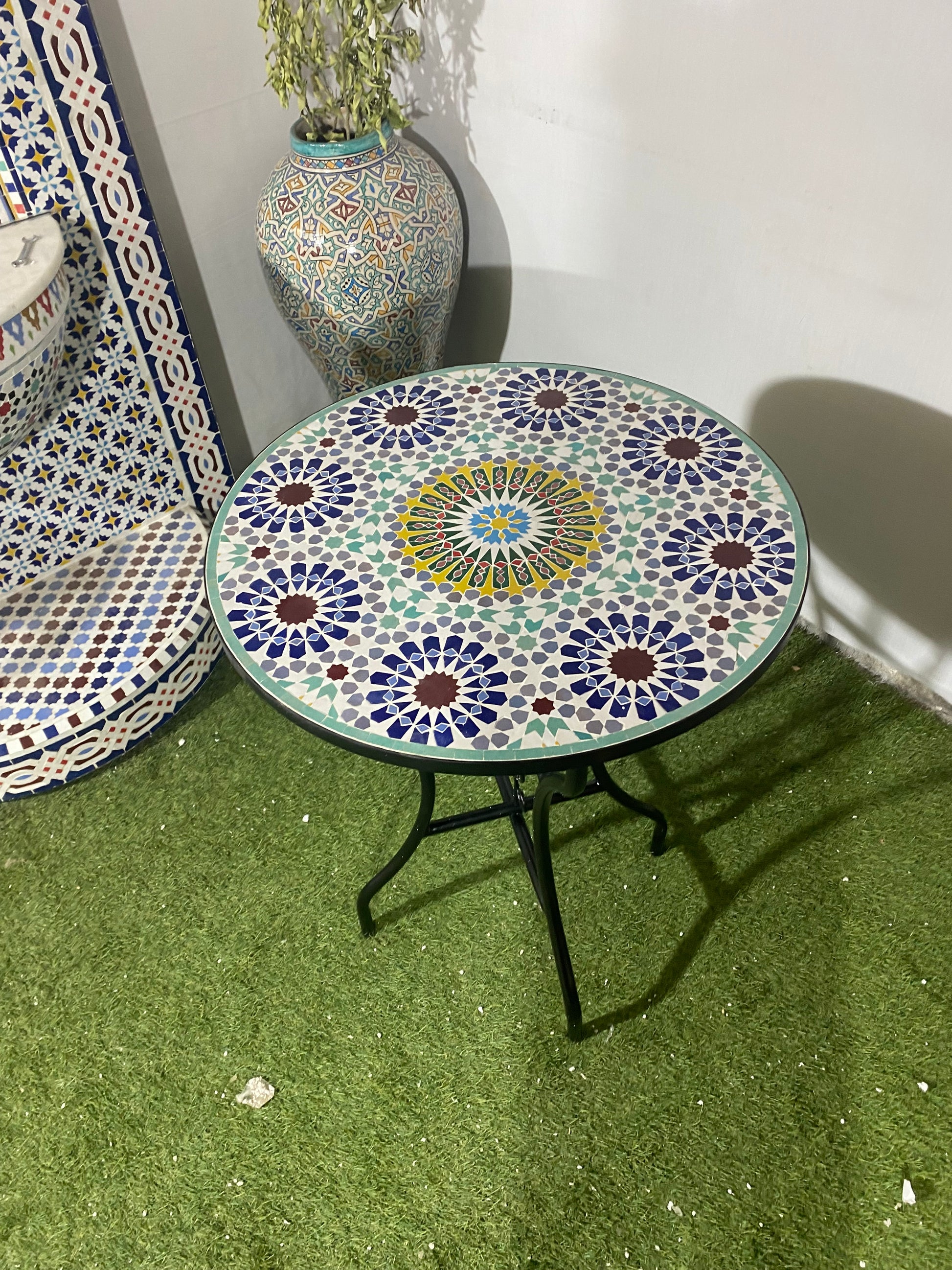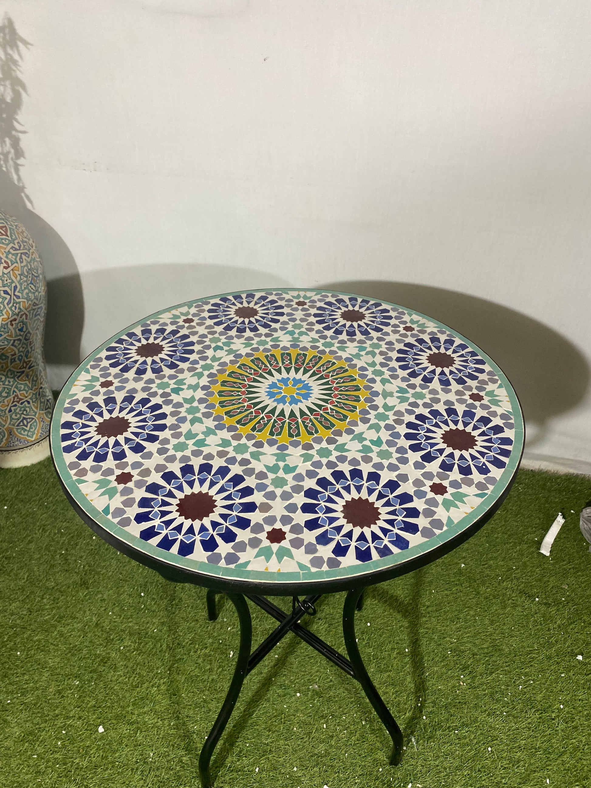 This stunning handcrafted Moroccan Zellige table features an intricate geometric floral mosaic design, beautifully blending shades of deep blue, turquoise, yellow, and earthy tones. A perfect statement piece that adds an authentic touch of Moroccan artistry to any setting.