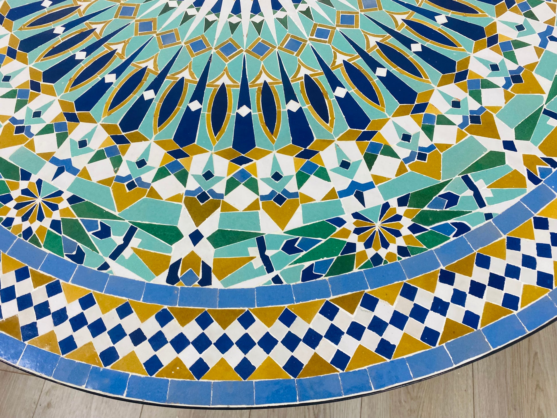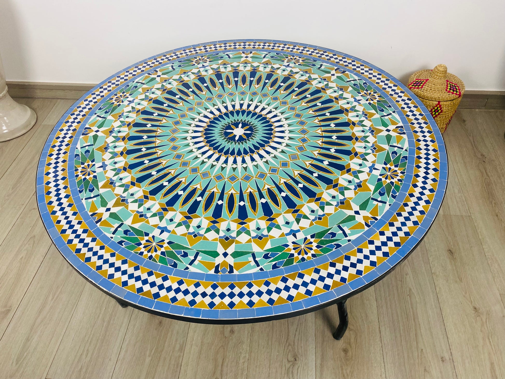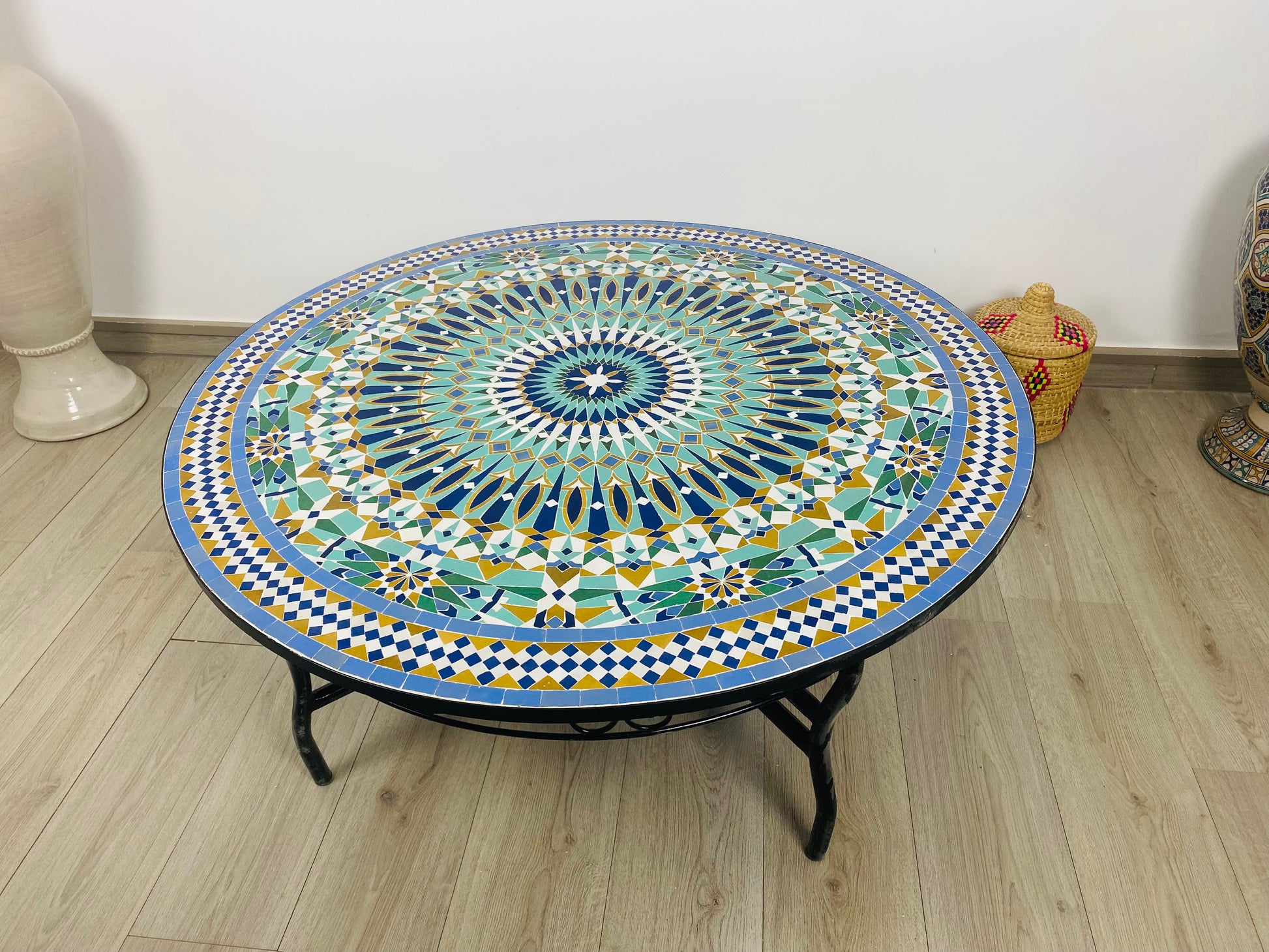 This exquisite handcrafted Moroccan Zellige coffee table showcases a mesmerizing starburst pattern in shades of deep blue, turquoise, emerald green, golden yellow, and white, creating a vibrant and intricate mosaic. The detailed craftsmanship reflects the rich heritage of Moroccan design, making it a statement piece for any space. The low-profile black wrought iron base enhances its elegance, offering stability and a touch of sophistication.