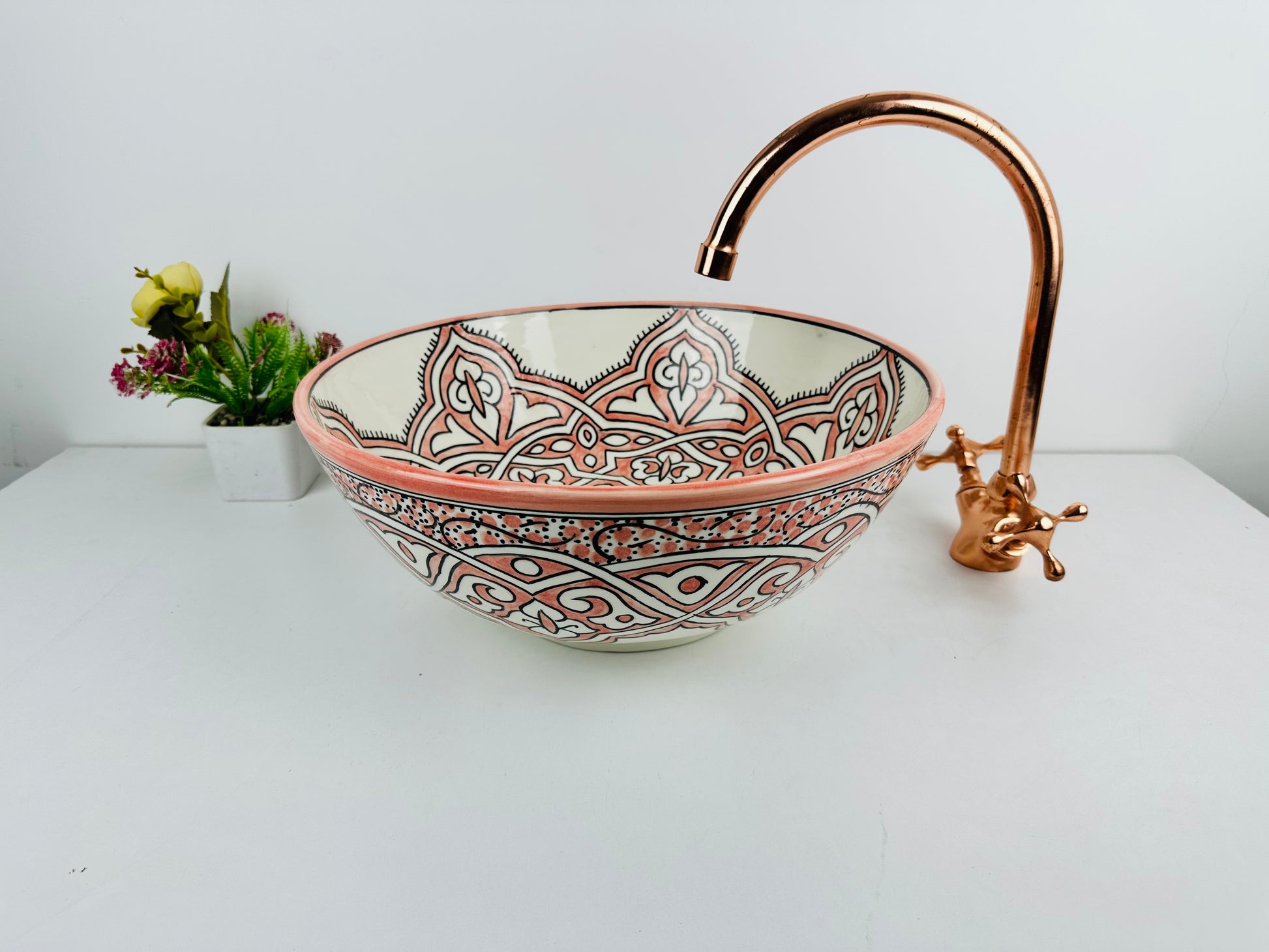 Elevate your bathroom decor with the warmth and charm of the Terra Bloom Vessel Sink, showcasing intricate floral and geometric hand-painted patterns in earthy terracotta tones. The combination of delicate artistry and warm hues makes this sink a perfect fit for bohemian, rustic, or Mediterranean-style interiors. Its smooth glazed finish ensures durability and easy cleaning while adding artisanal character to your space.