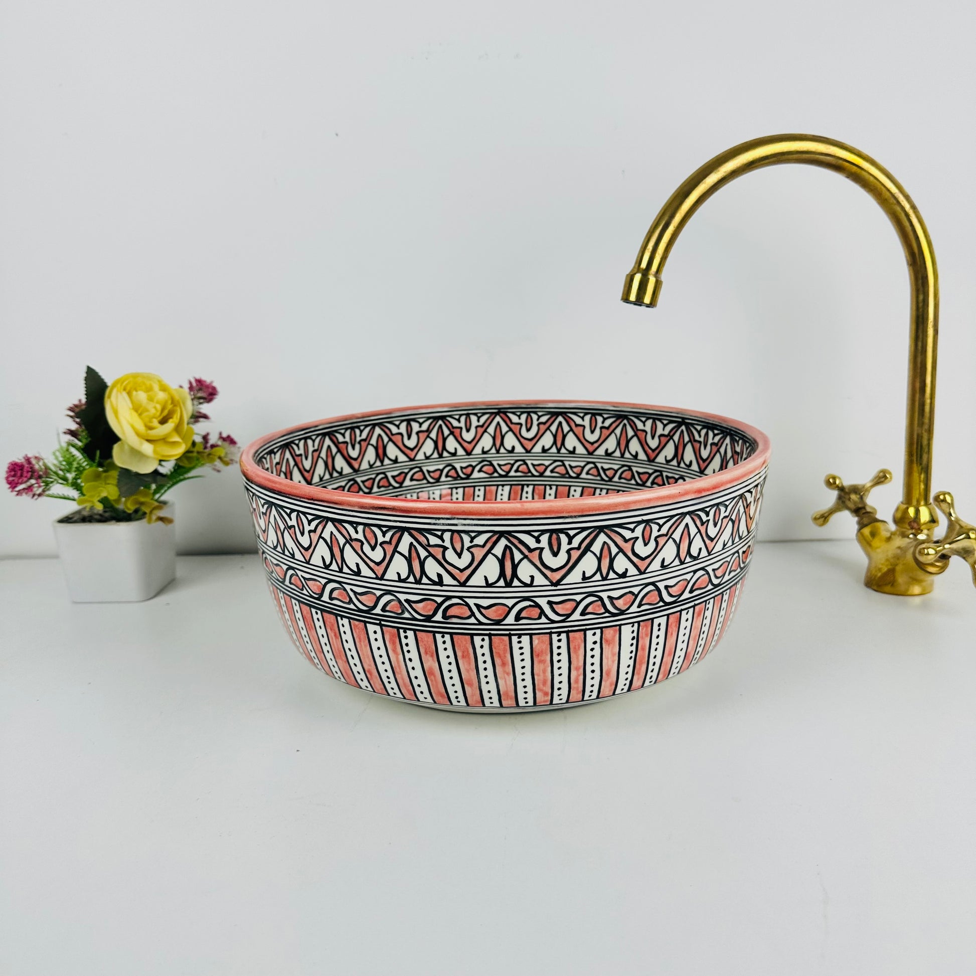 Infuse warmth and artisanal charm into your bathroom with the Terracotta Sunburst Vessel Sink, showcasing hand-painted earthy tones and intricate geometric patterns. The vibrant terracotta hue contrasts beautifully with the detailed black-and-white designs, while the gold drain accent adds an elegant touch. Ideal for rustic, Mediterranean, or bohemian-inspired interiors.