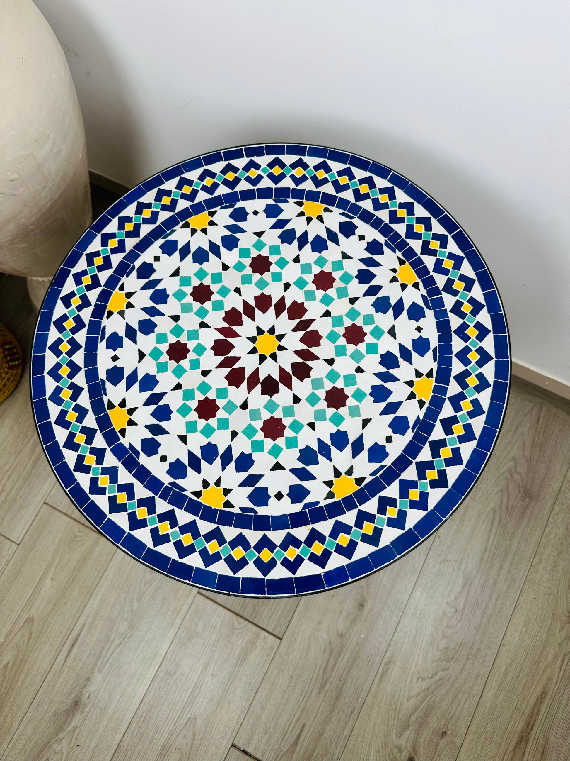 The Celestial Harmony Mosaic Table is a stunning fusion of traditional Moroccan craftsmanship and timeless elegance. Its intricate starburst pattern, crafted in deep blue, golden yellow, earthy brown, and crisp white, creates a mesmerizing display of color and symmetry. Encircled by a bold navy border with geometric detailing, this table is both a functional piece and a work of art.