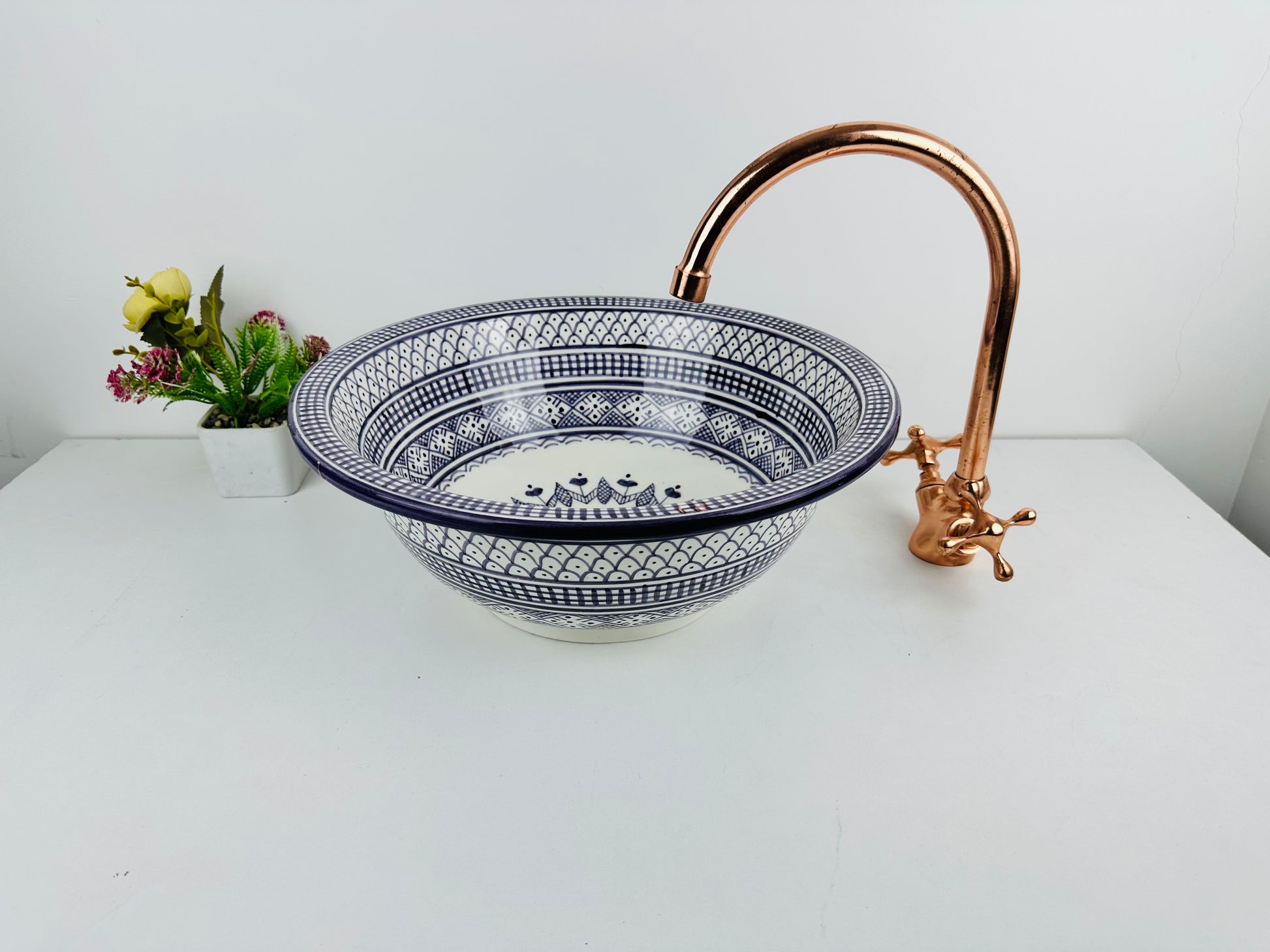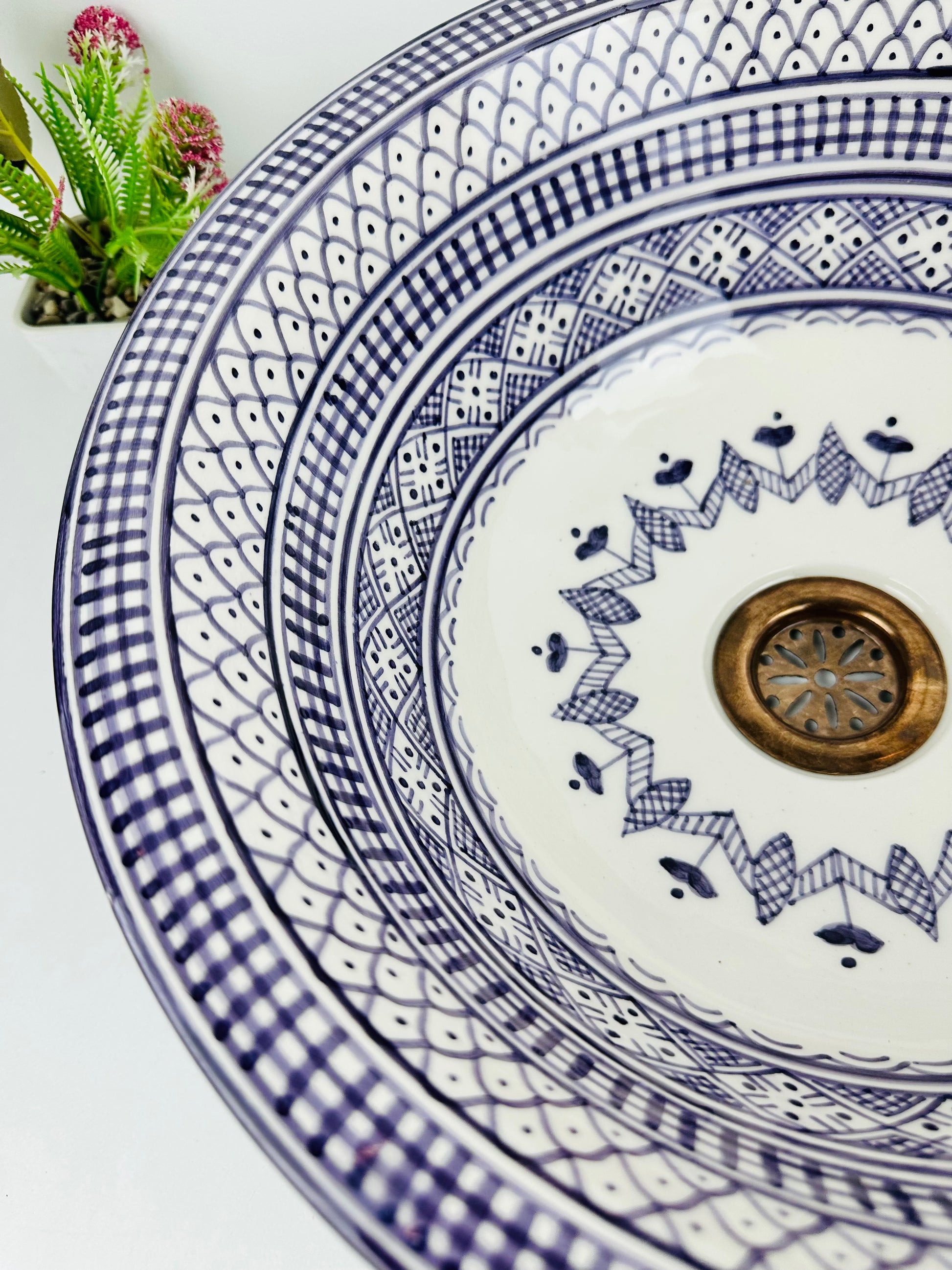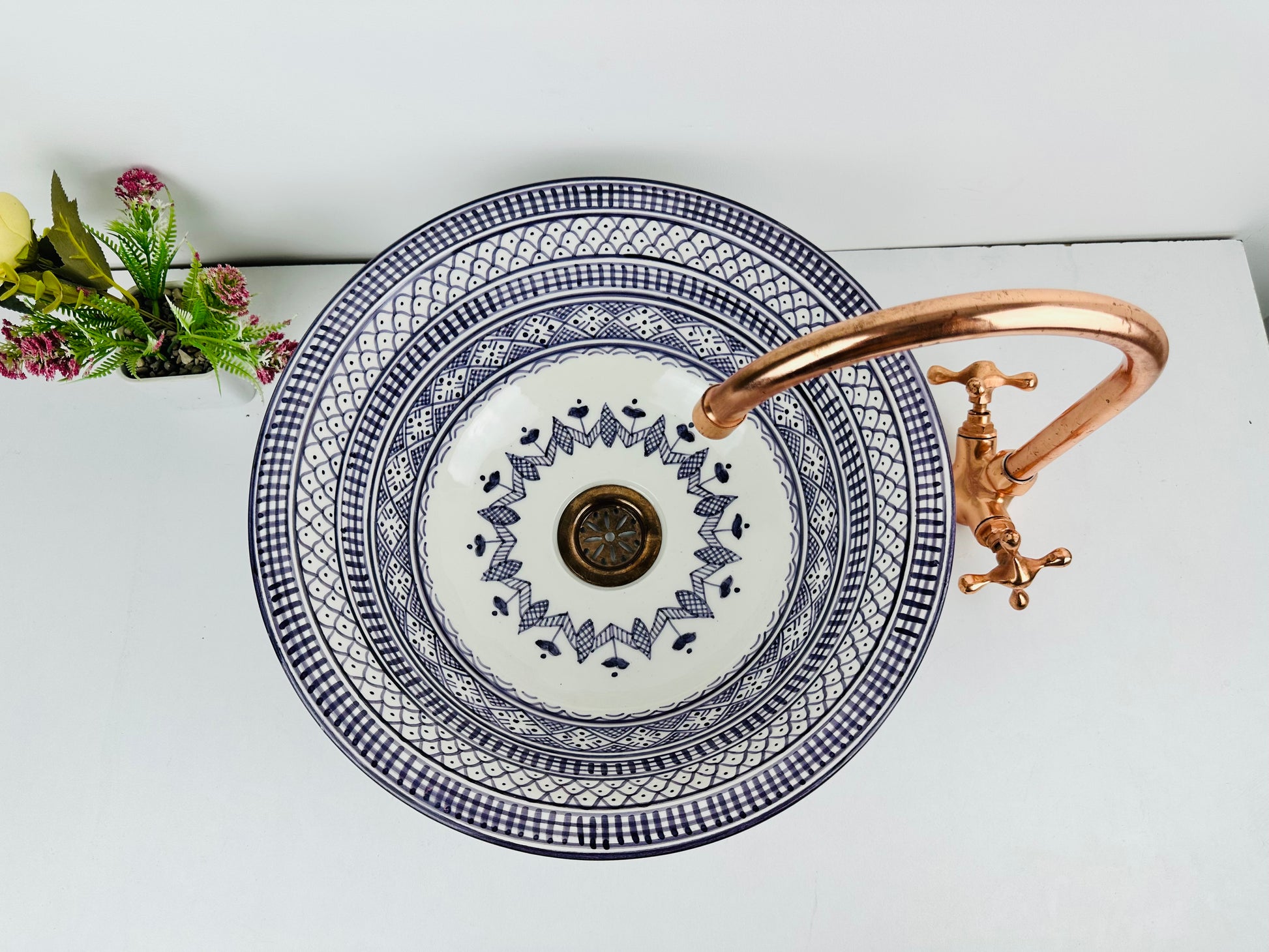 Introduce timeless elegance to your bathroom with the Royal Indigo purple Vessel Sink, showcasing intricate hand-painted patterns in rich indigo and soft cream hues. Inspired by traditional Moroccan craftsmanship, this sink blends classic artistry with modern functionality, making it ideal for eclectic or Mediterranean-themed spaces. The smooth, glazed finish ensures durability and easy cleaning while adding a sophisticated touch.