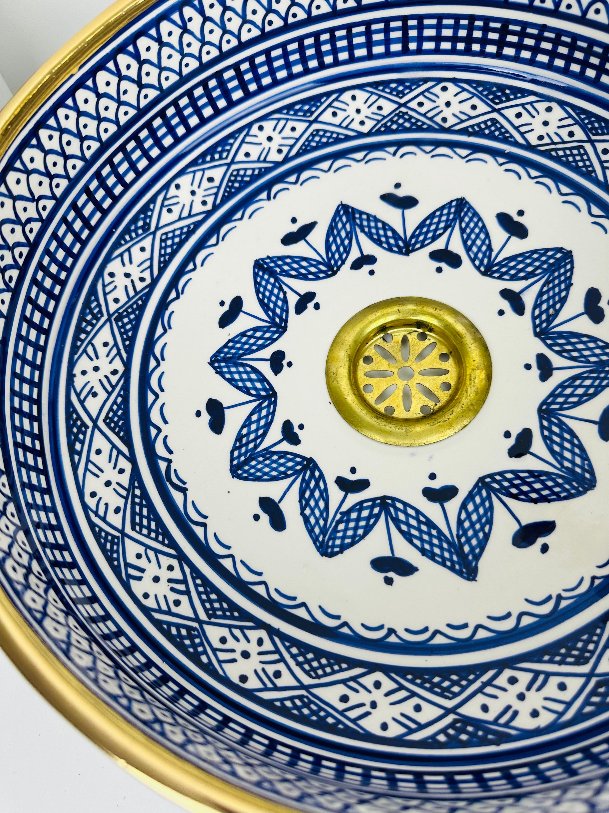 Infuse Moroccan charm into your bathroom, hotel, or kitchen space with this stunning hand-painted navy blue ceramic vessel sink. Its intricate geometric patterns are perfectly complemented by a brass rim and a matching brass-finished drain, adding luxury and timeless appeal.