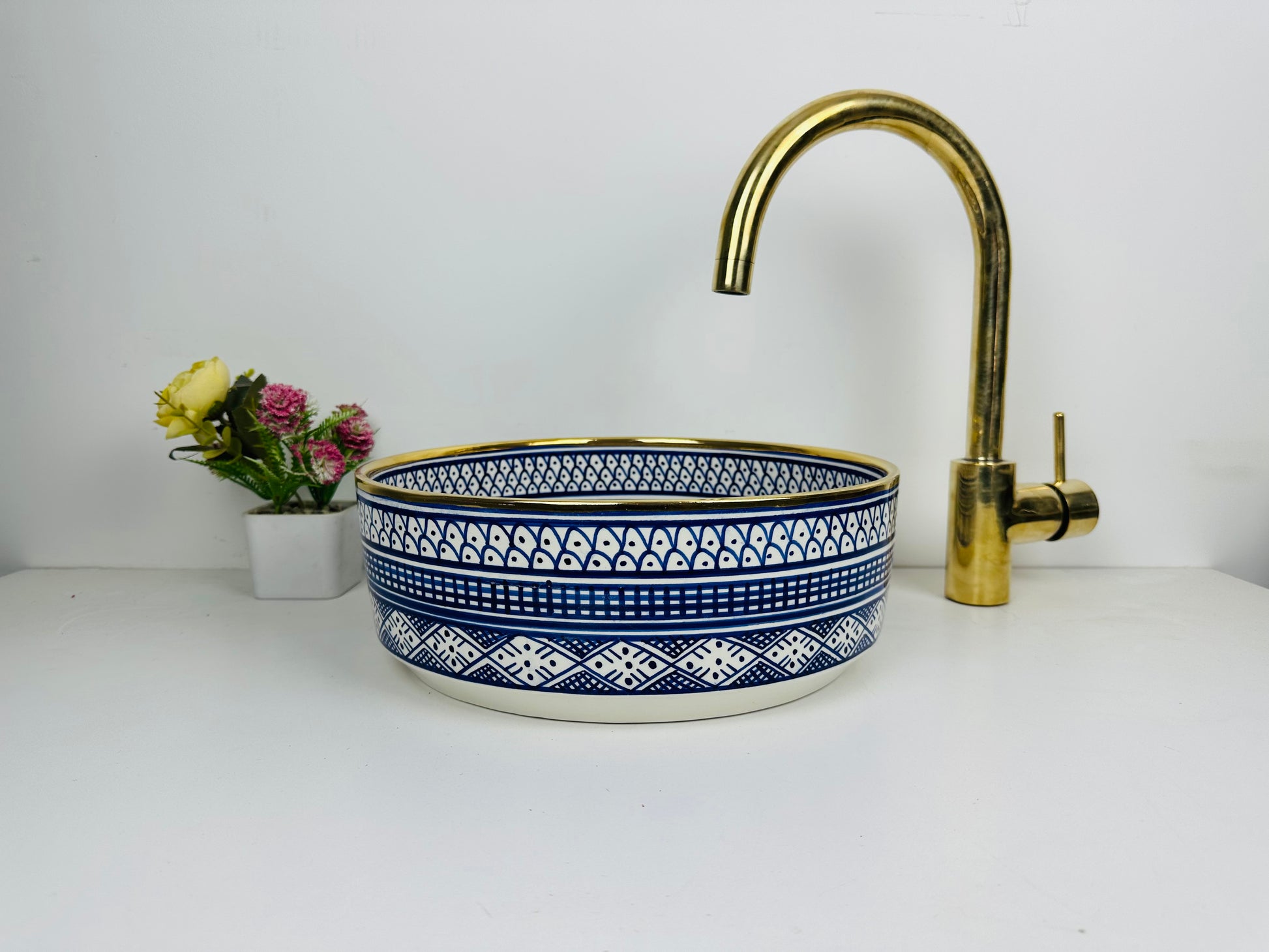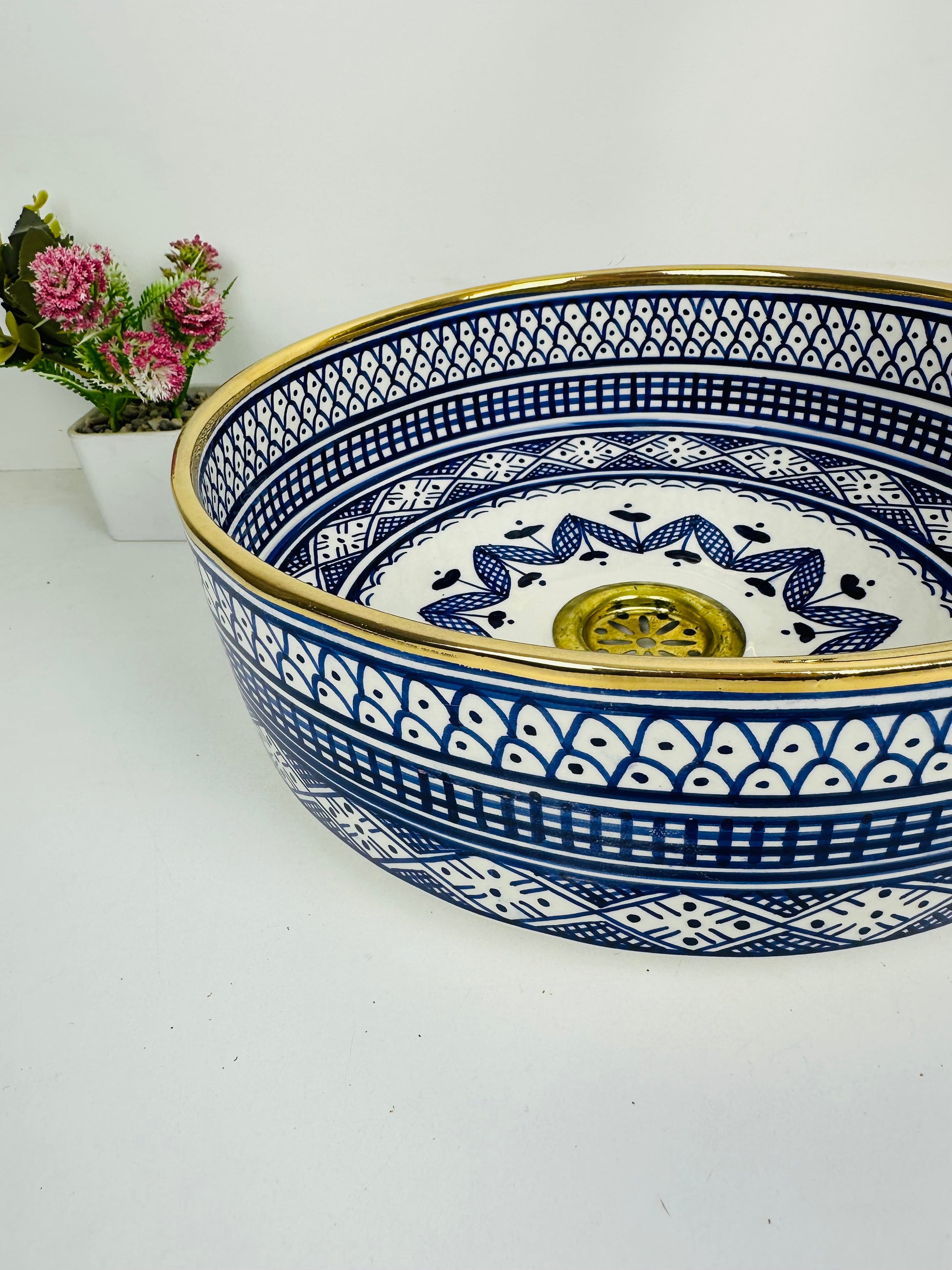 Royal Navy 14K gold : Handcrafted Ceramic Sink with Traditional Hand-Painted Navy Blue Design