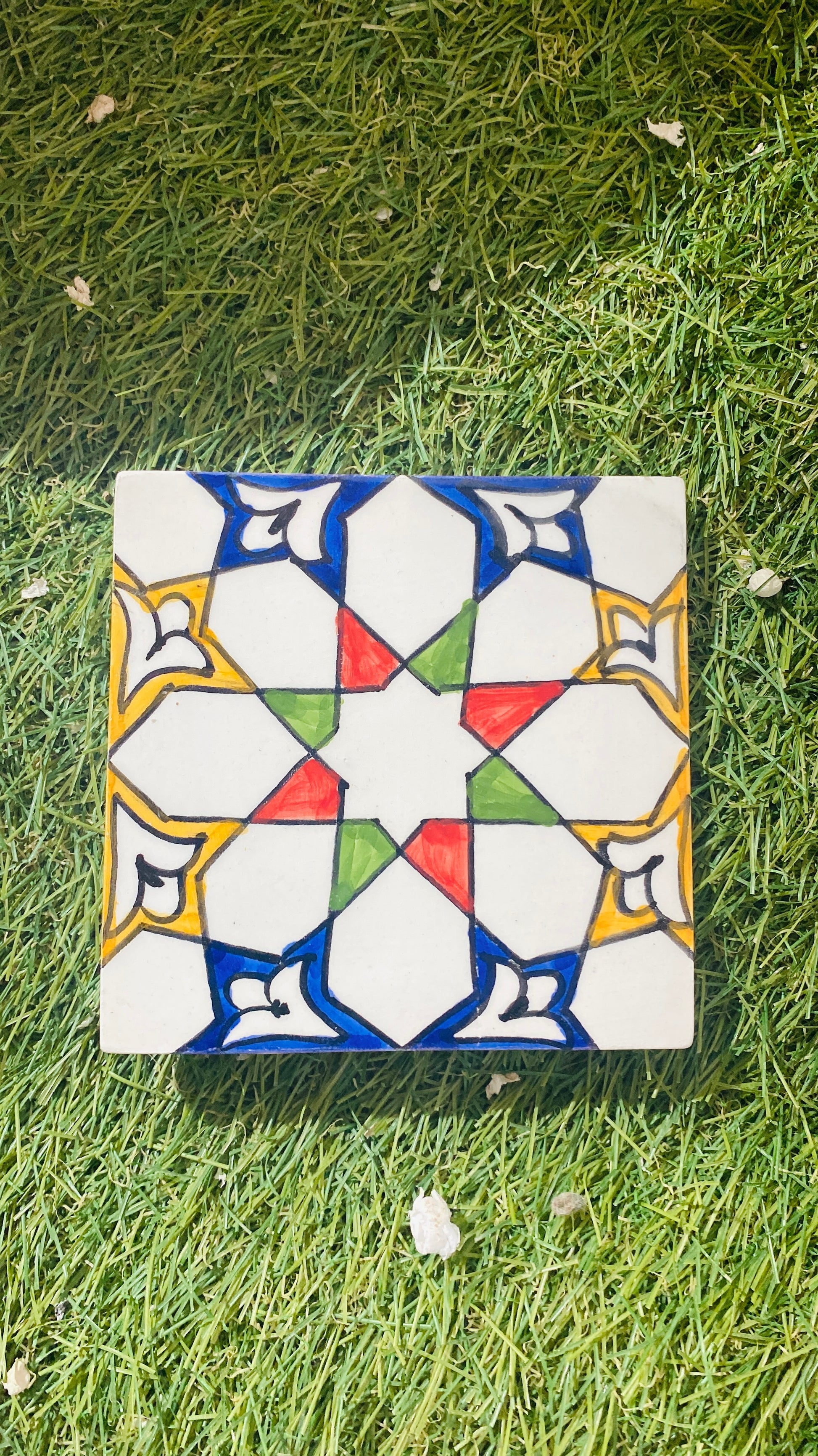 The Ethereal Star Moroccan Zellige Tile features an elegant eight-pointed star pattern, a hallmark of traditional Moroccan design. The hand-painted details in vibrant red, green, blue, and golden yellow contrast beautifully against the pristine white background, creating a harmonious and symmetrical aesthetic. Handmade and hand-painted, each tile reflects the dedication of skilled artisans, making it a unique and timeless decorative element.