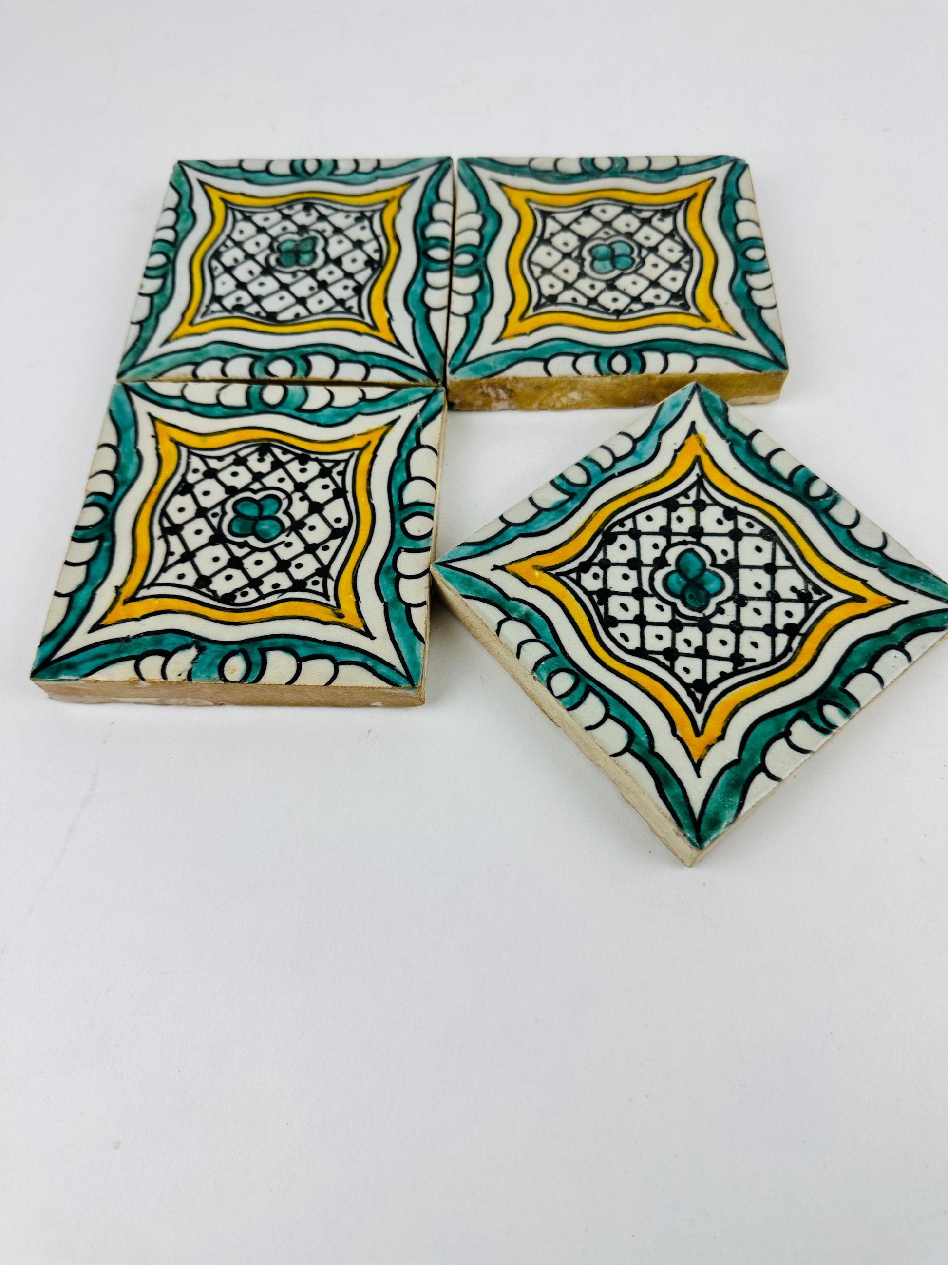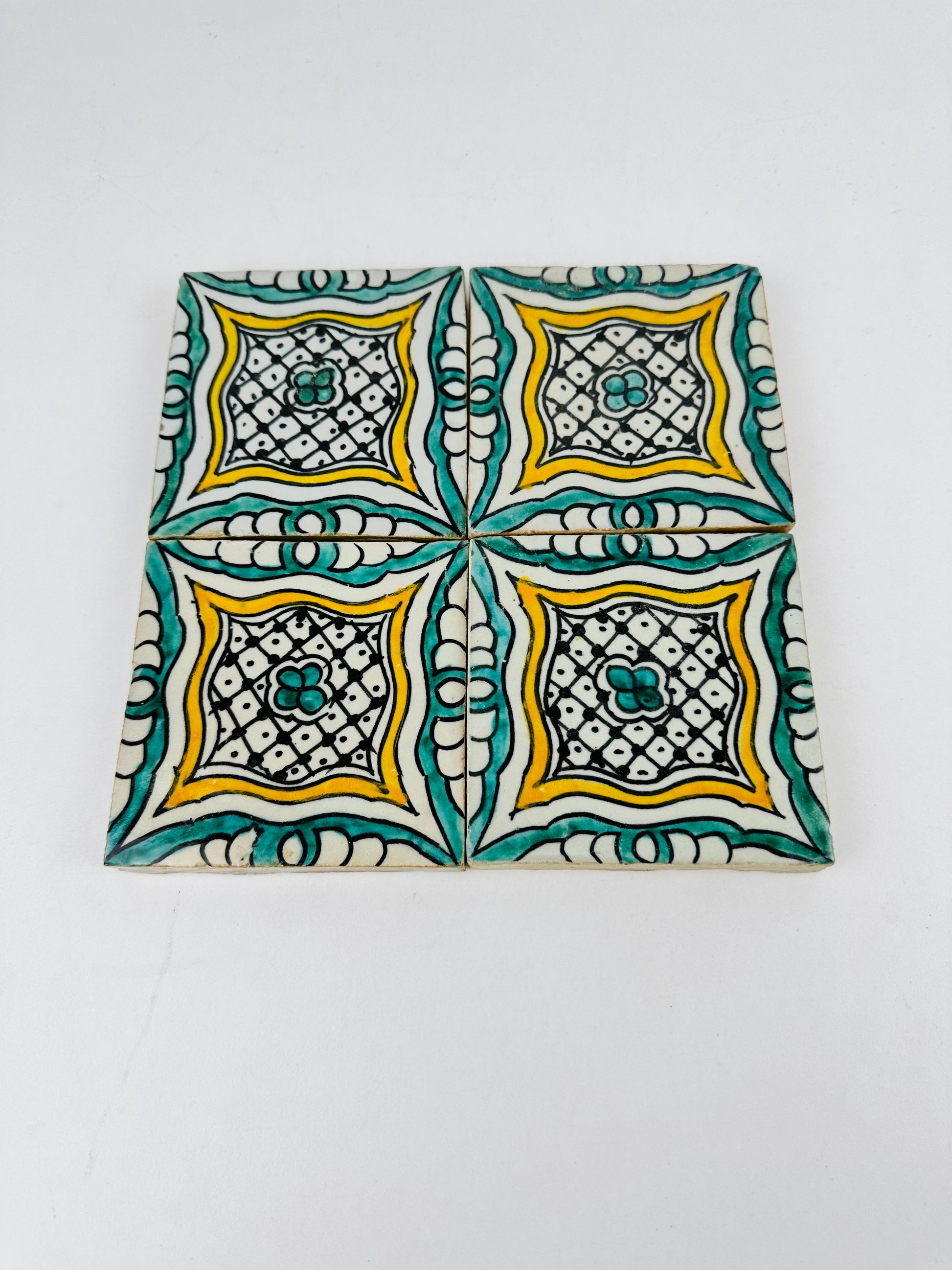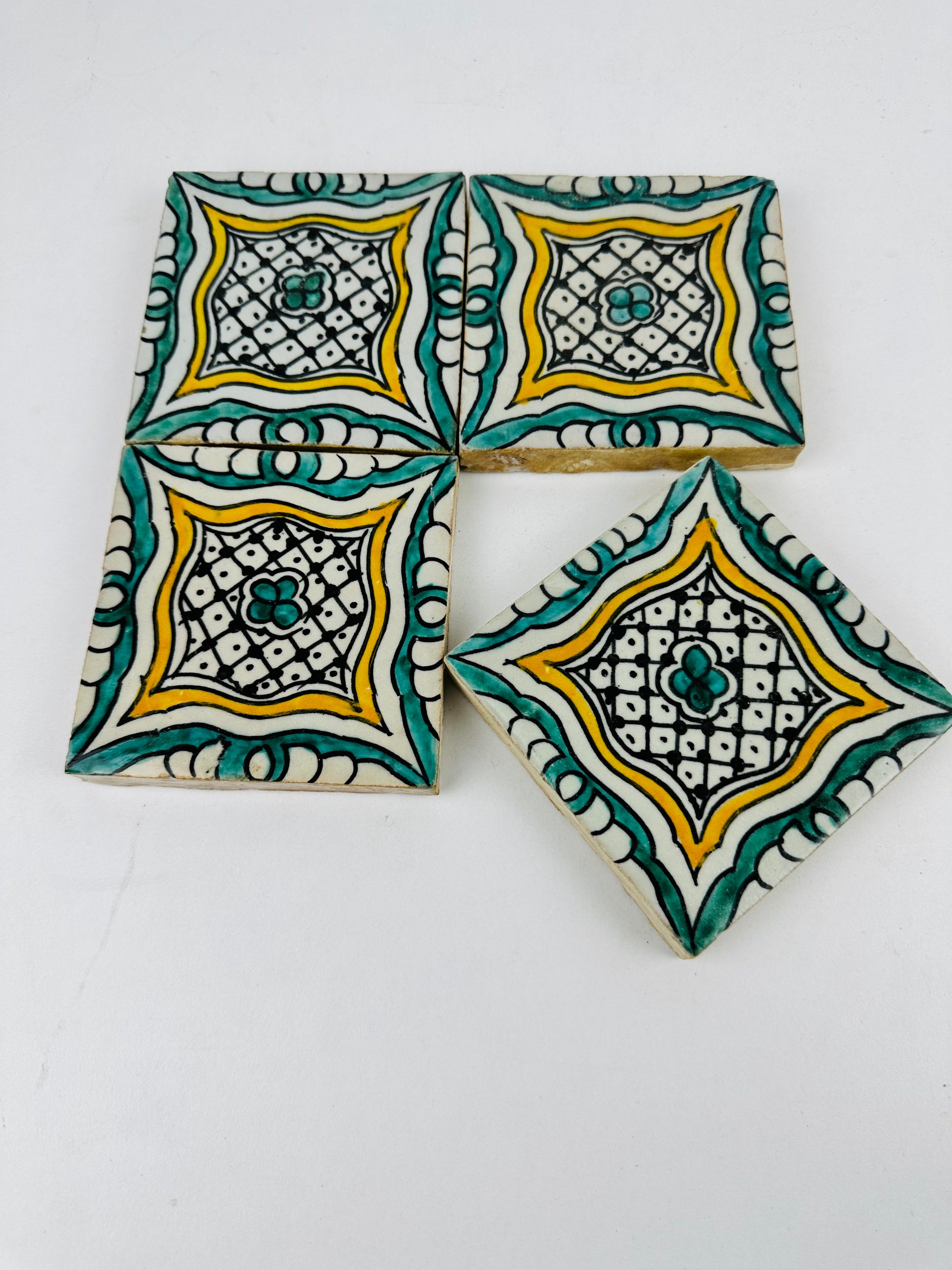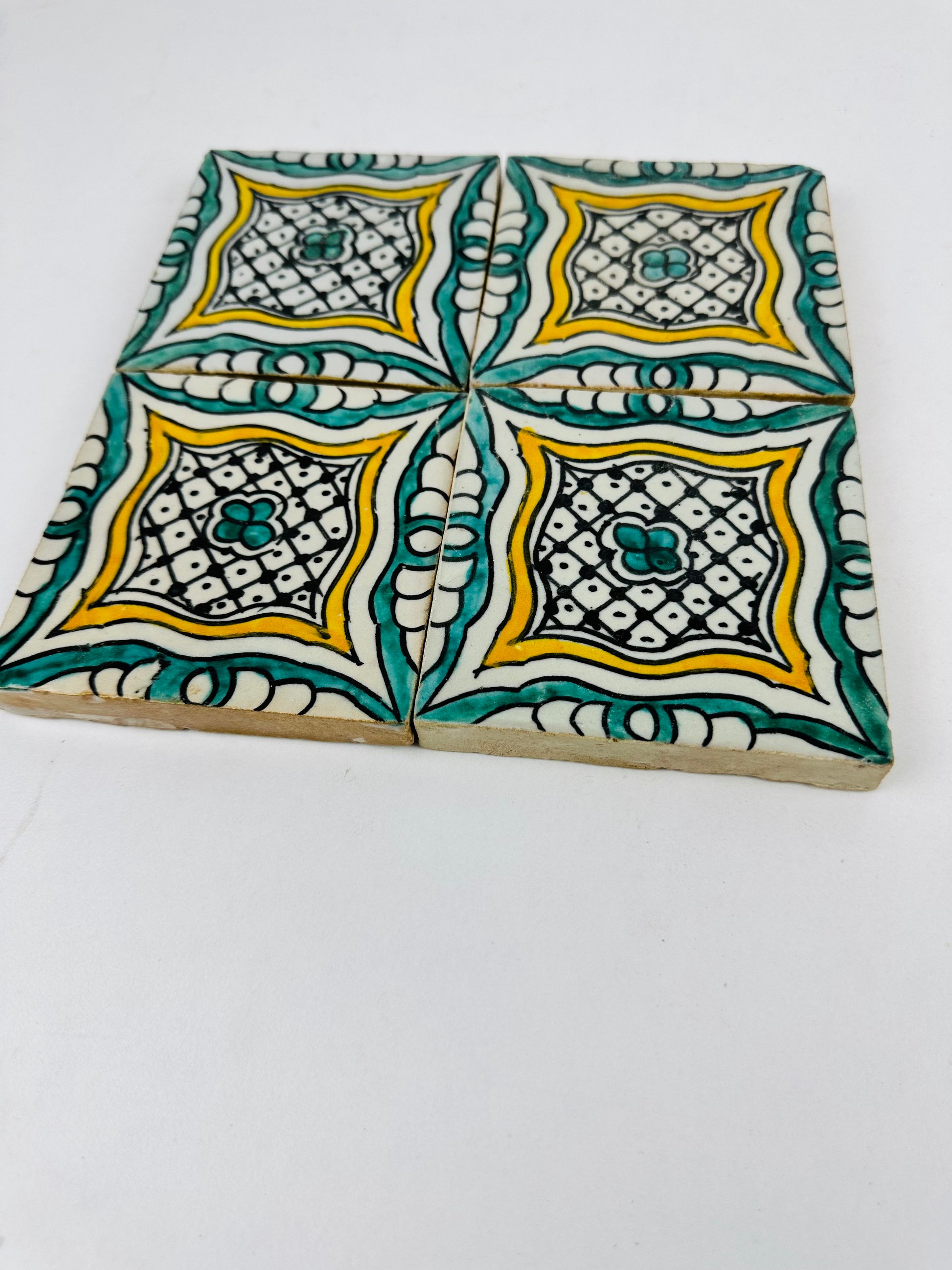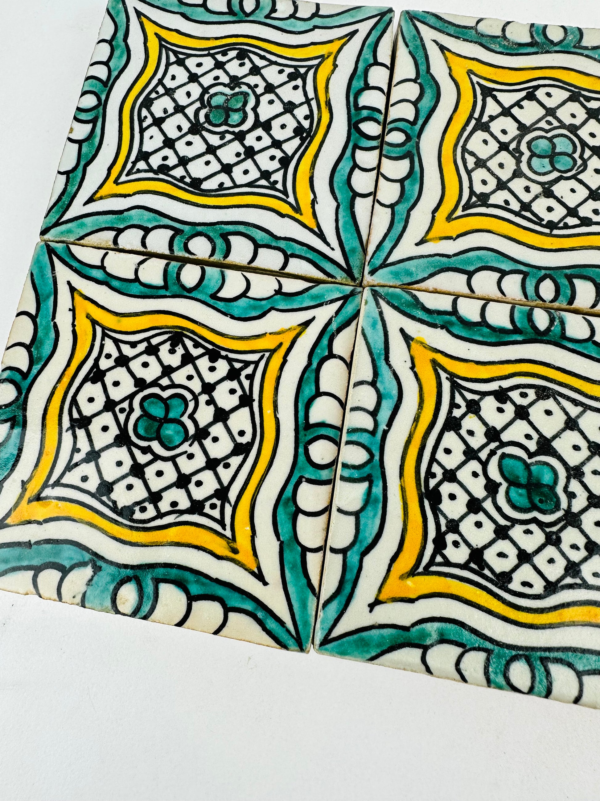 The Golden Harmony Moroccan Zellige Tiles feature an intricate geometric lattice design, blending rich teal, warm gold, and deep black accents on a creamy white backdrop. The delicate hand-painted details give these tiles a regal and timeless aesthetic, making them the perfect addition to any interior or exterior space. Each tile is handmade and hand-painted by skilled Moroccan artisans, ensuring authenticity and uniqueness in every piece.