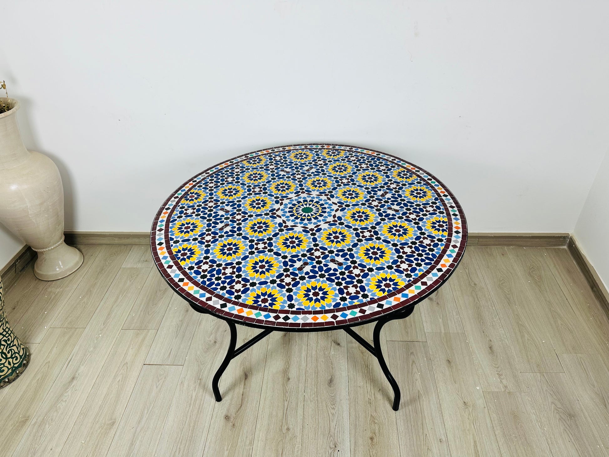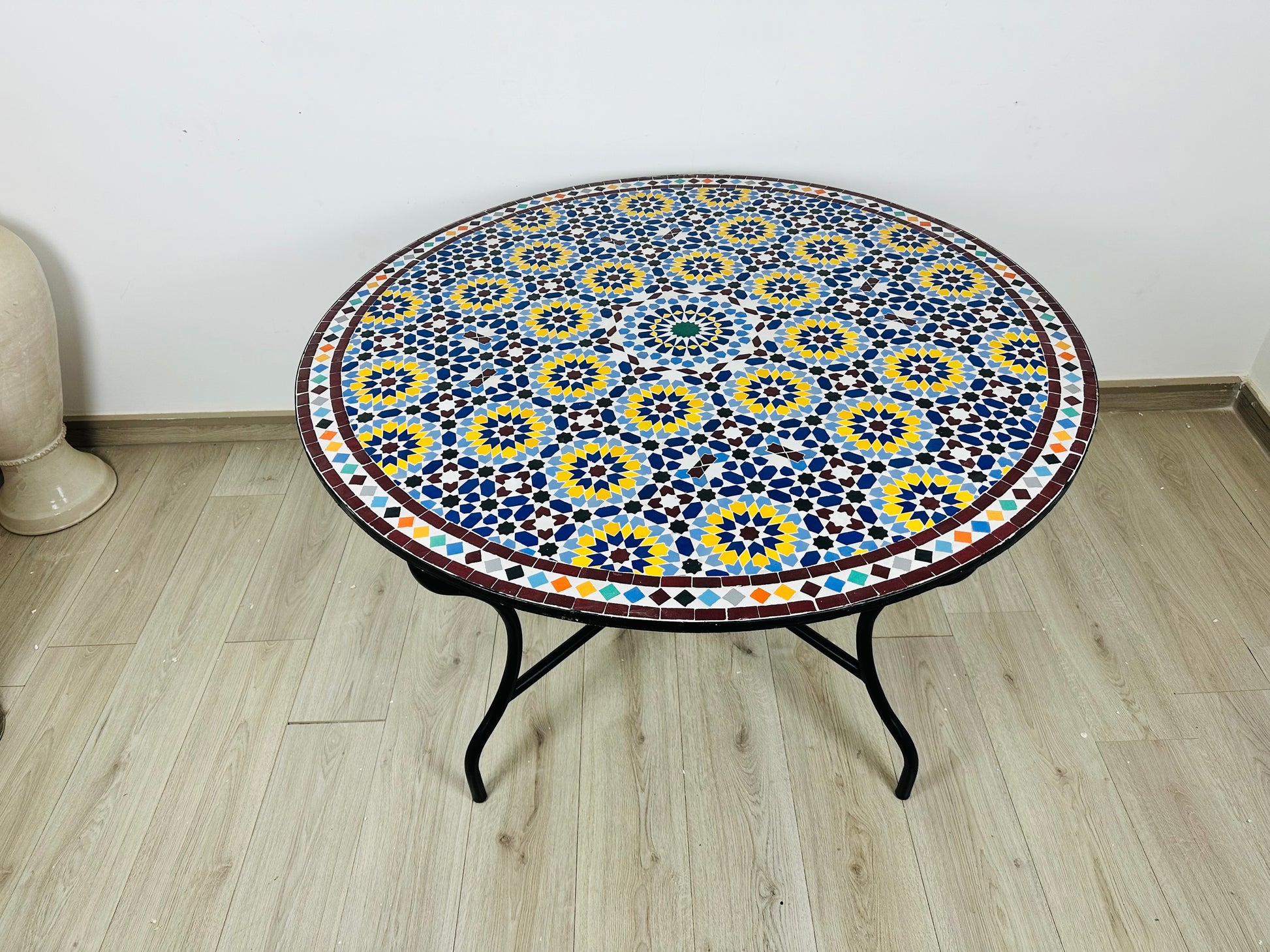 ✔ Materials: Handcrafted mosaic tiles, cement base, wrought iron frame