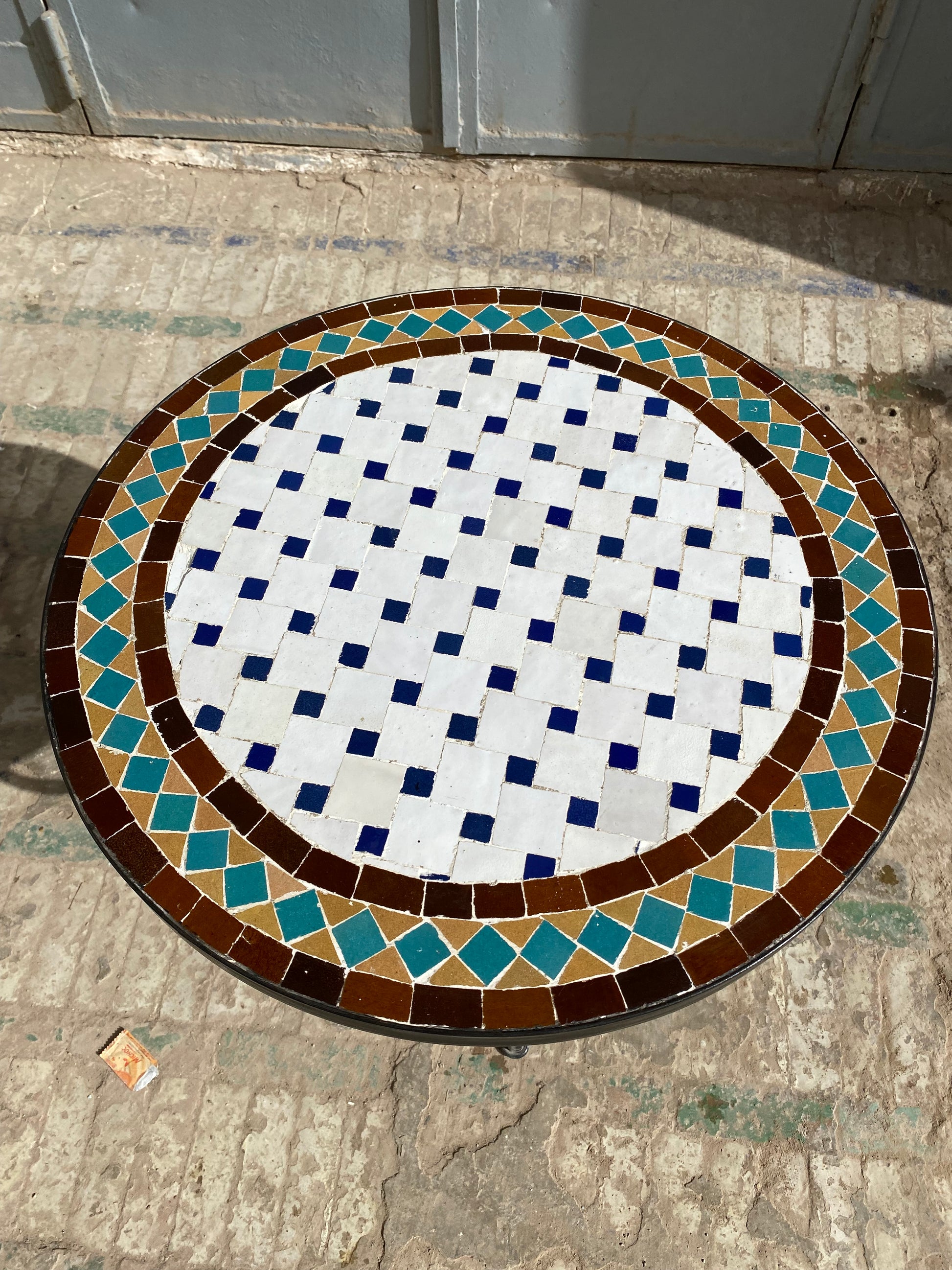 A timeless piece inspired by traditional Moroccan craftsmanship, this Classic White & Blue Mosaic Table features an elegant white-tiled surface accentuated with small, deep-blue mosaic details. The intricate border blends warm brown, turquoise, and beige tiles, creating a harmonious contrast that enhances its visual appeal.