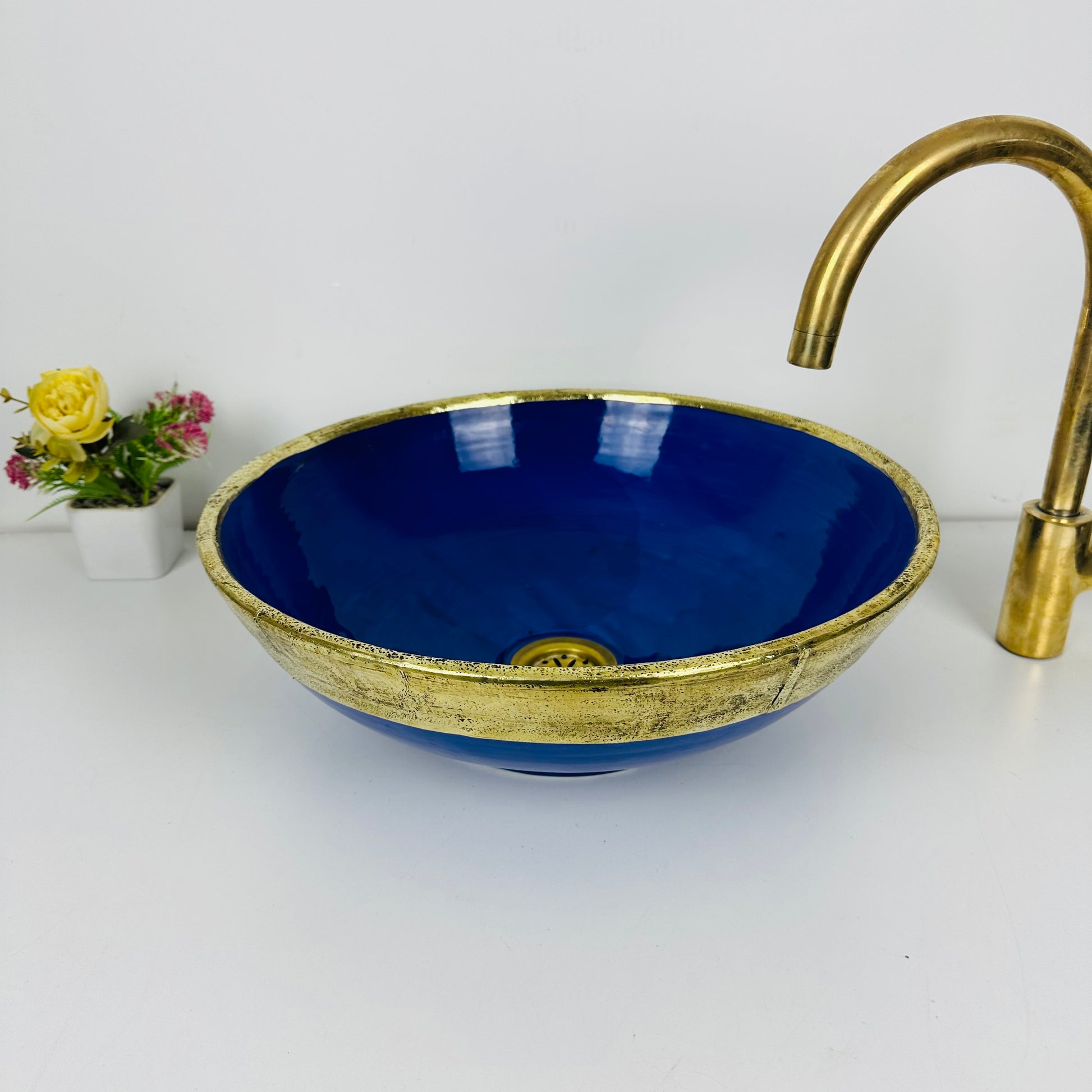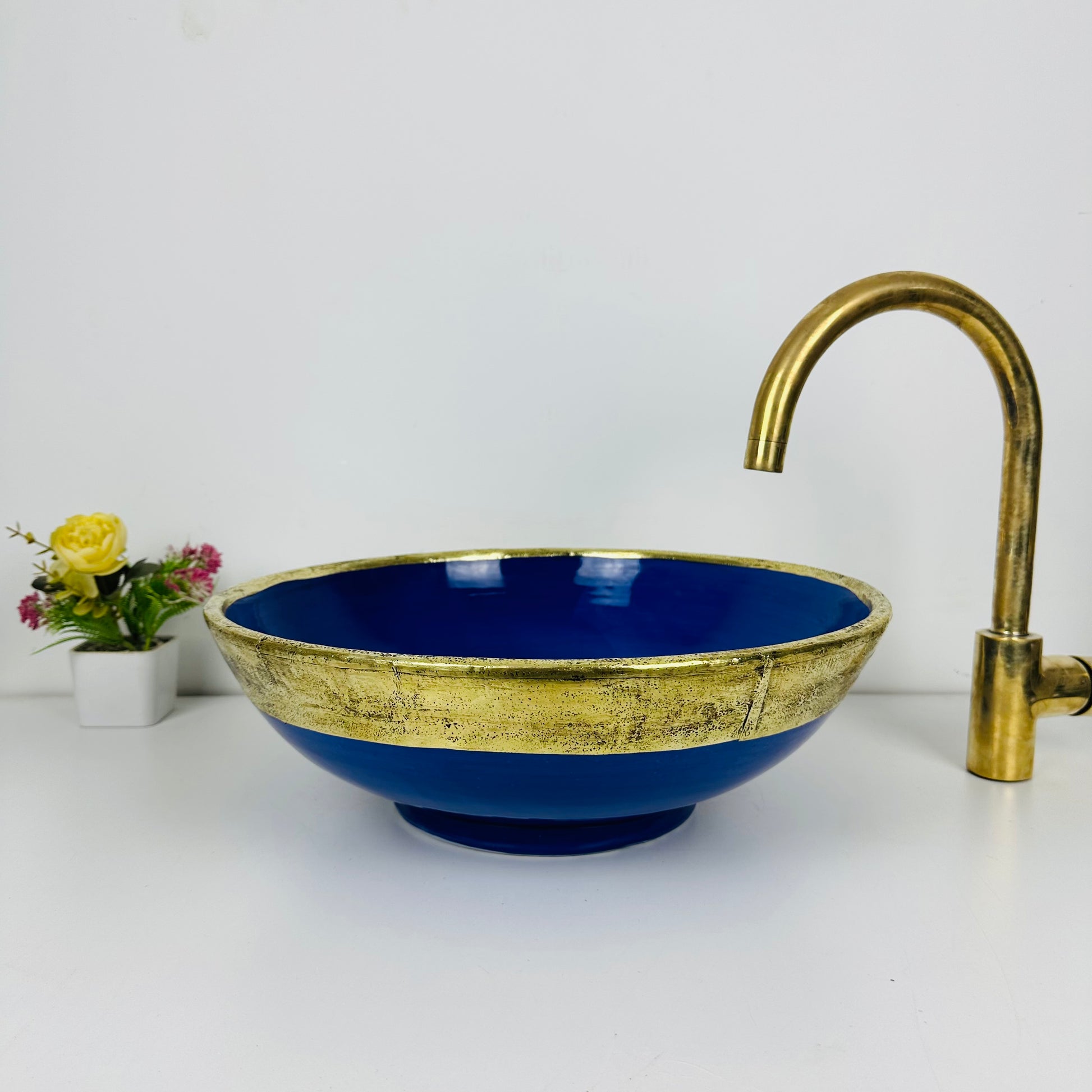 Sapphire Majesty: Handcrafted Ceramic Sink with Dark Blue and Gold Brass Accent