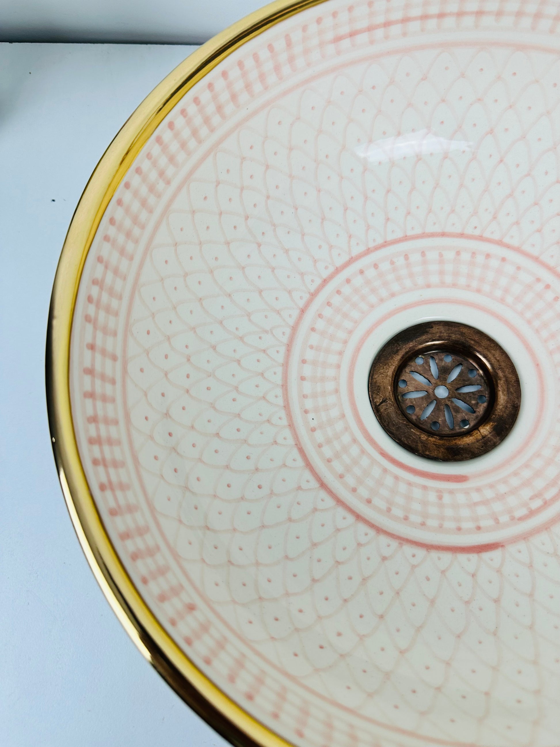 Add a touch of subtle elegance to your bathroom with this beautifully hand-painted pink ceramic vessel sink. Its delicate pattern, complemented by a brass rim, creates a luxurious blend of softness and sophistication, making it ideal for both contemporary and classic spaces.