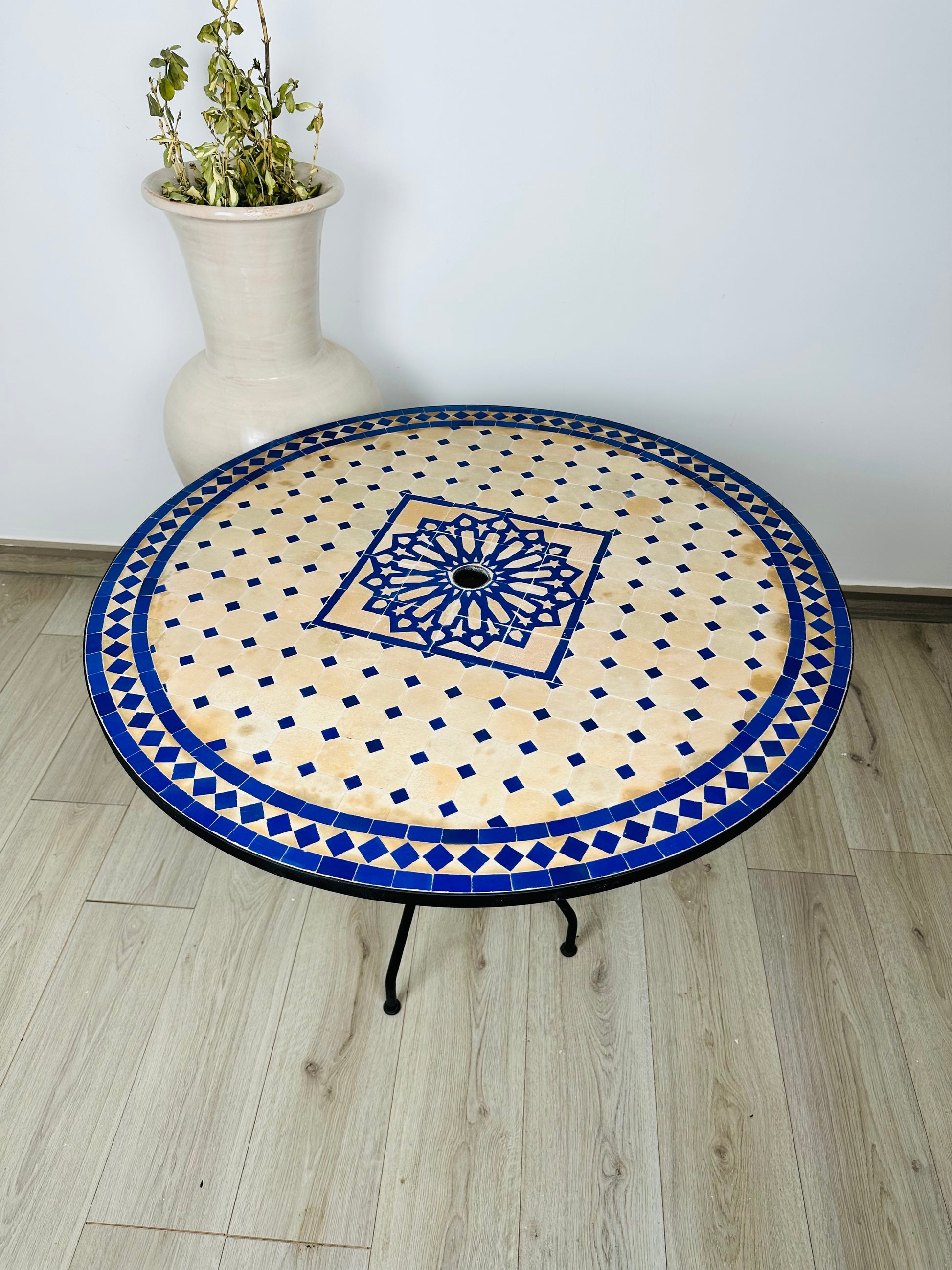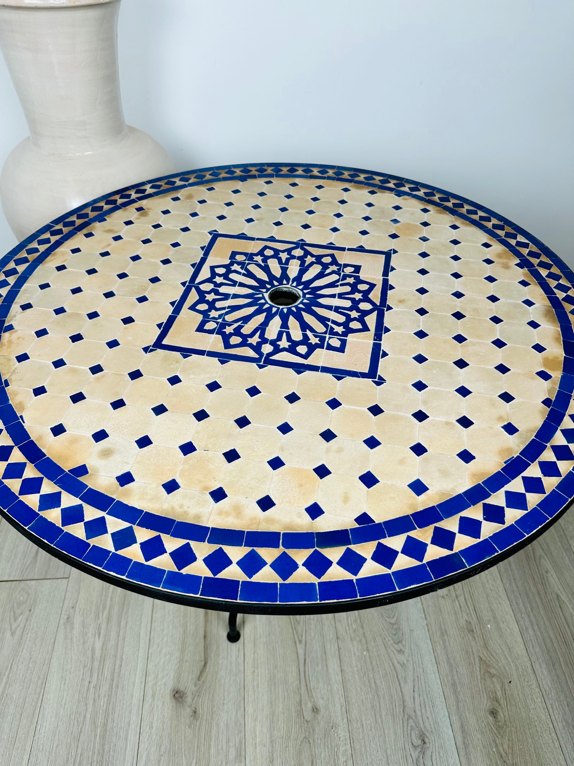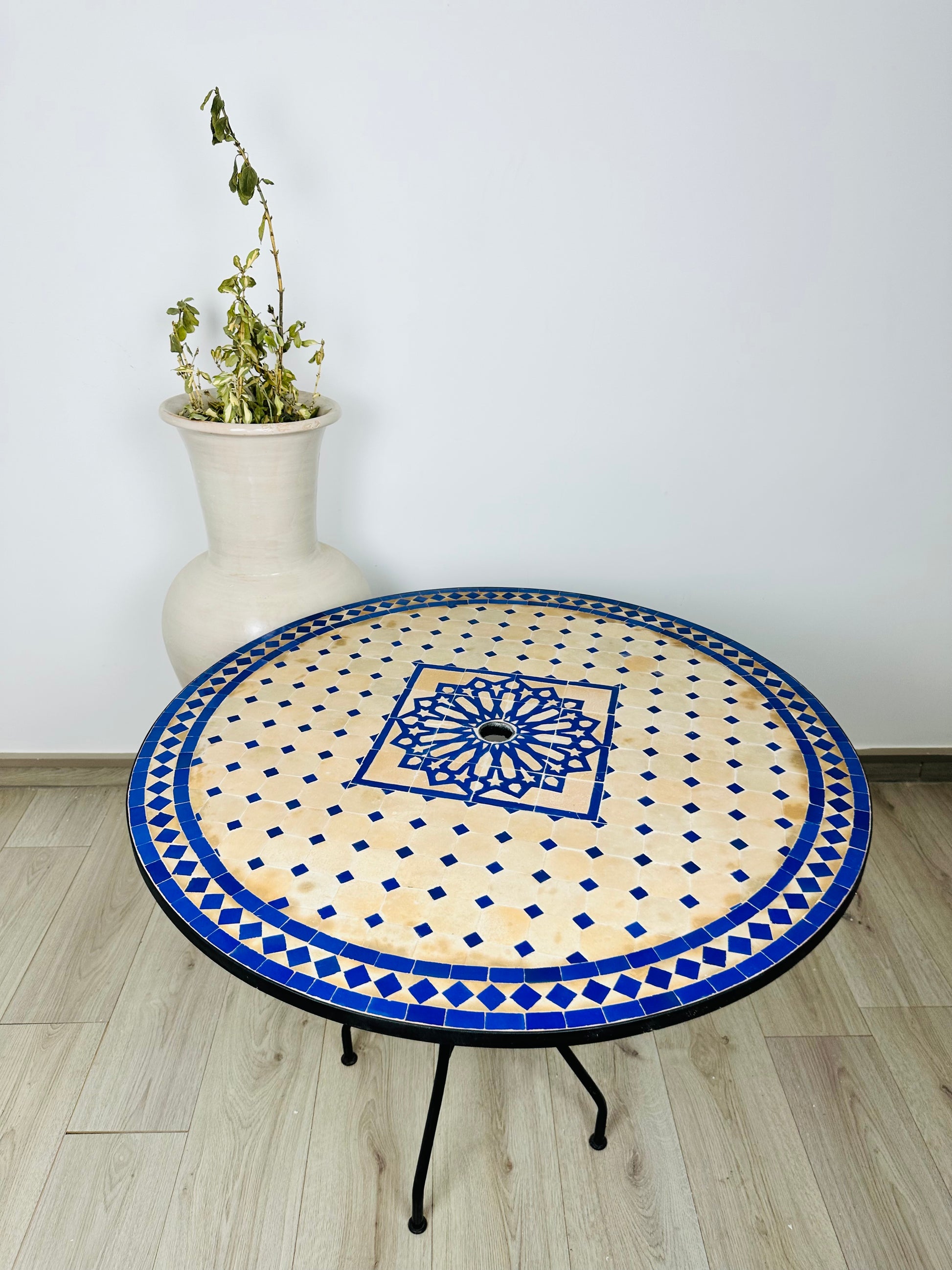 Elegant Raw Clay Beige & Blue Mosaic Table with Umbrella Hole