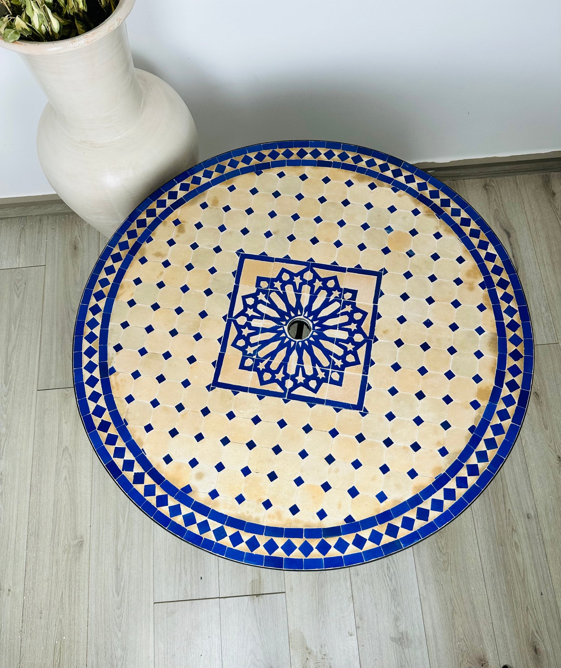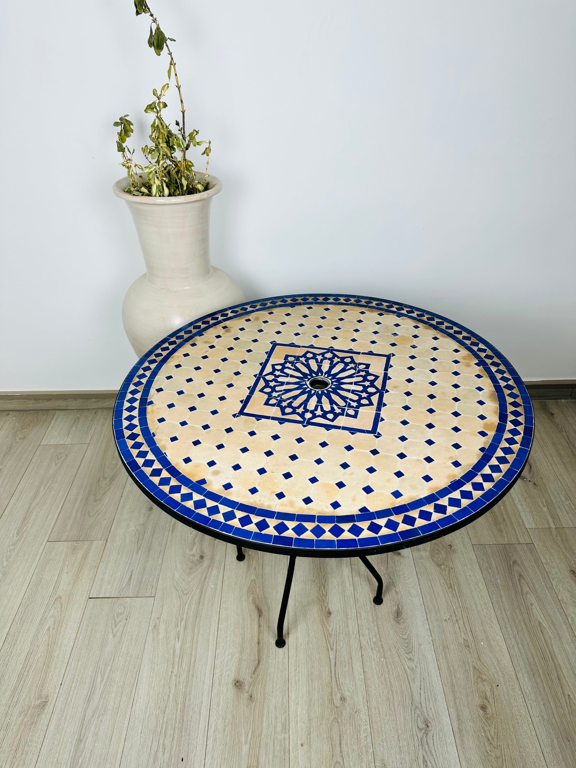 This beautifully handcrafted mosaic table features a timeless beige backdrop adorned with deep blue geometric accents. The intricate central motif adds a touch of sophistication, making it a striking centerpiece for any outdoor or indoor space. Designed with a convenient umbrella hole, it’s perfect for shaded gatherings on your patio, garden, or terrace.